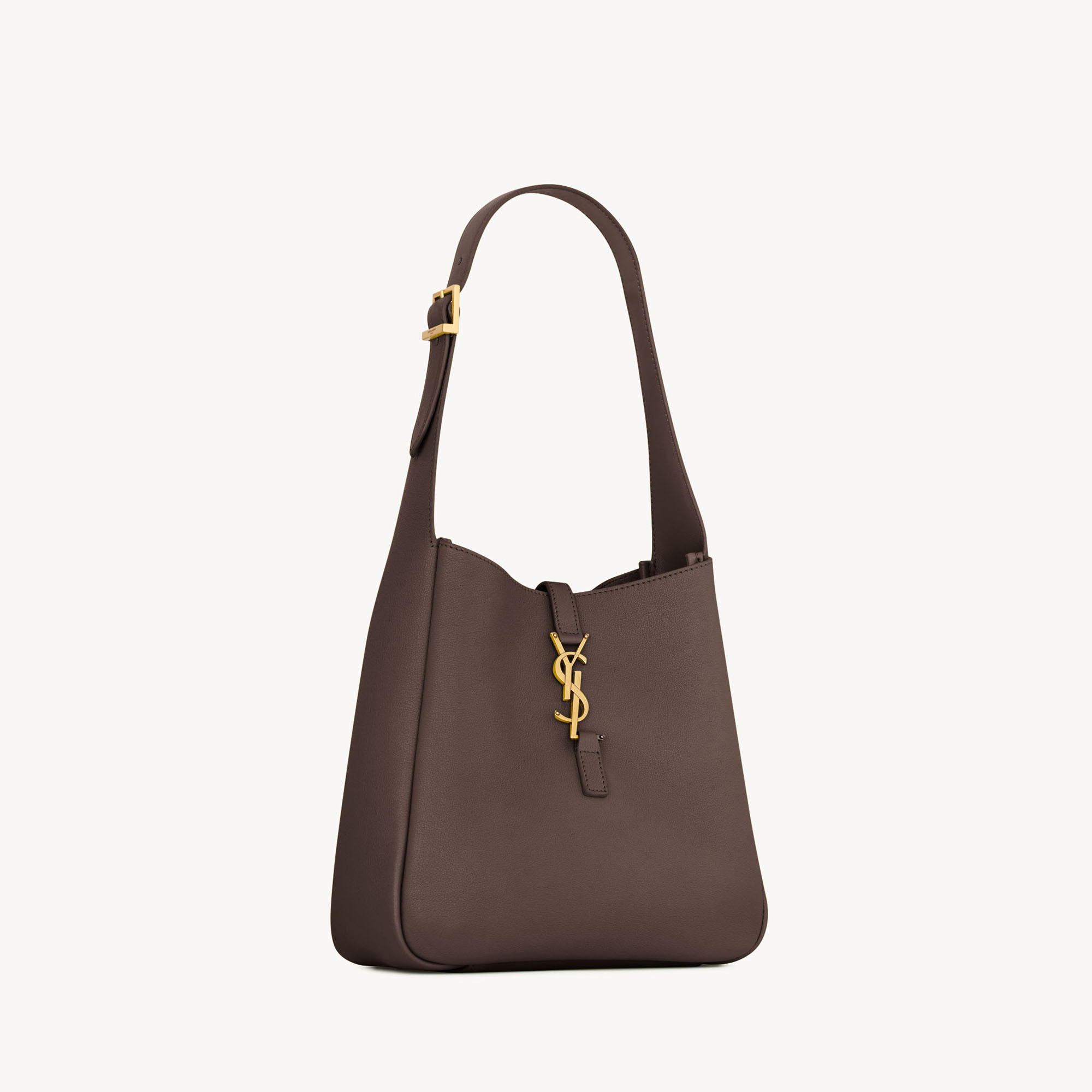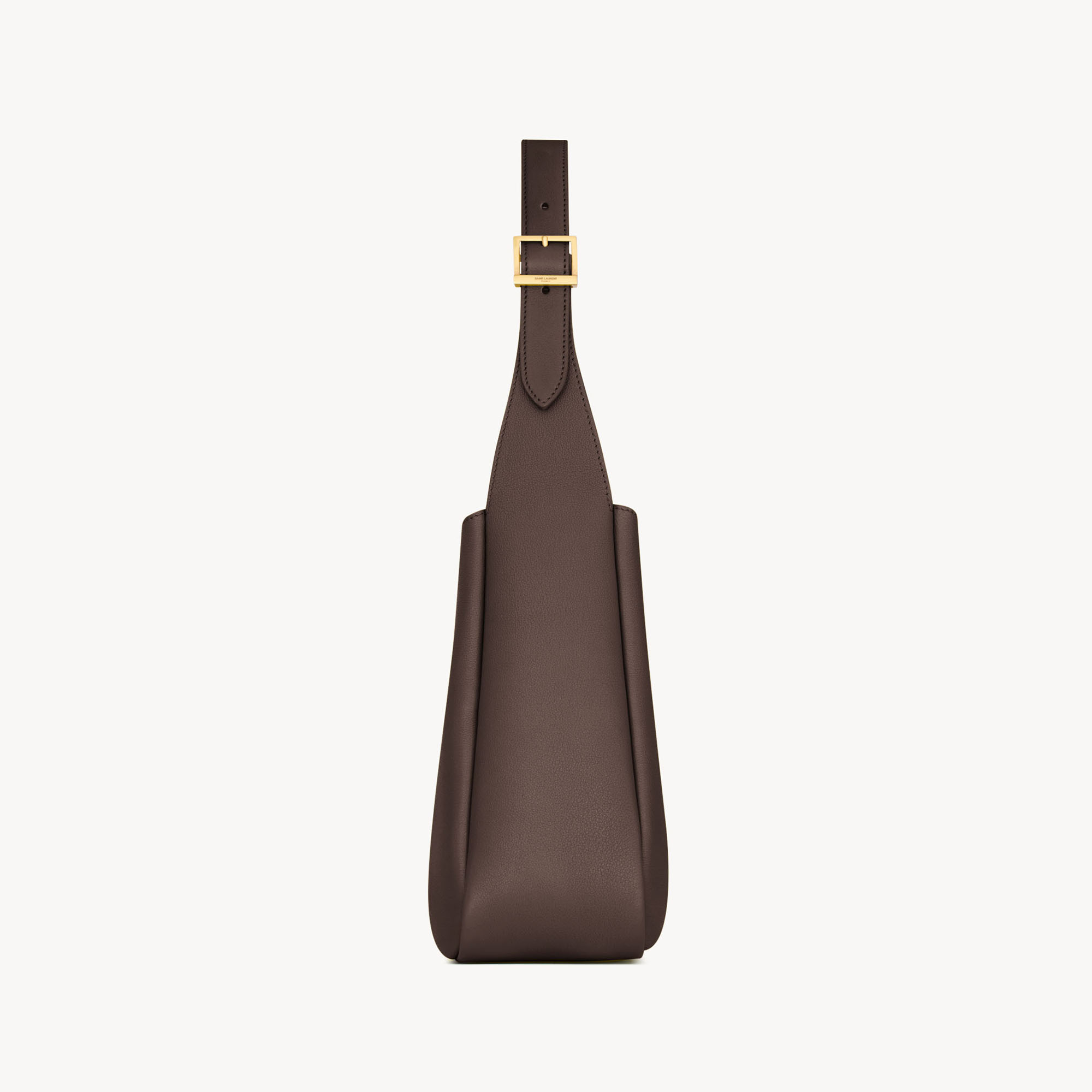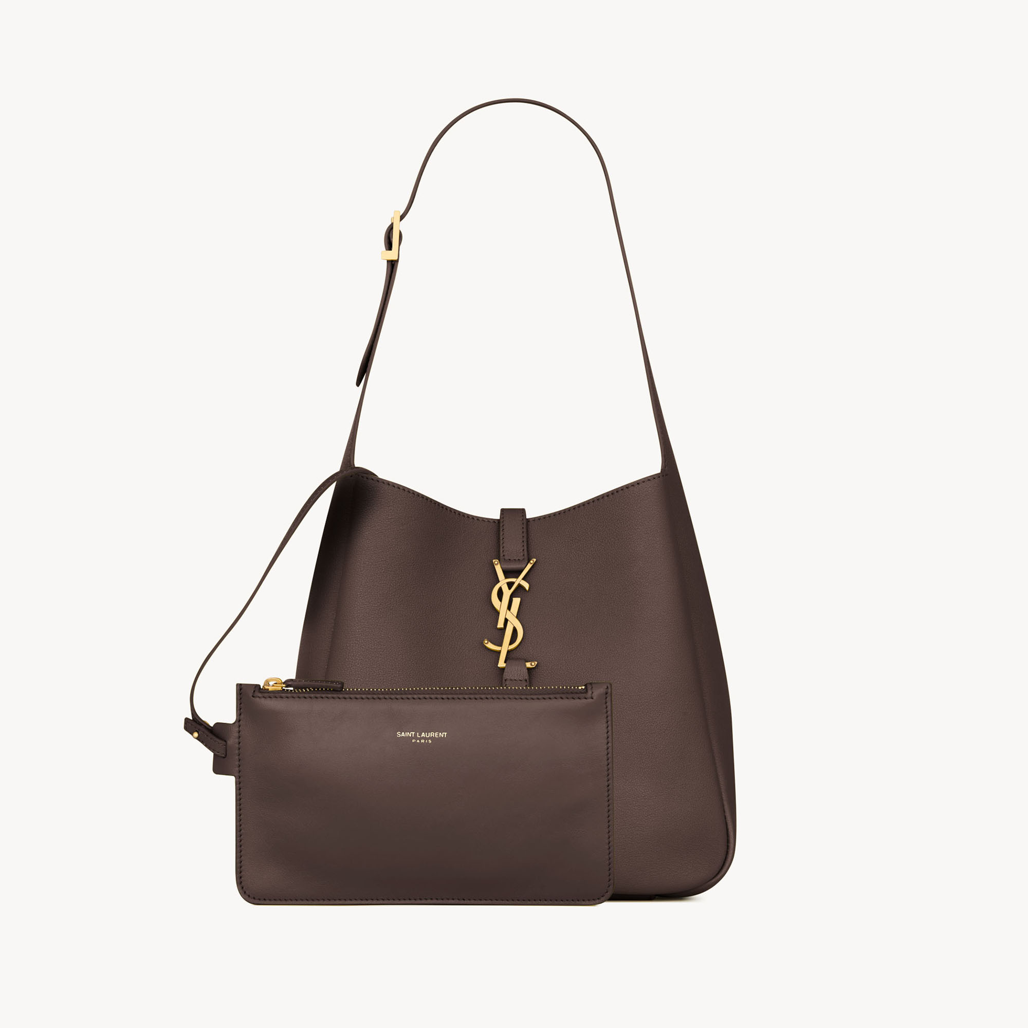 • Finely grained leather, removable zip pouch, open-top with leather tab closure and Cassandre logo, adjustable strap, bronze-tone hardware