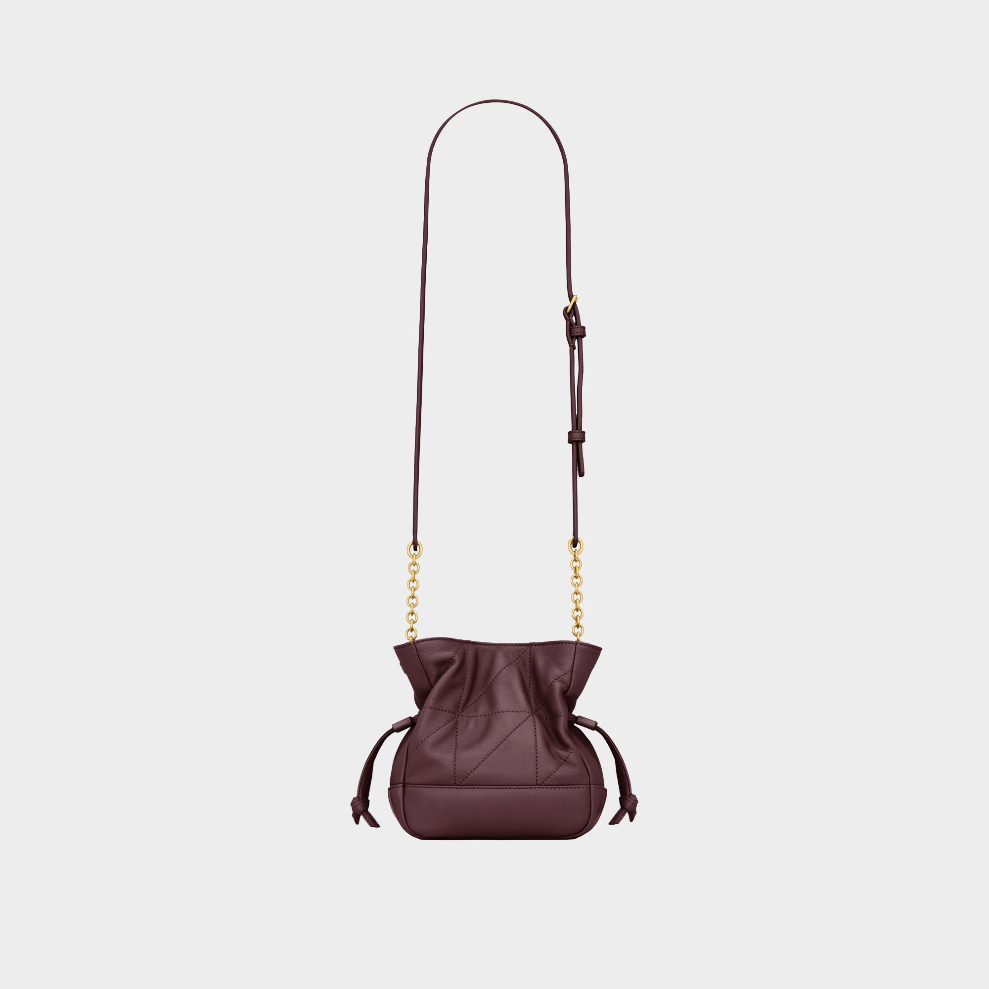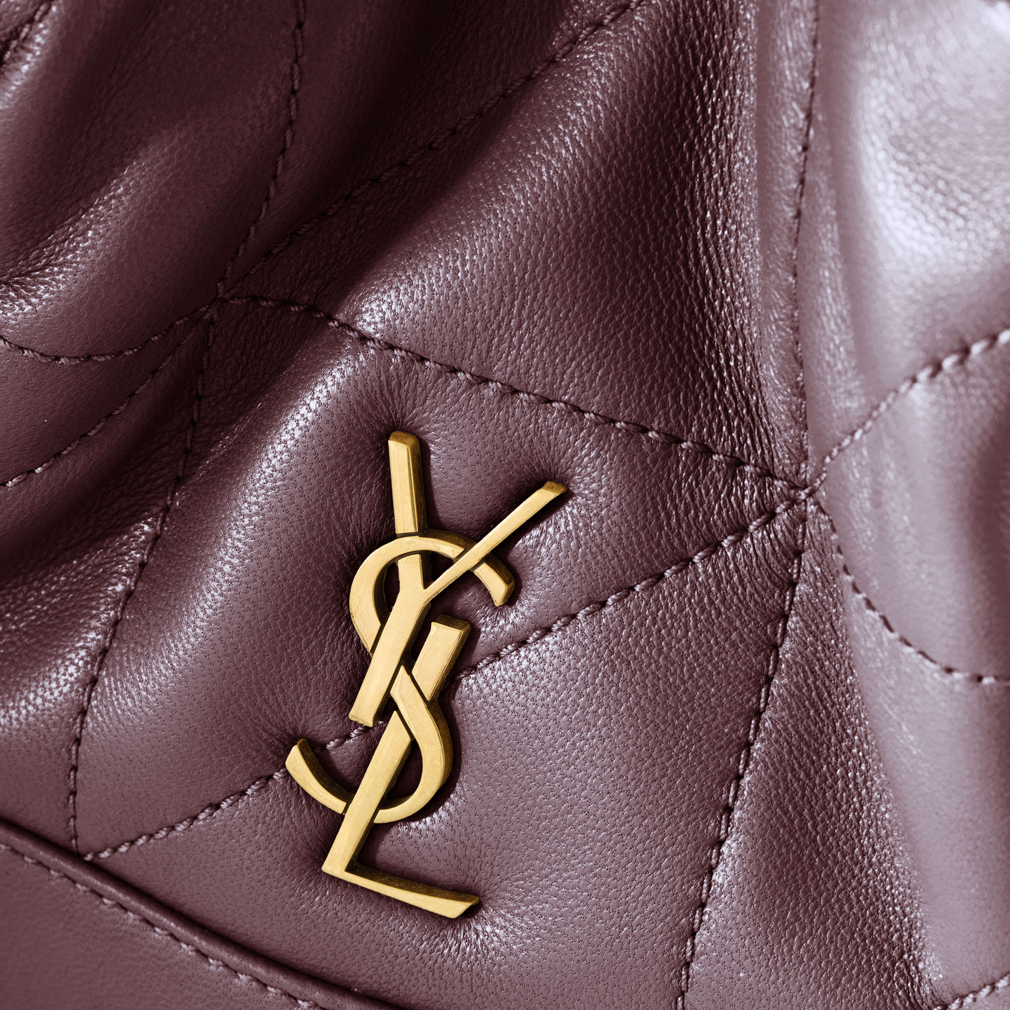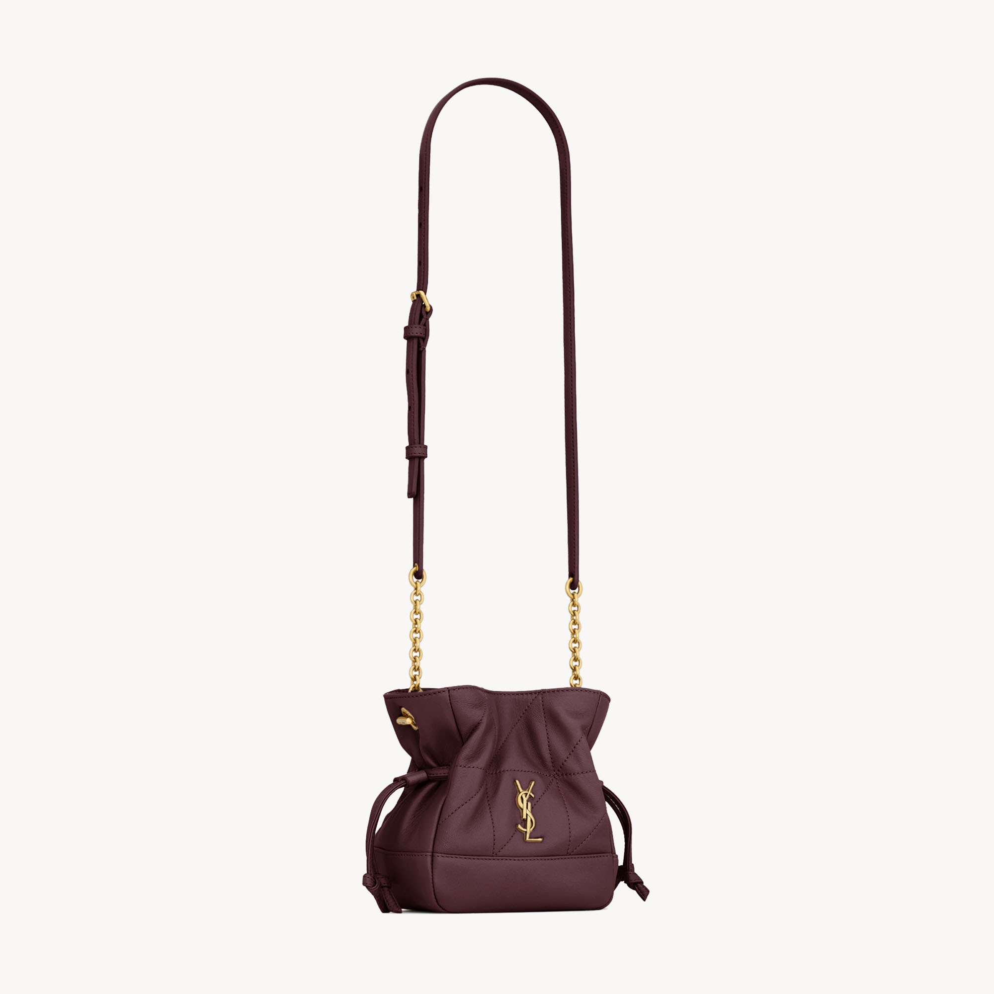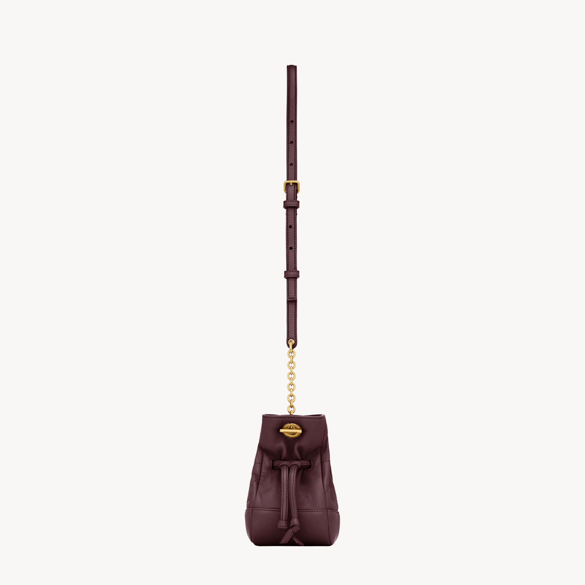 - Mini size, supple lambskin, leather-and-chain strap, drawstring adjustable sides, bronze-tone hardware, Cassandre logo, Carré Rive Gauche topstitching, snap-button closure