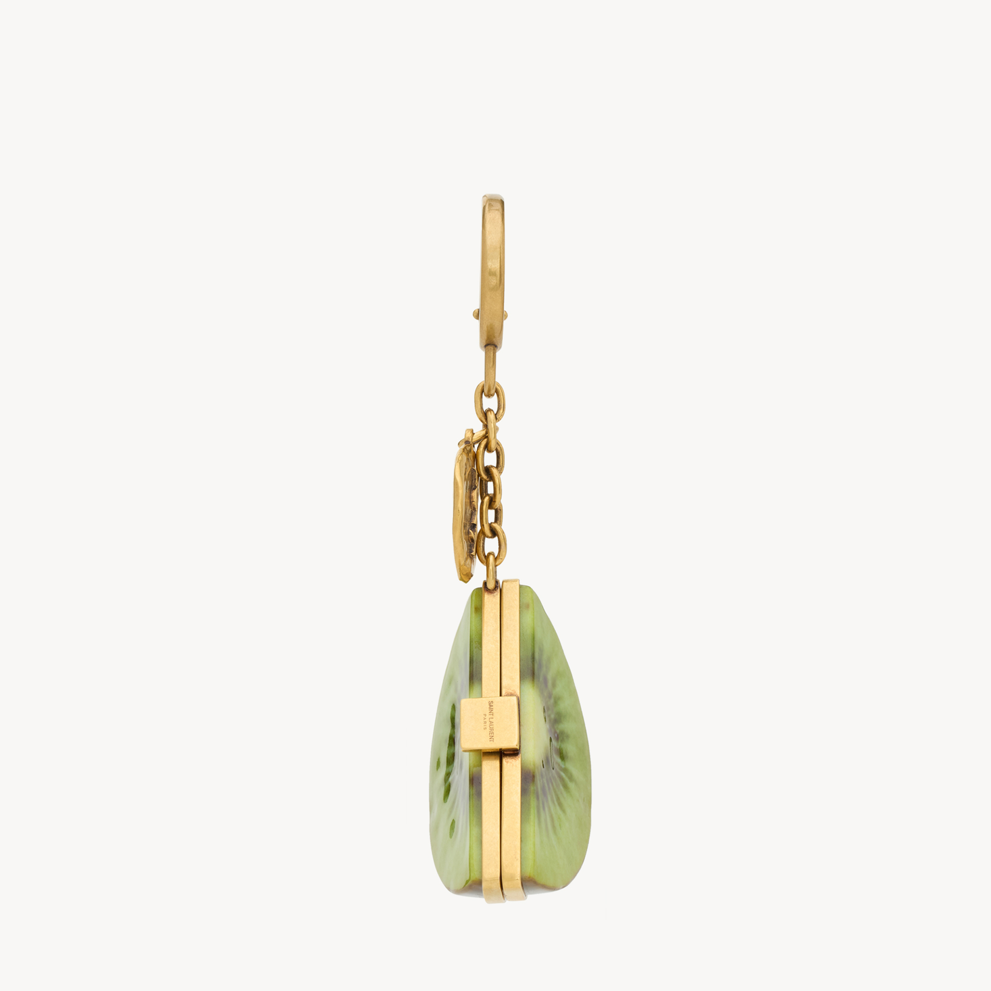- Kiwi wedge detail, Cassandre medallion, bronze-tone hardware, spring gate ring closure