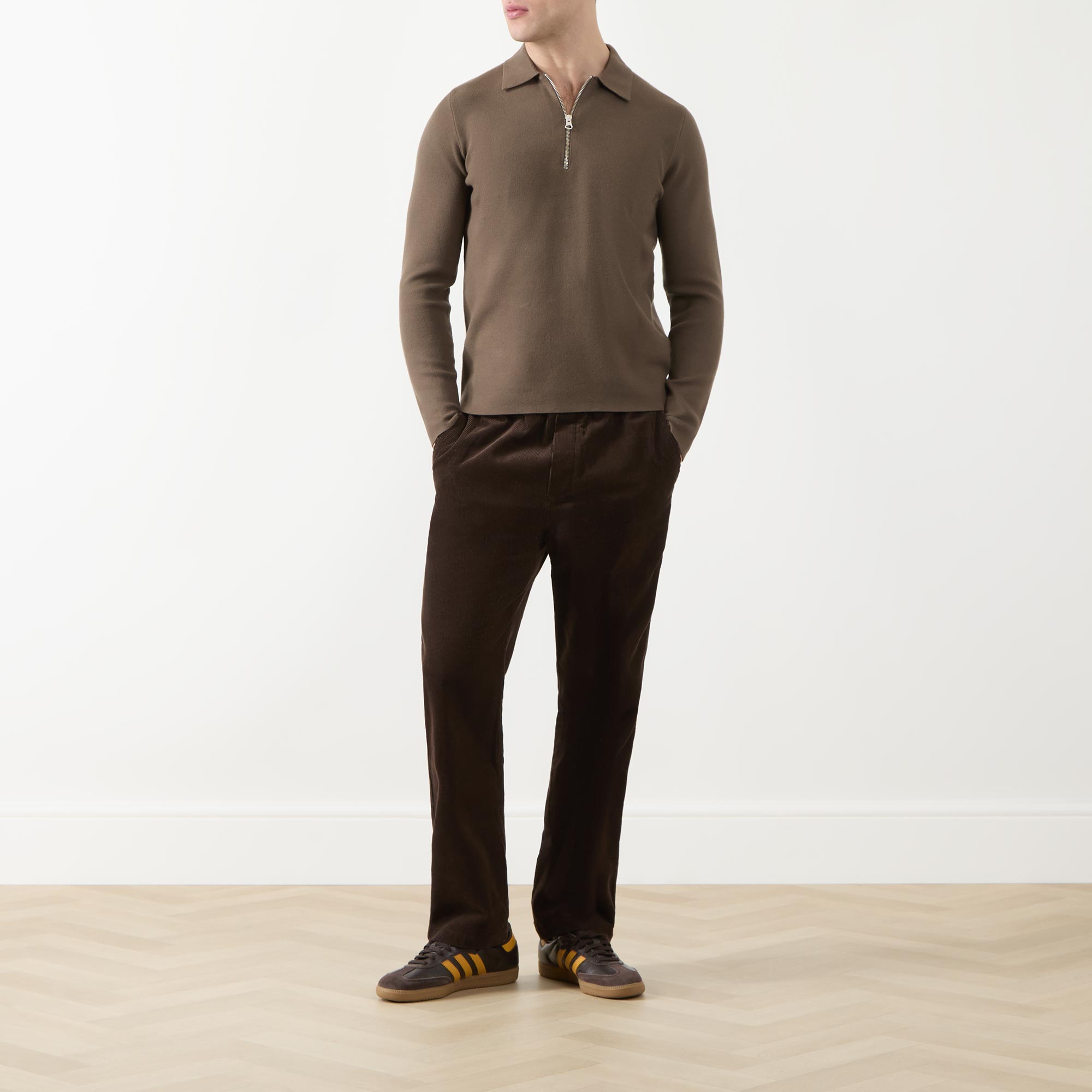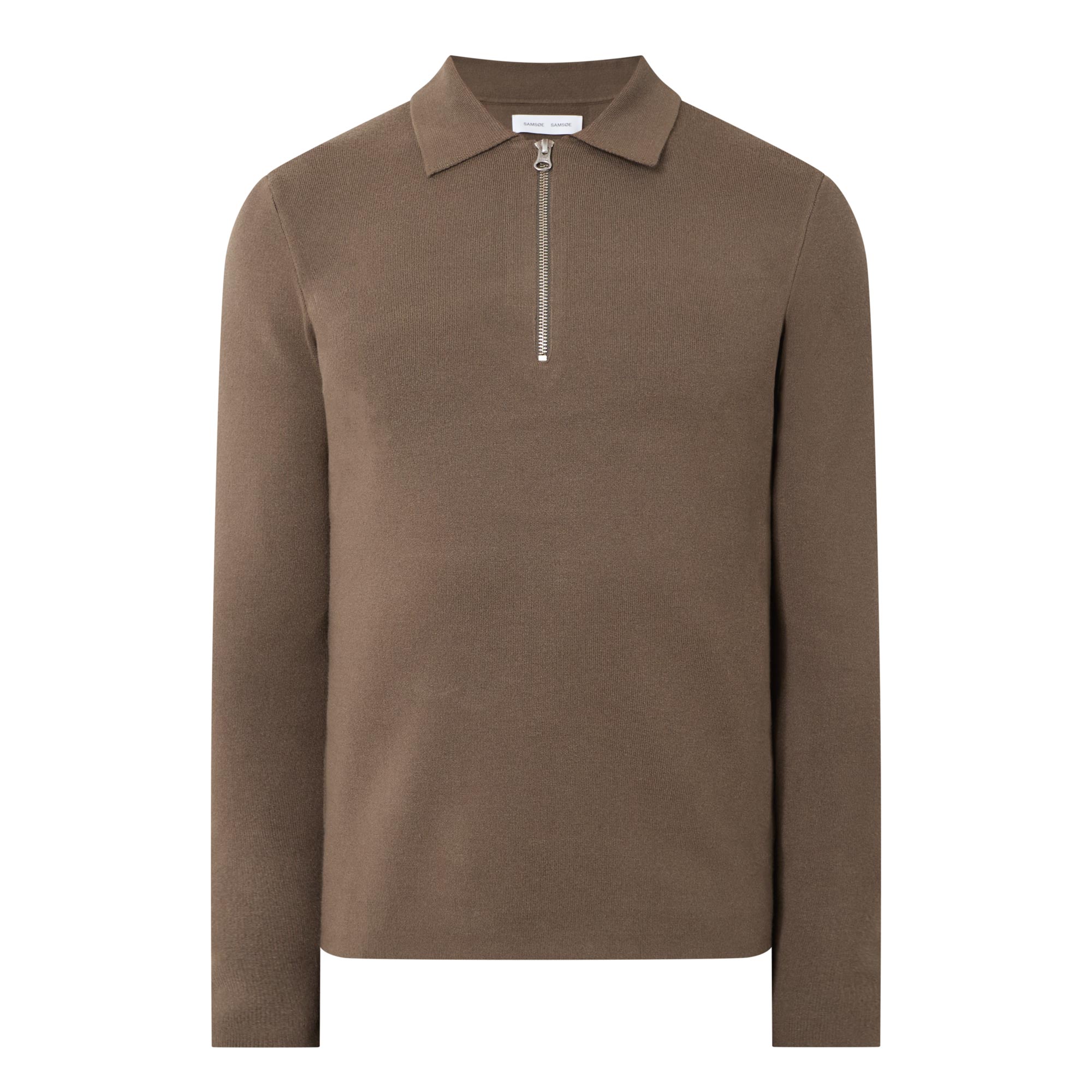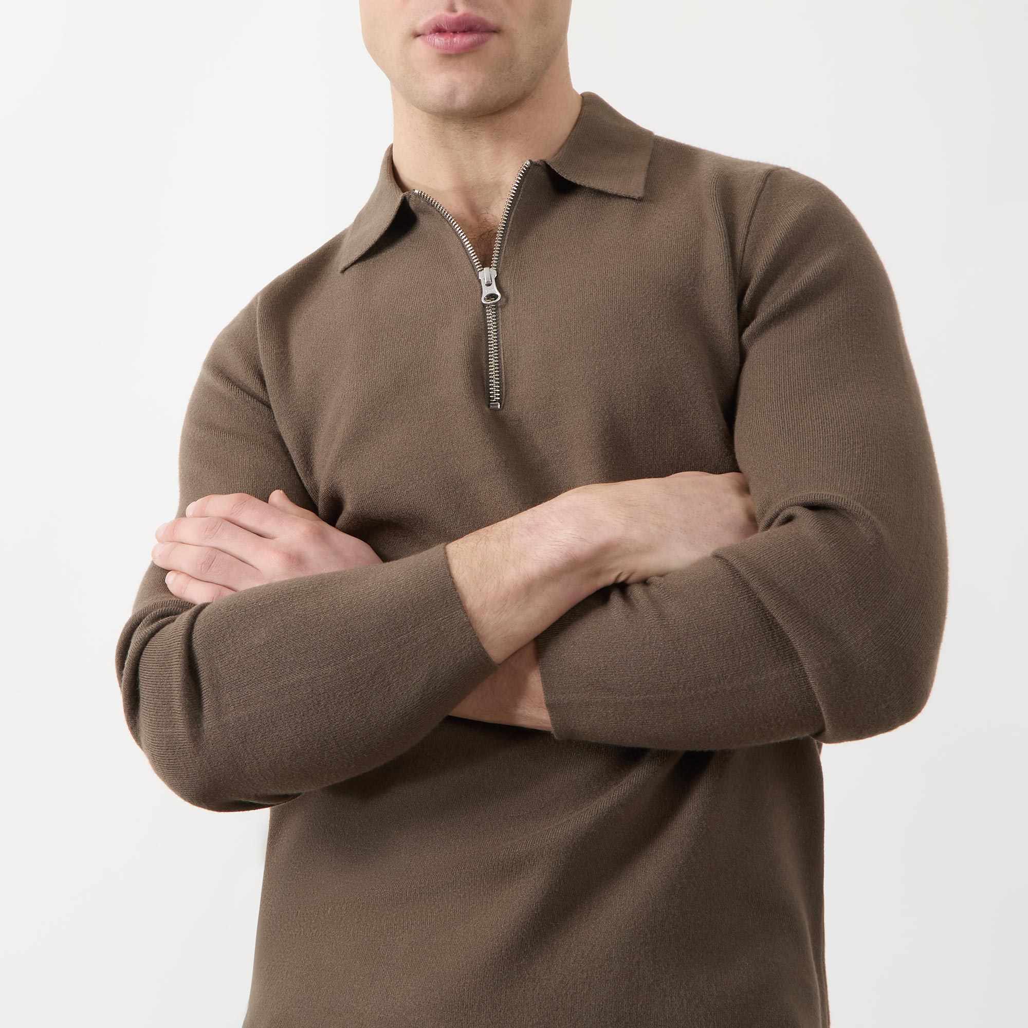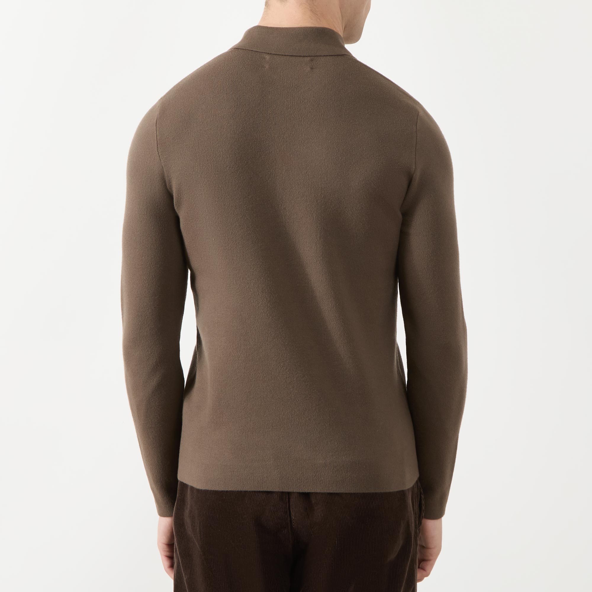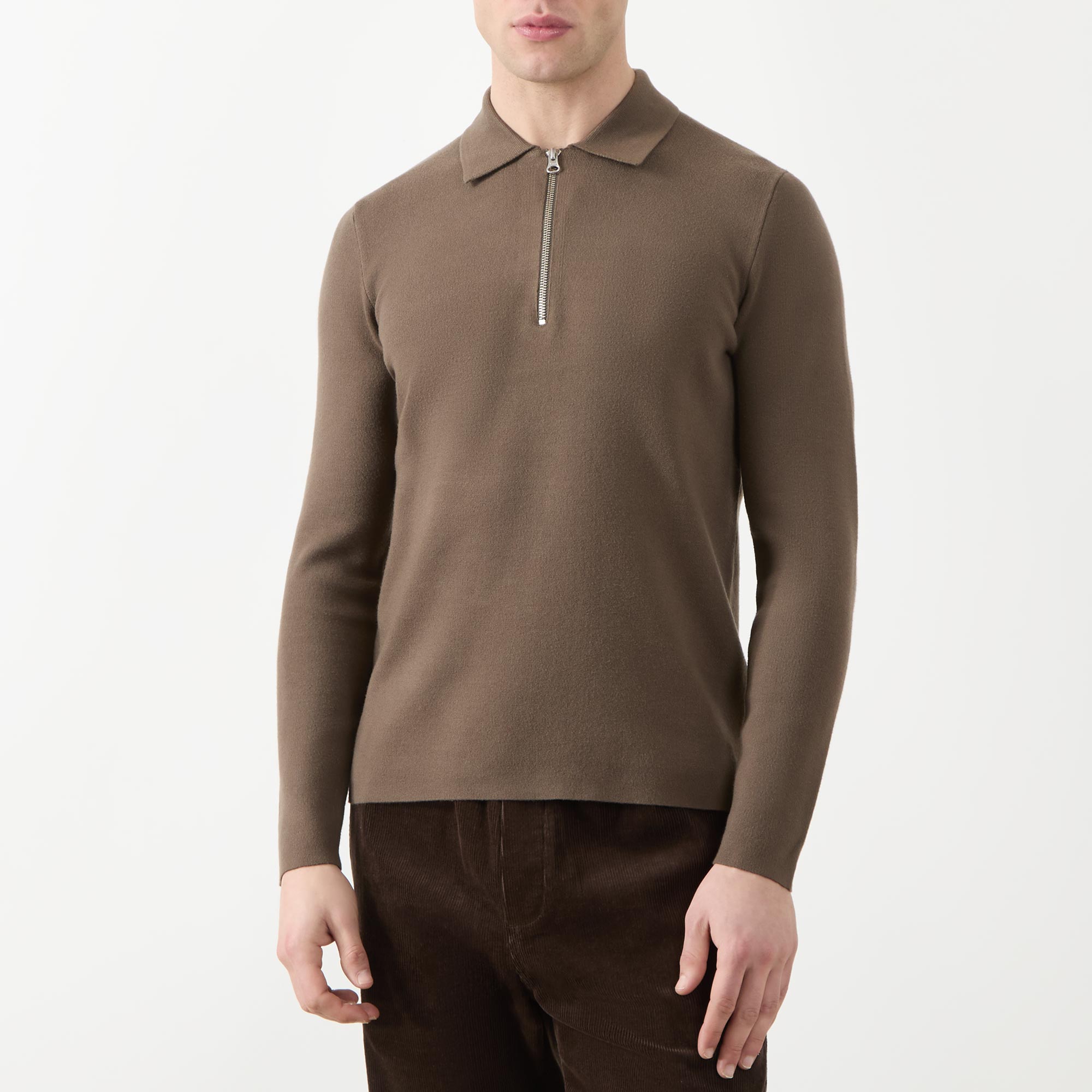 • Flat polo collar, long sleeves, half zip-fastening placket, fine-knit finish