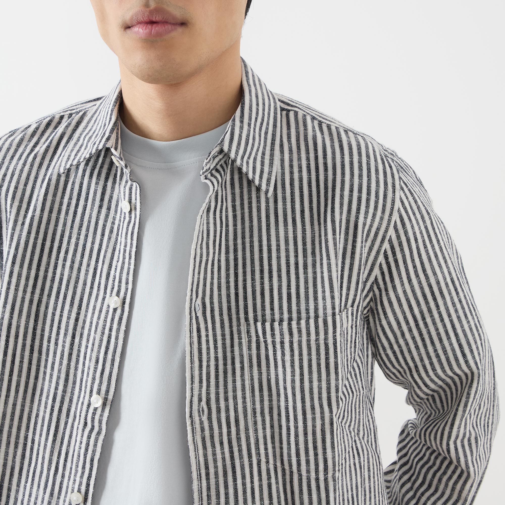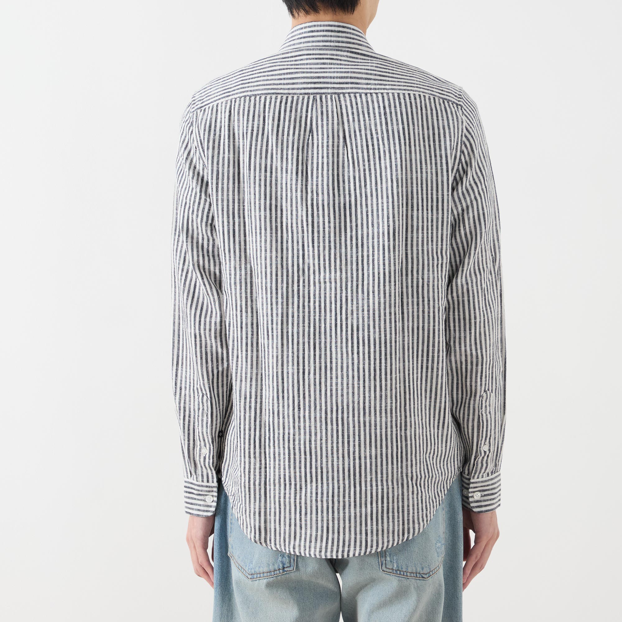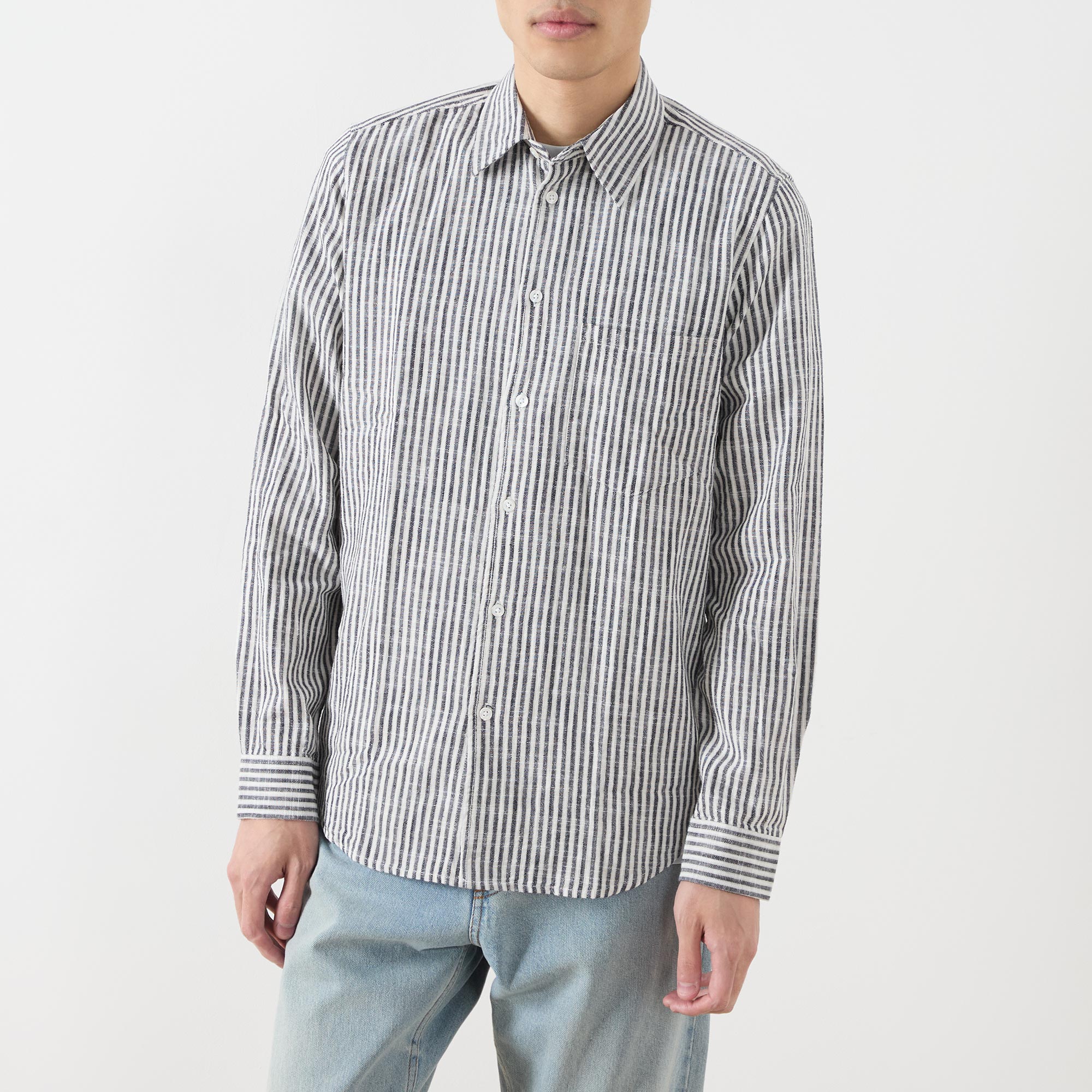 - Striped, print, long sleeves, button fastenings, curved hemline, pointed collar