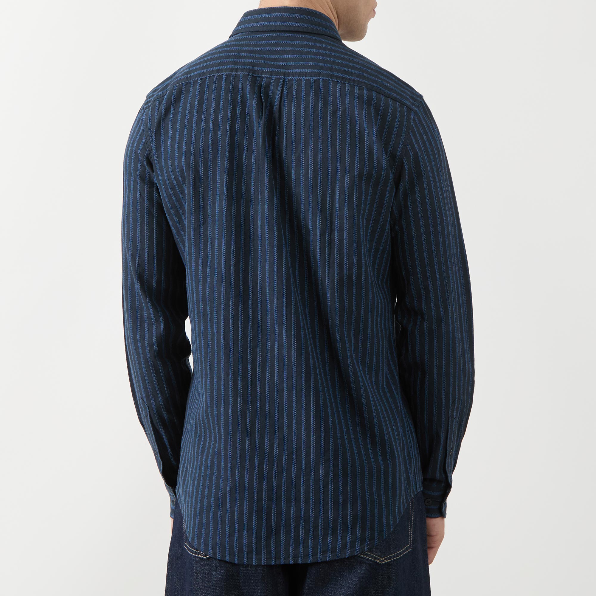 - Point collar, long sleeves, front button placket, striped pattern, single-button cuffs, tonal stitching, curved hemline, smooth fabric