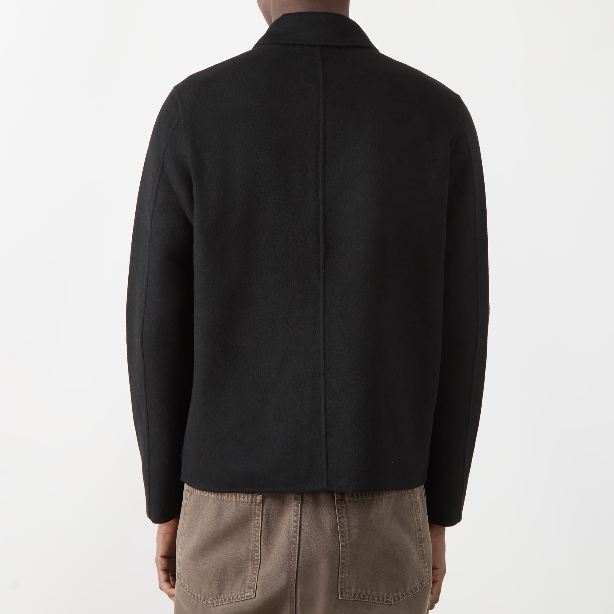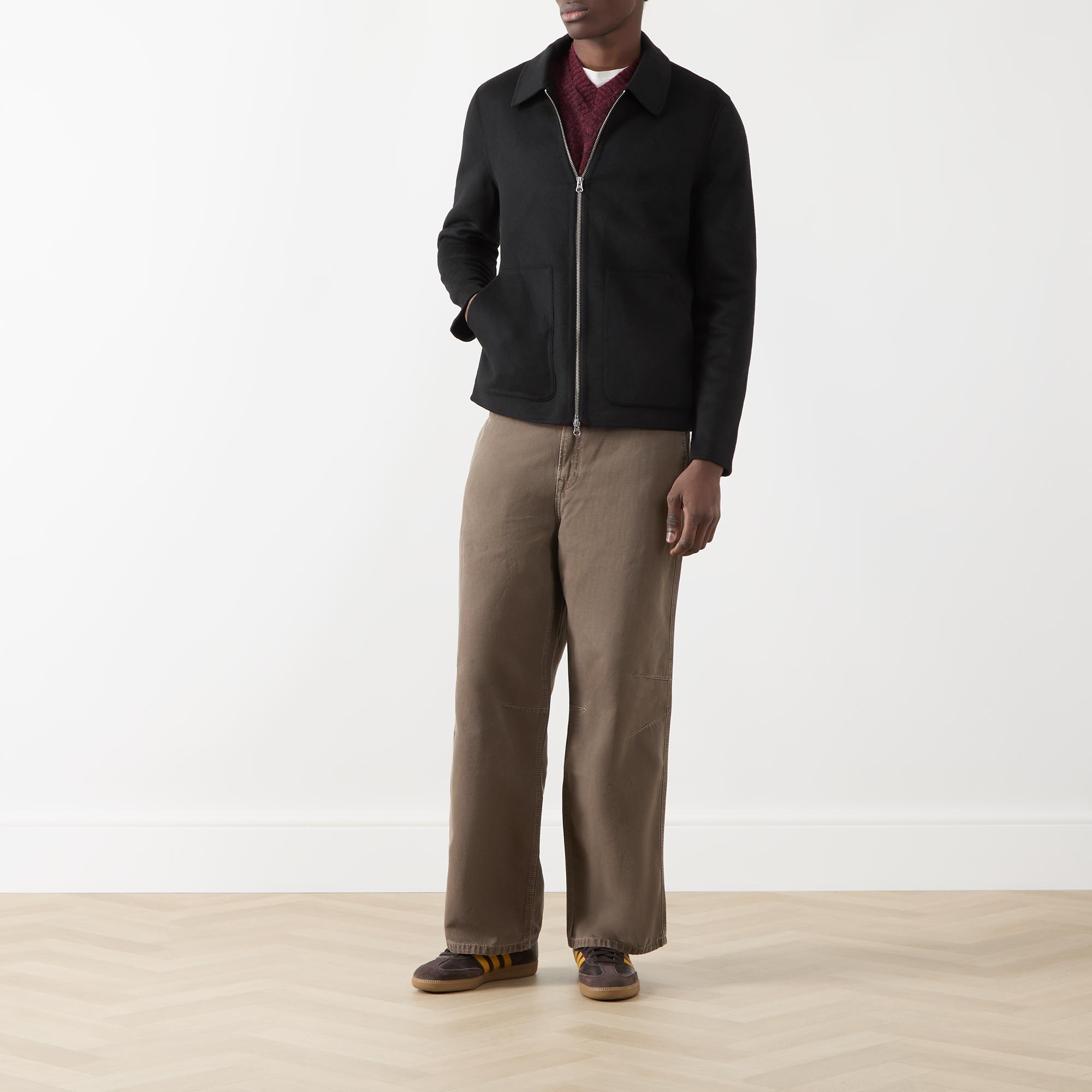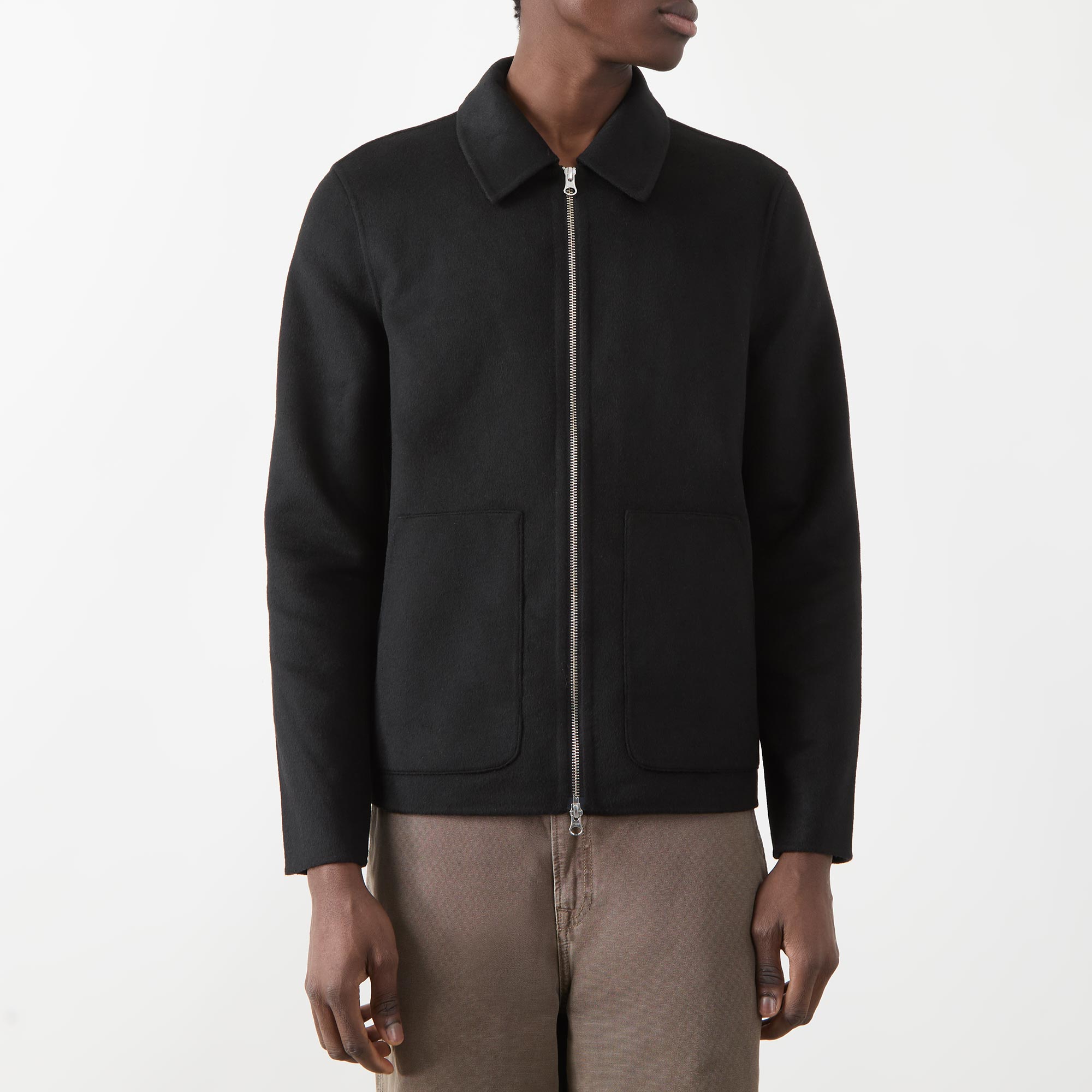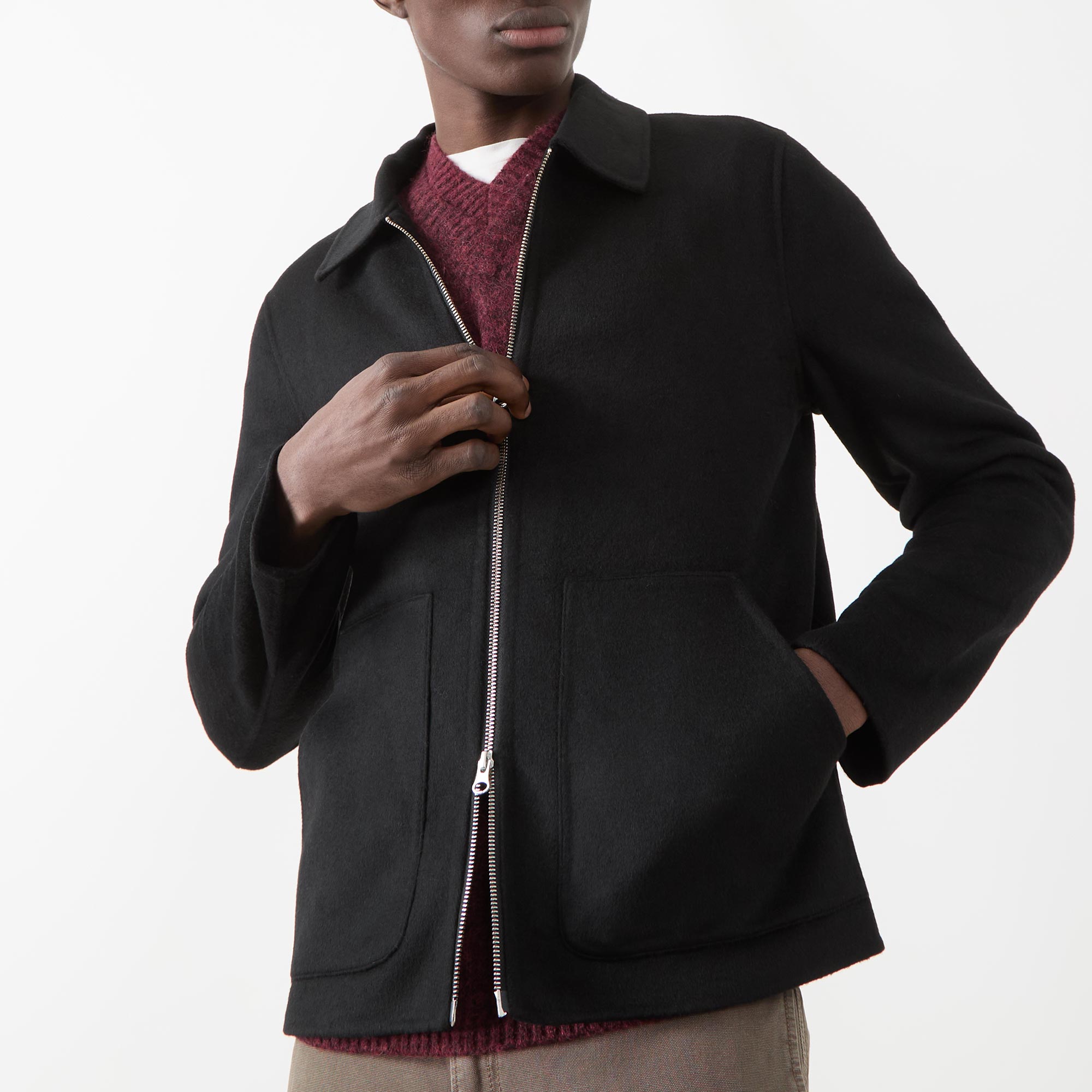 - Point collar, long sleeves, two-way zipper, full zip-through fastening, two side in-seam pockets, inverted seams, straight hemline