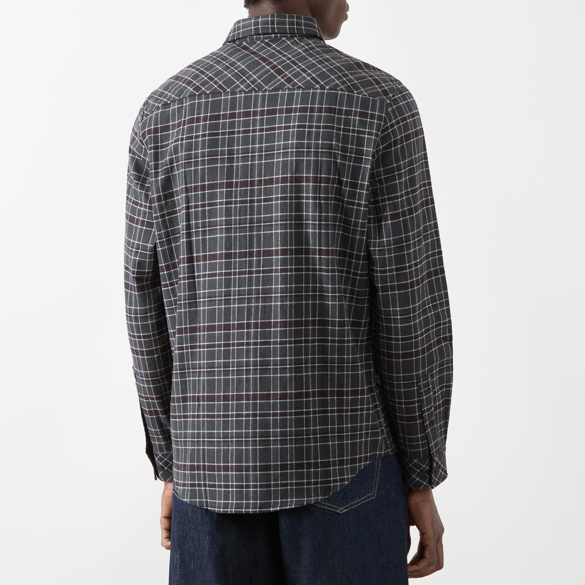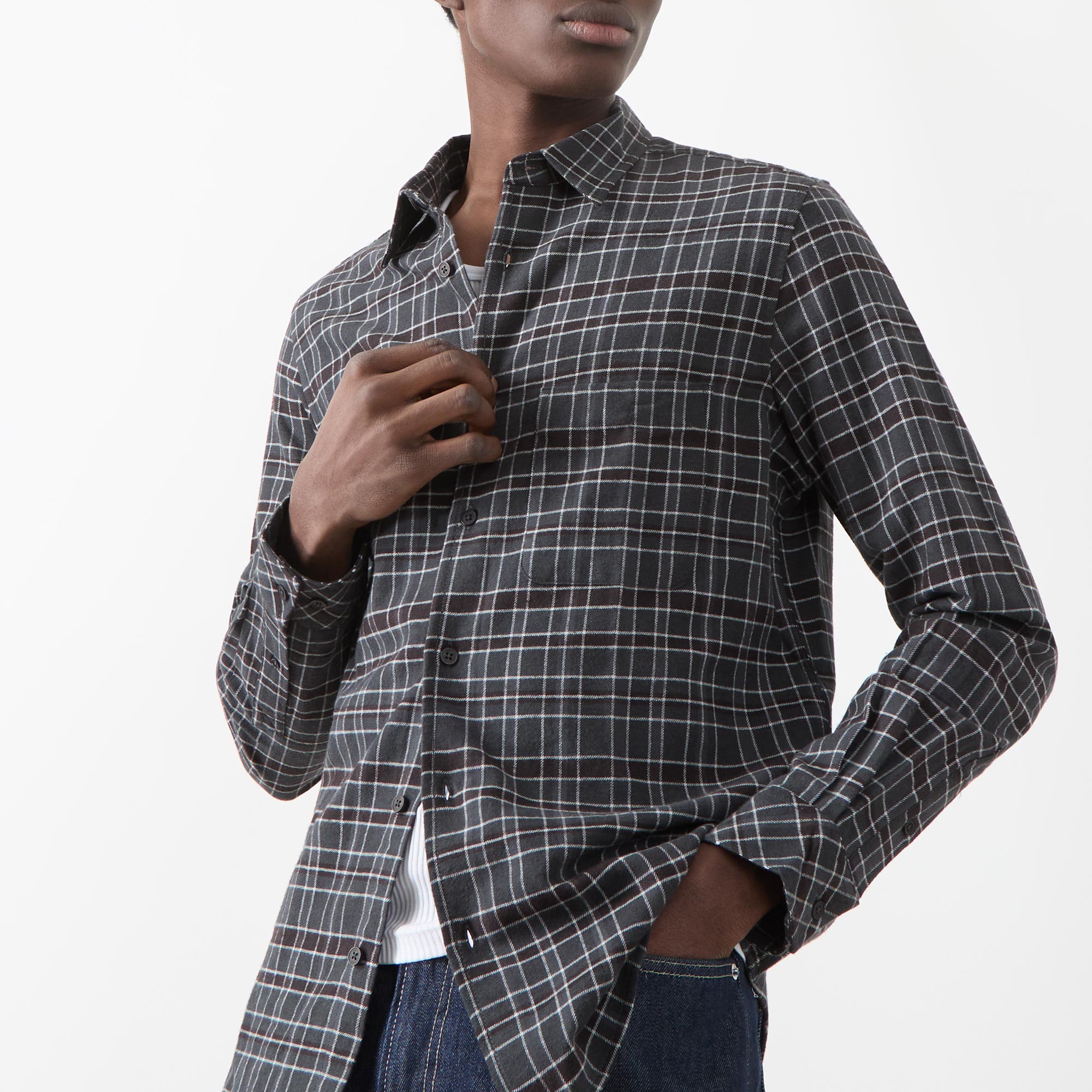 - Point collar, long sleeves, front button placket, chest patch pocket, check pattern, single-button cuffs, curved hemline, smooth fabric