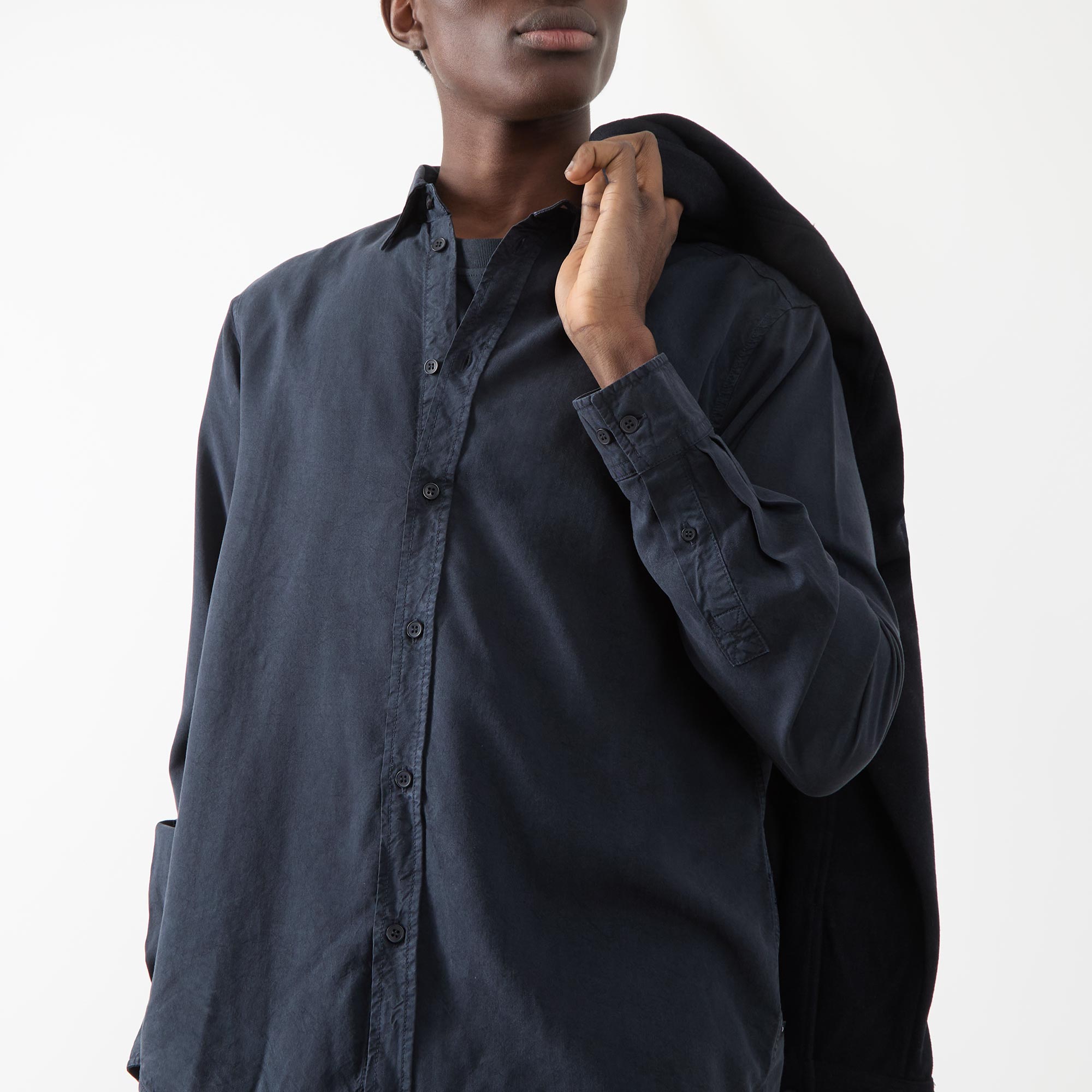 - Point collar, long sleeves, front button placket, tonal stitching, single-button cuffs, curved hemline, smooth fabric