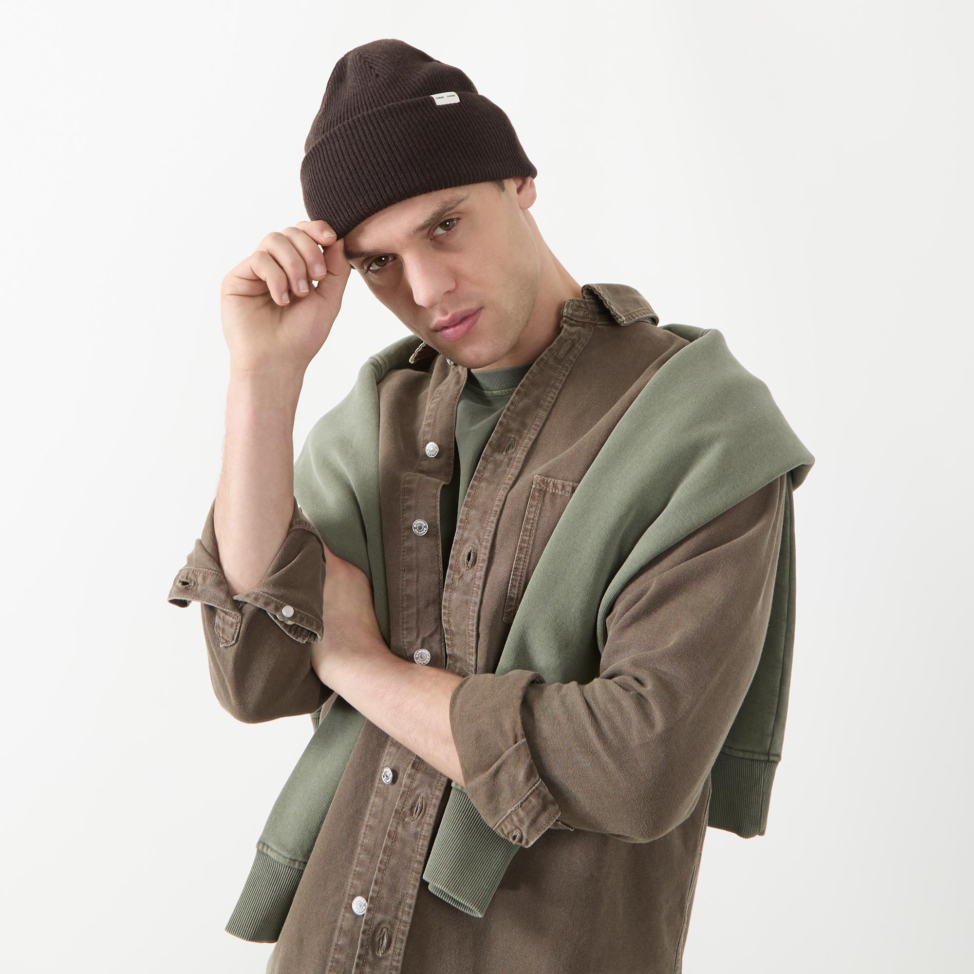 - Turned-up brim, beanie style, logo patch, ribbed-knit finish