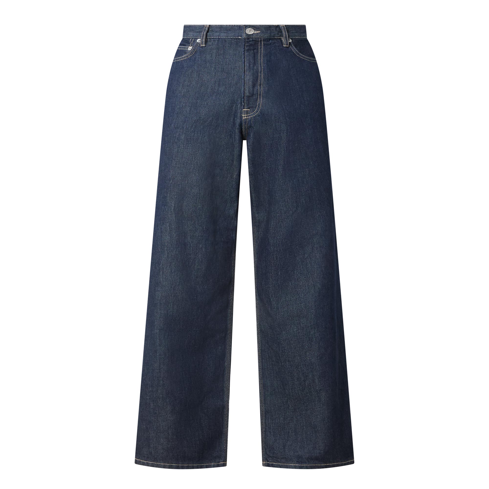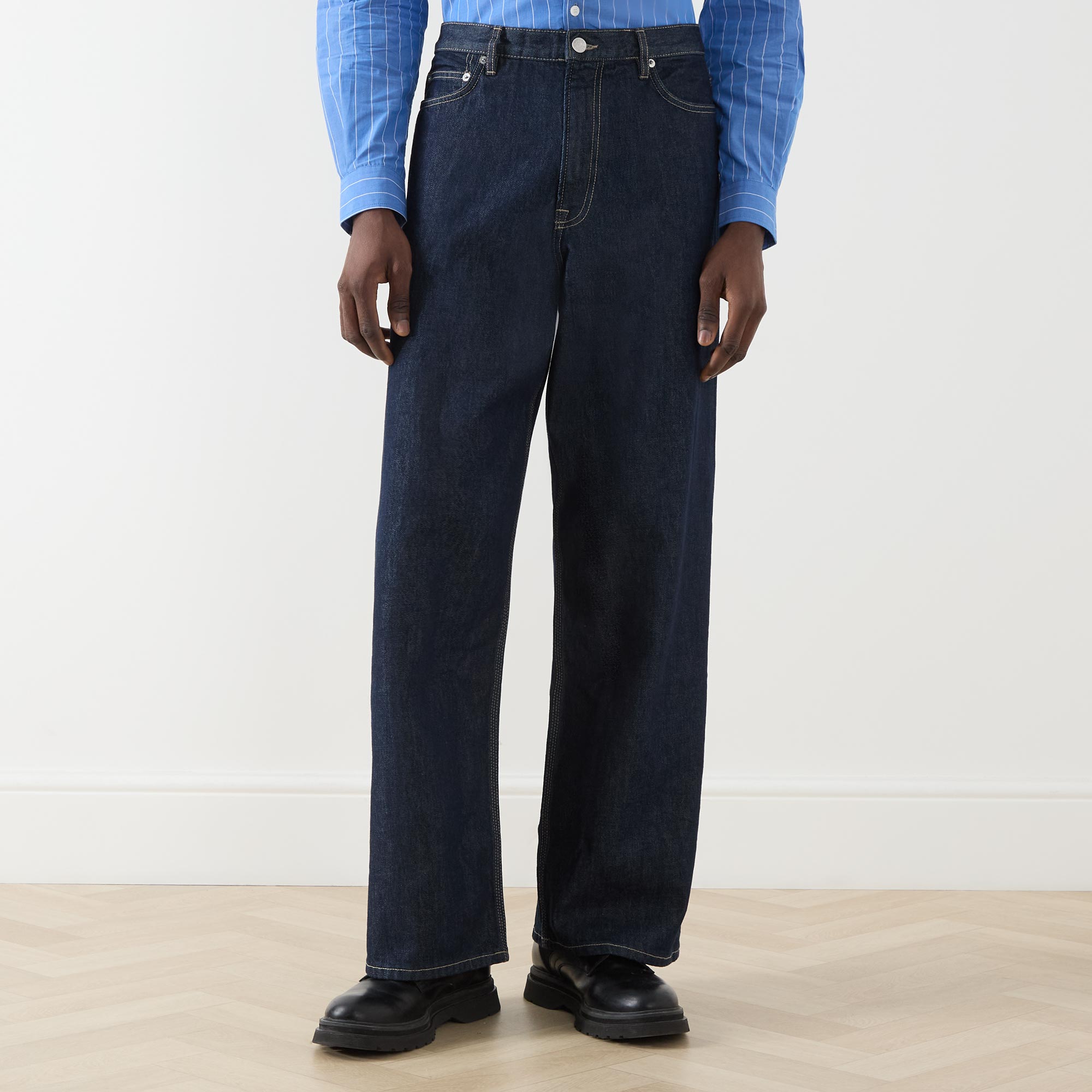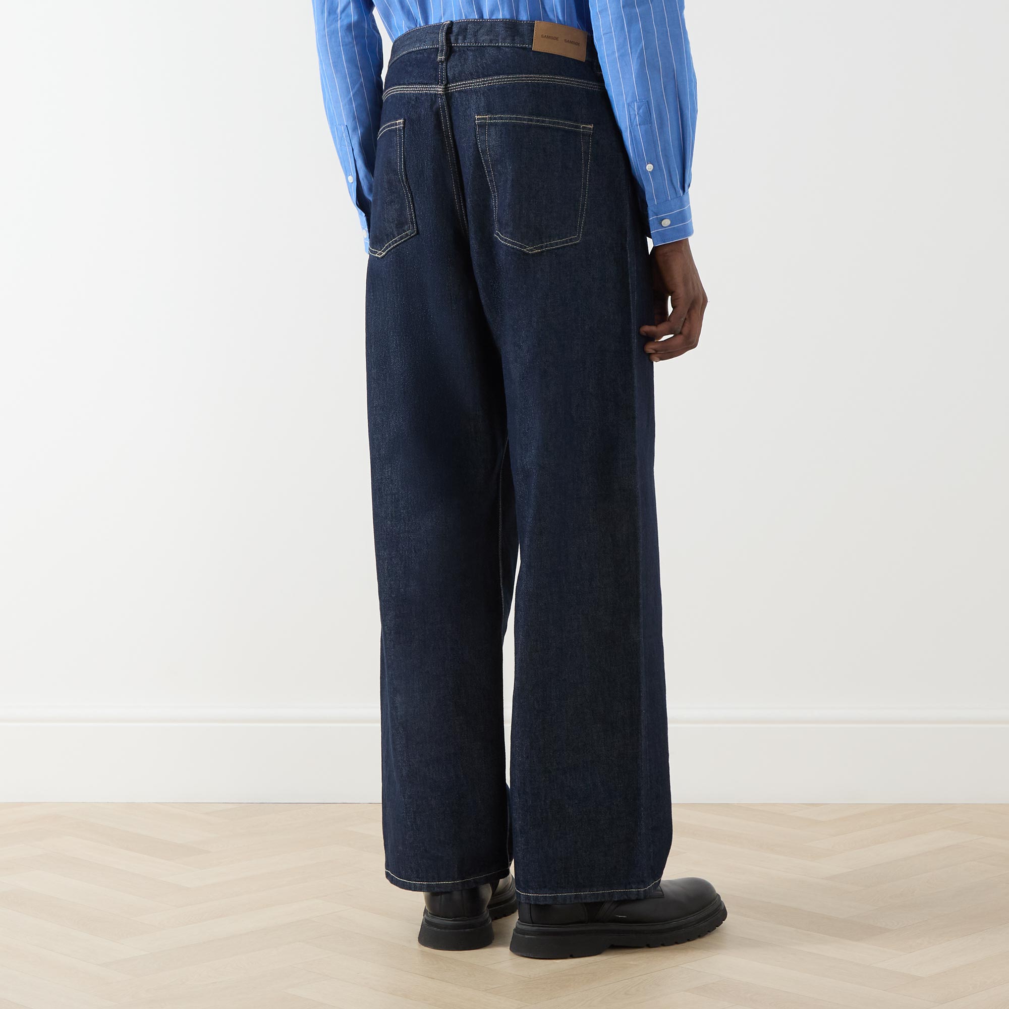 - Button and fly zip fastening, five-pocket style, belt loops, wide-straight cut legs, logo badge at rear
