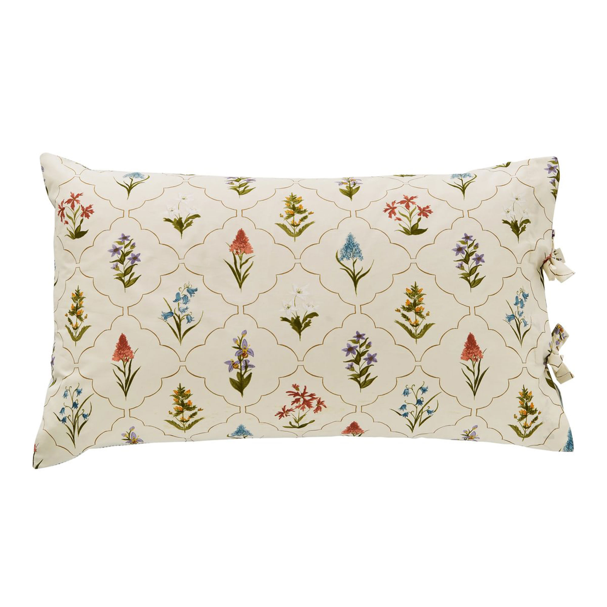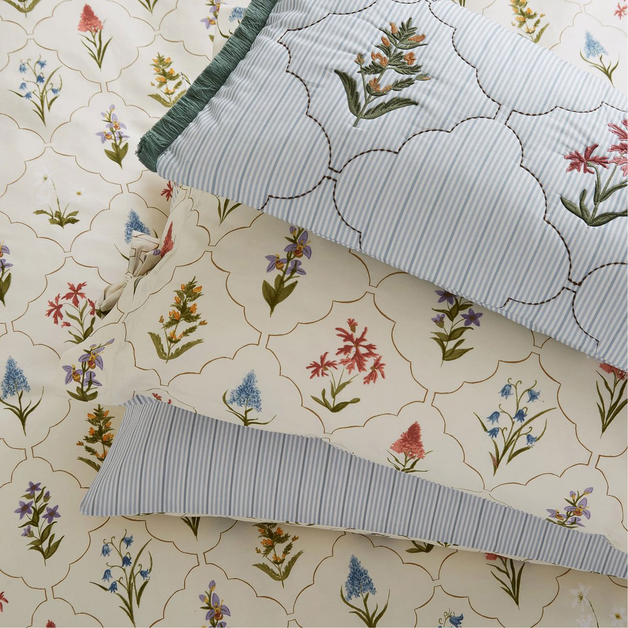 Delicately rendered in a botanical trellis style, this design draws from the wildflower meadows of the National Trust’s Brockhampton estate — where bluebells, pyramidal orchids, wood anemones and more bloom in quiet abundance. This beautiful bedding is made from 180 thread count cotton percale and features a fine vertical striped reverse. The co-ordinating pillowcases are finished with charming ties along the outer edge, for a thoughtful flourish. Duvet Set includes pillowcase(s). Complete the look with The Spring Meadow cushion (70x30cms) features delicately embroidered flowers contained within a quilted trellis pattern, inspired by the wildflower meadows of the National Trust’s Brockhampton estate — where bluebells, pyramidal orchids, wood anemones and more bloom in quiet abundance. Accented with fringe detailing on each end.