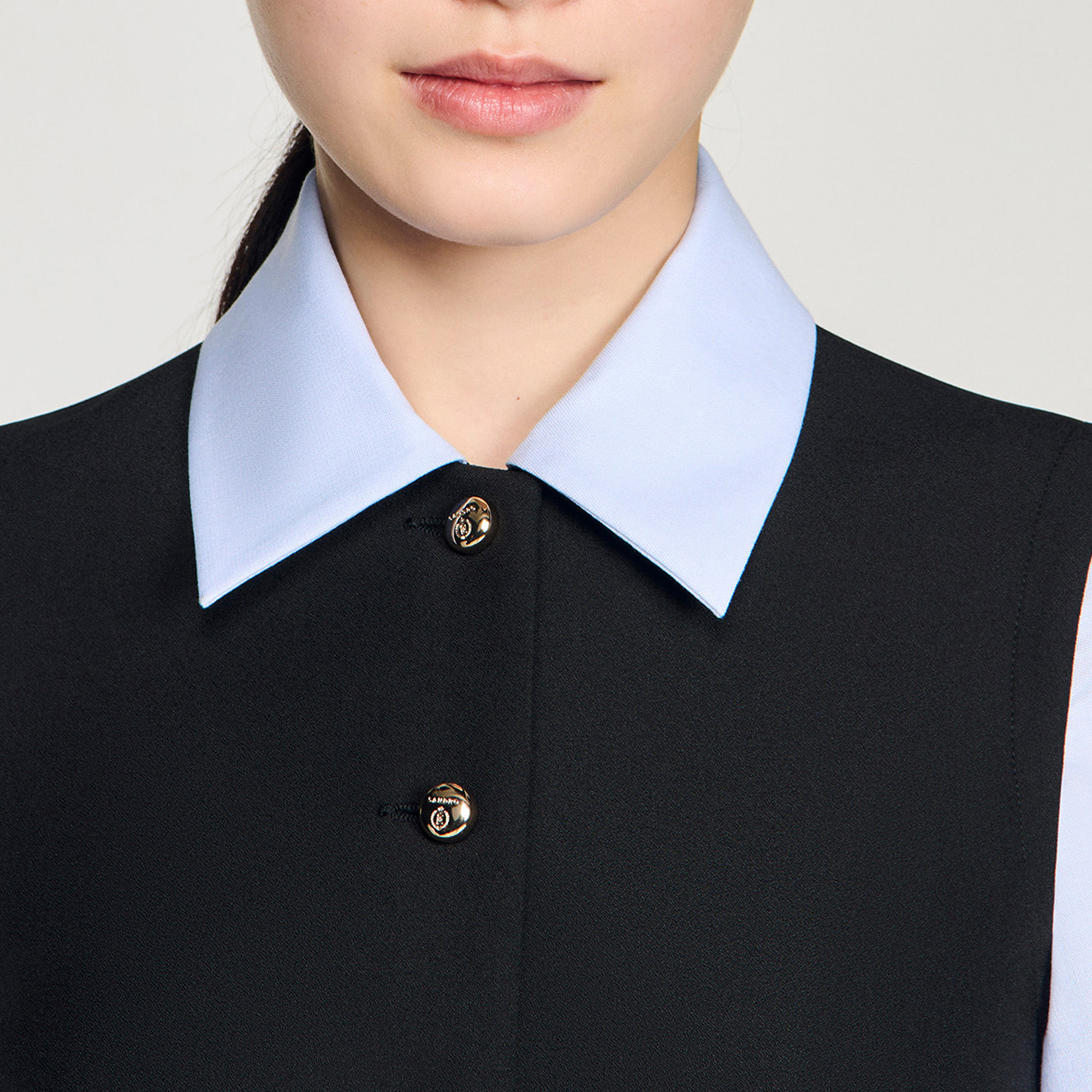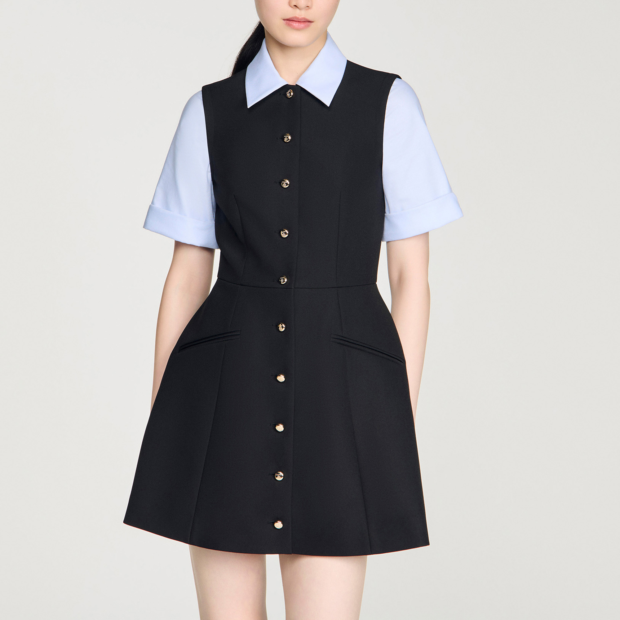 - Shirt collar, short sleeves with turn-ups, button fastening, welt pockets, fitted top, full skirt, lined