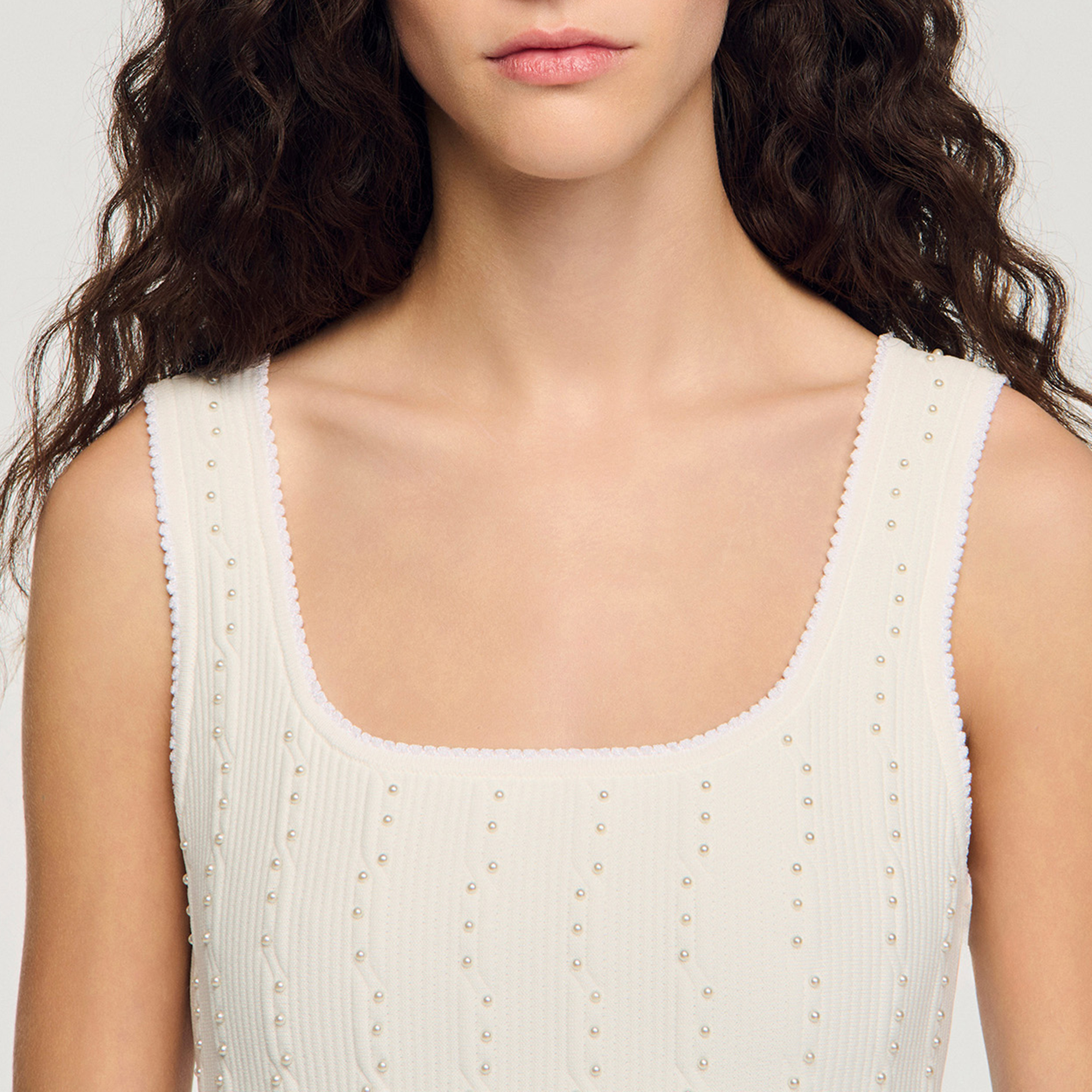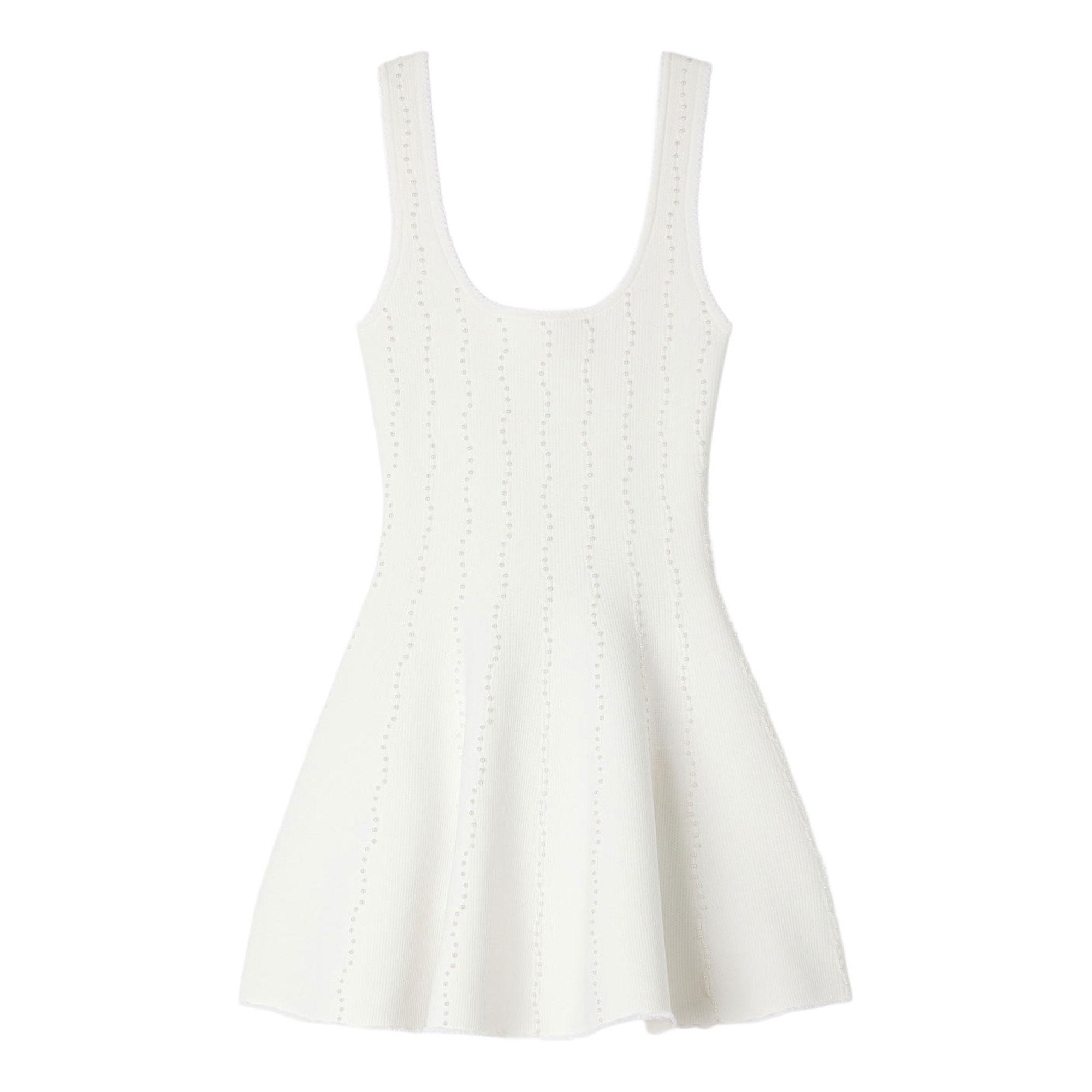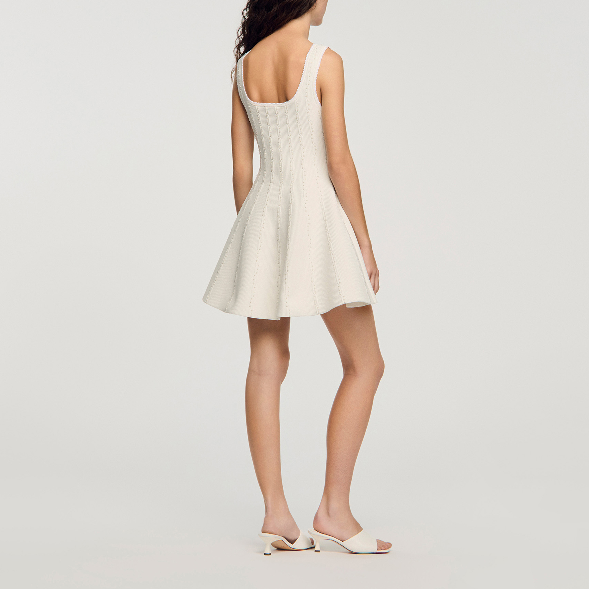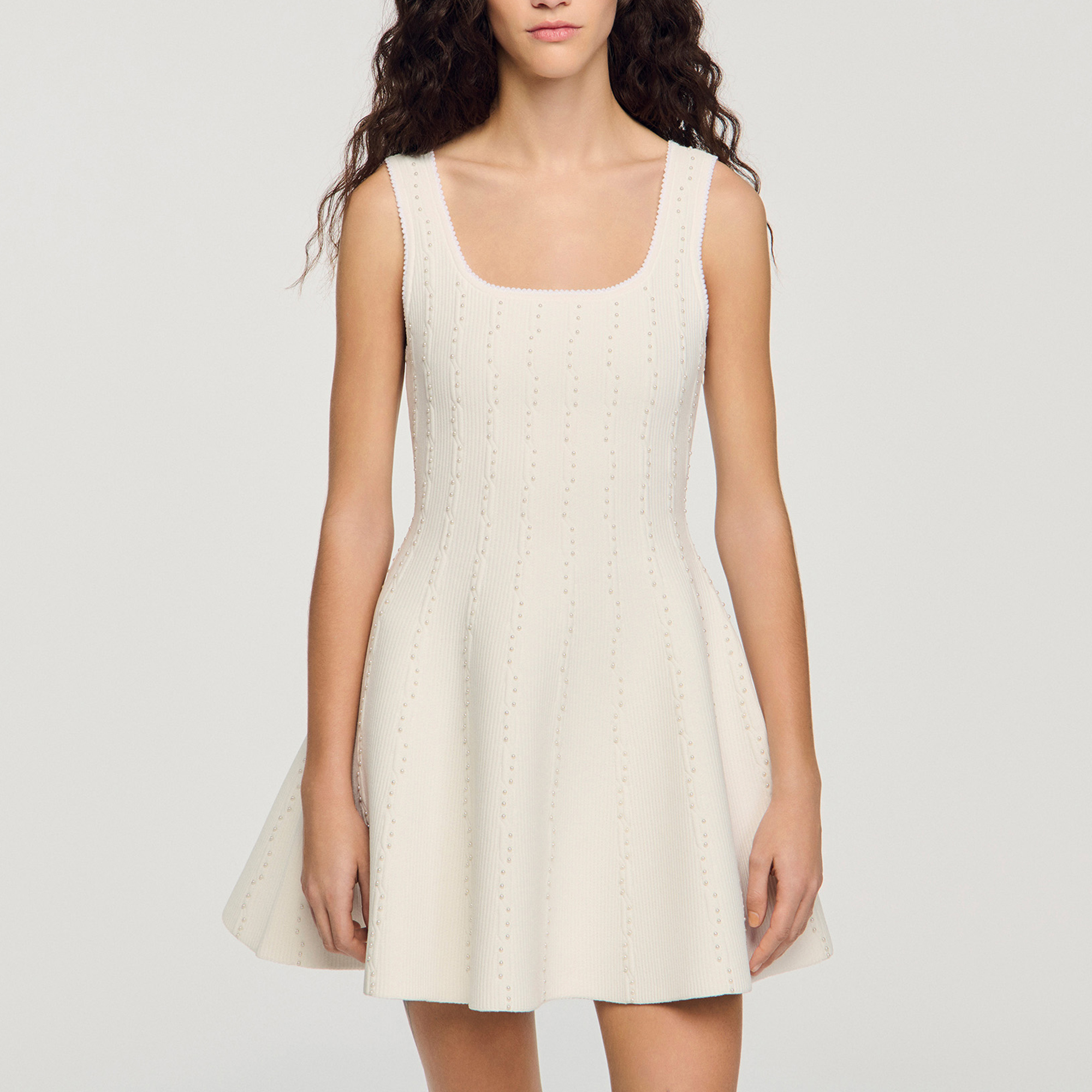 • Mini, knit structure, wide fixed straps, beaded embellishment, fitted top, flared skirt