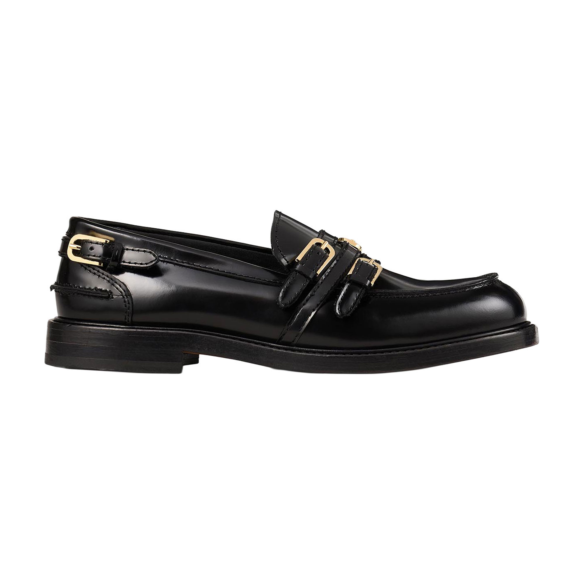 - Shiny finish, gold-tone hardware, leather sole, multiple buckles