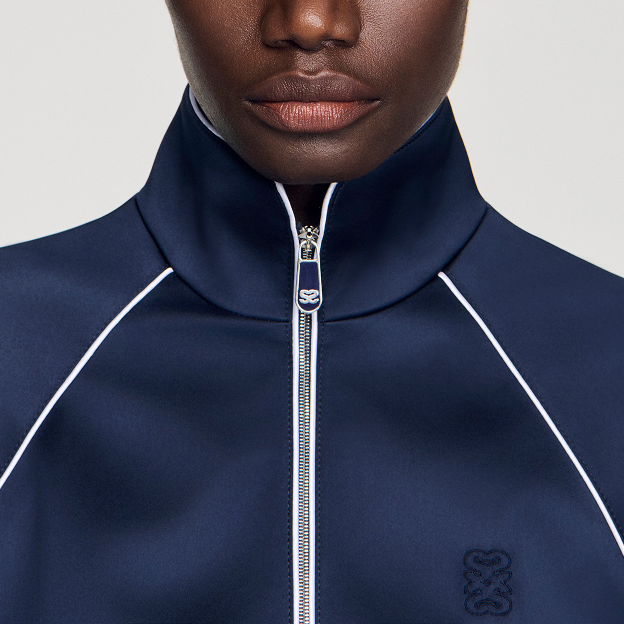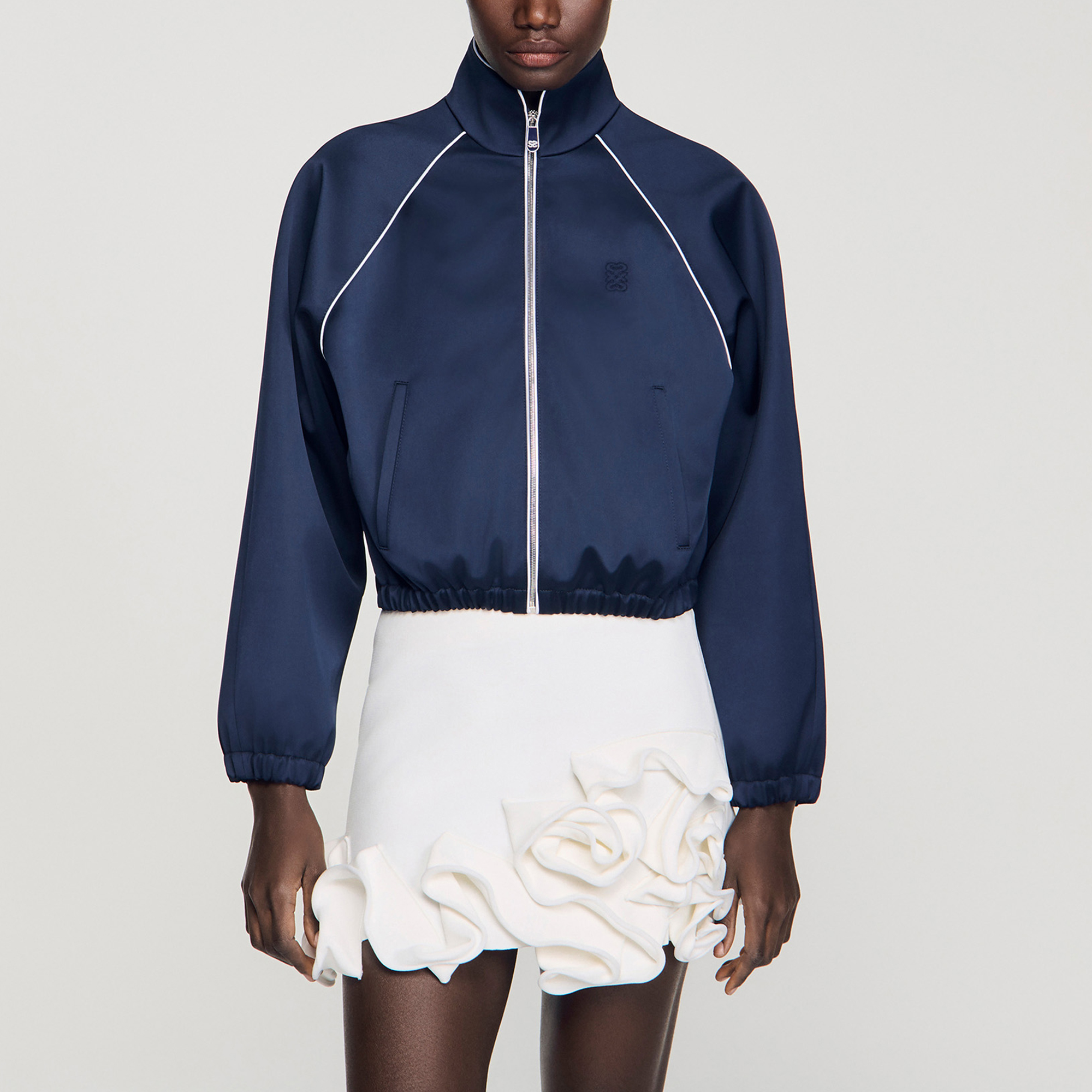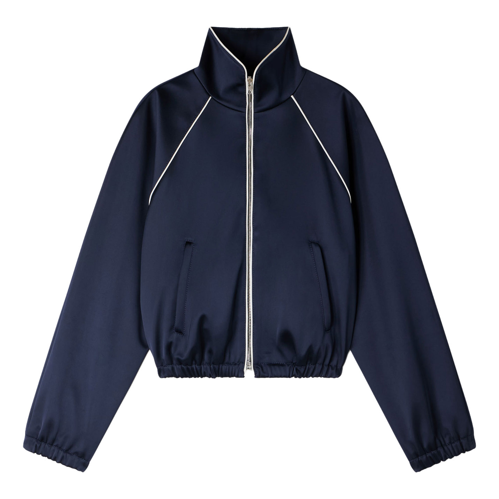 - Cropped length, satin finish, stand-up collar, contrasting piping, long raglan sleeves, welt pockets, elasticated cuffs and hem, tone-on-tone signature logo embroidered on the chest