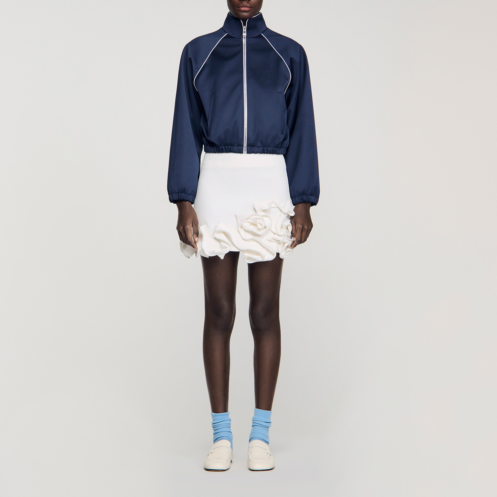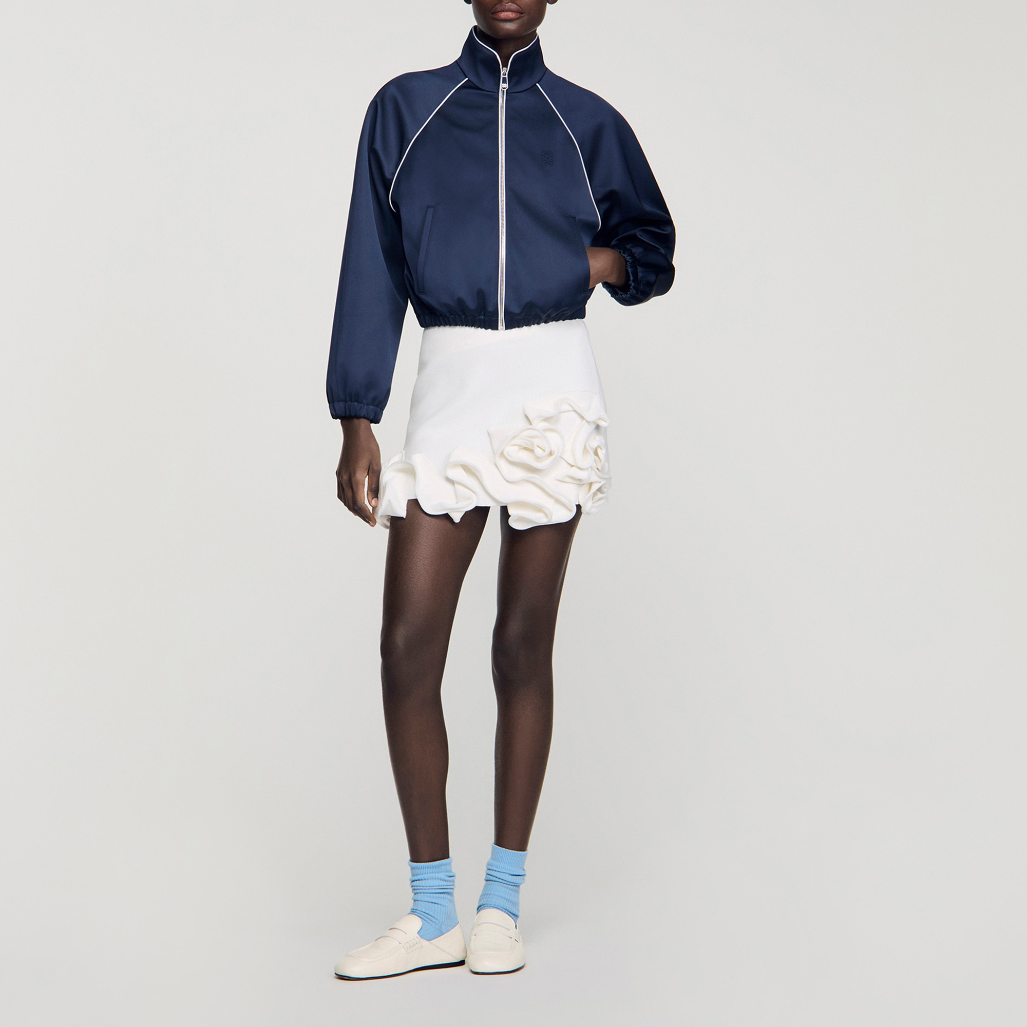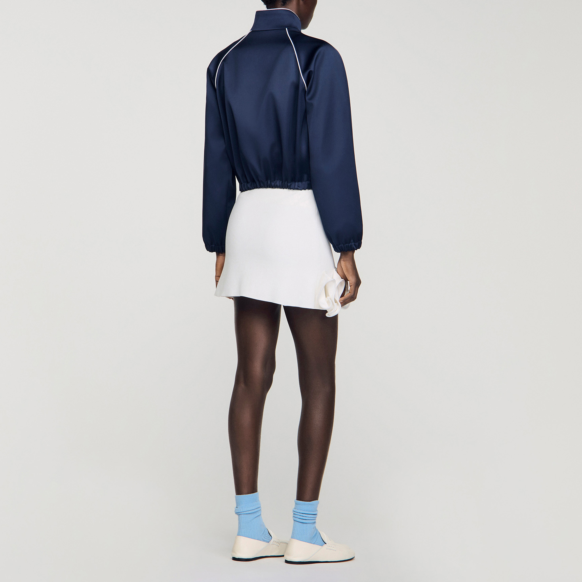 - Cropped length, satin finish, stand-up collar, contrasting piping, long raglan sleeves, welt pockets, elasticated cuffs and hem, tone-on-tone signature logo embroidered on the chest
