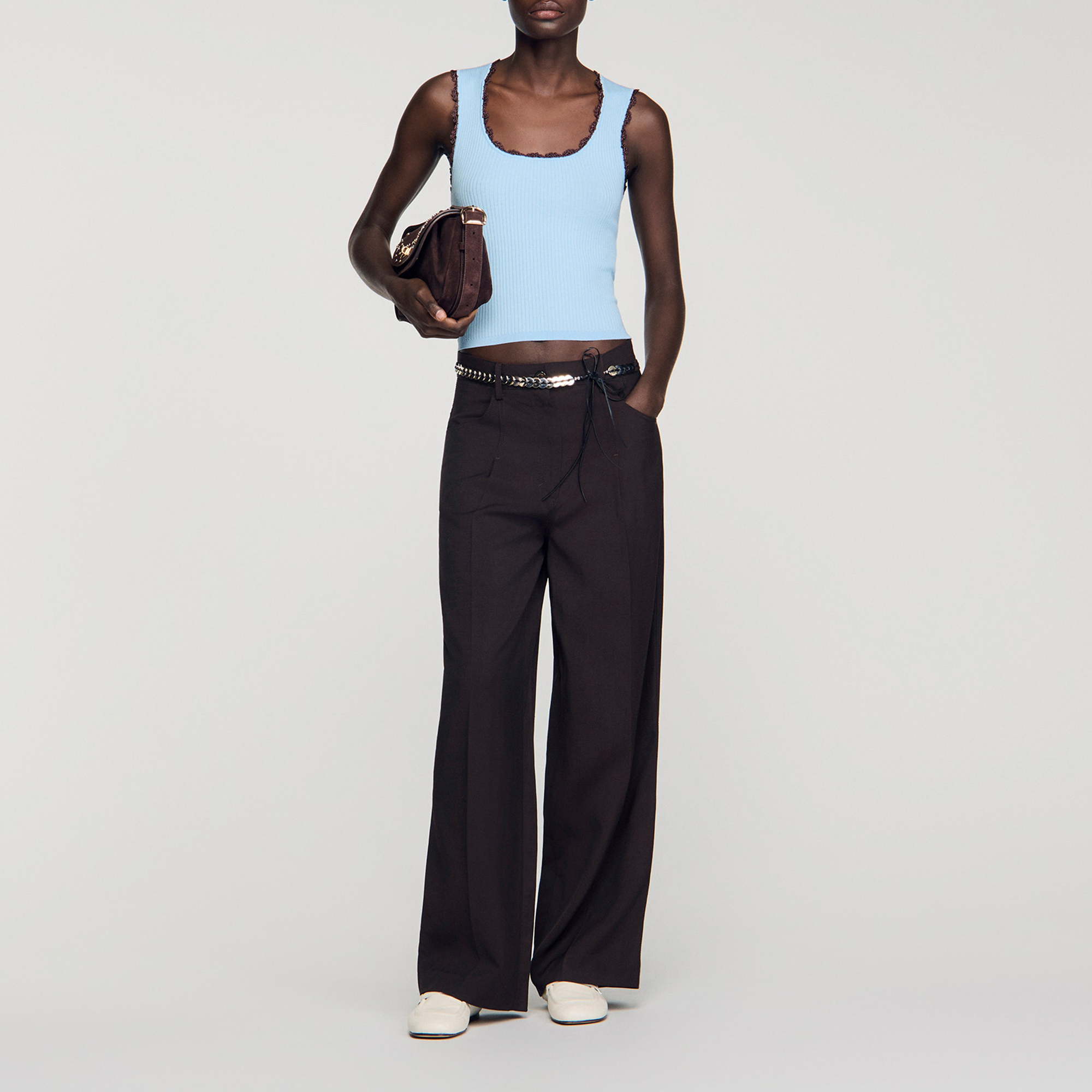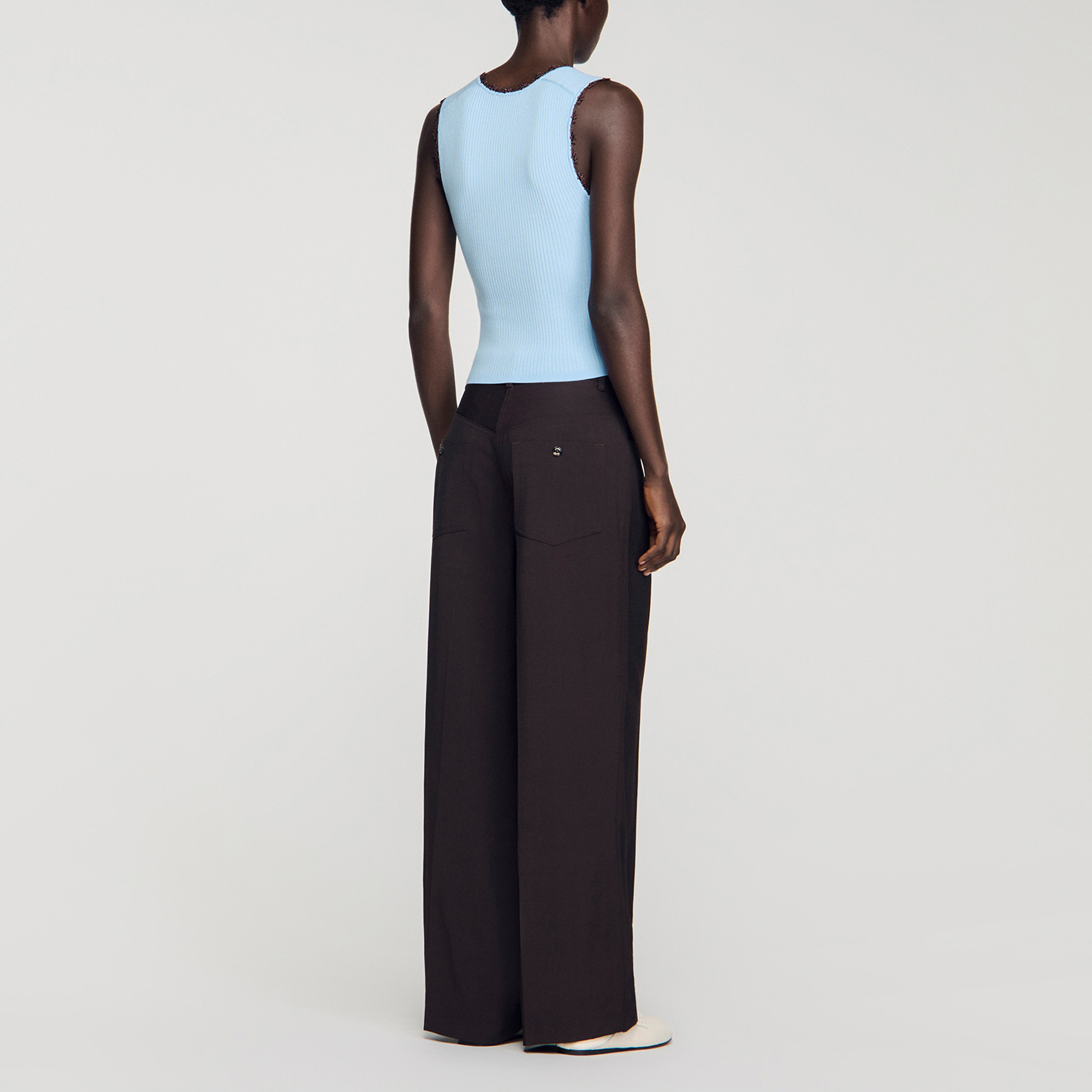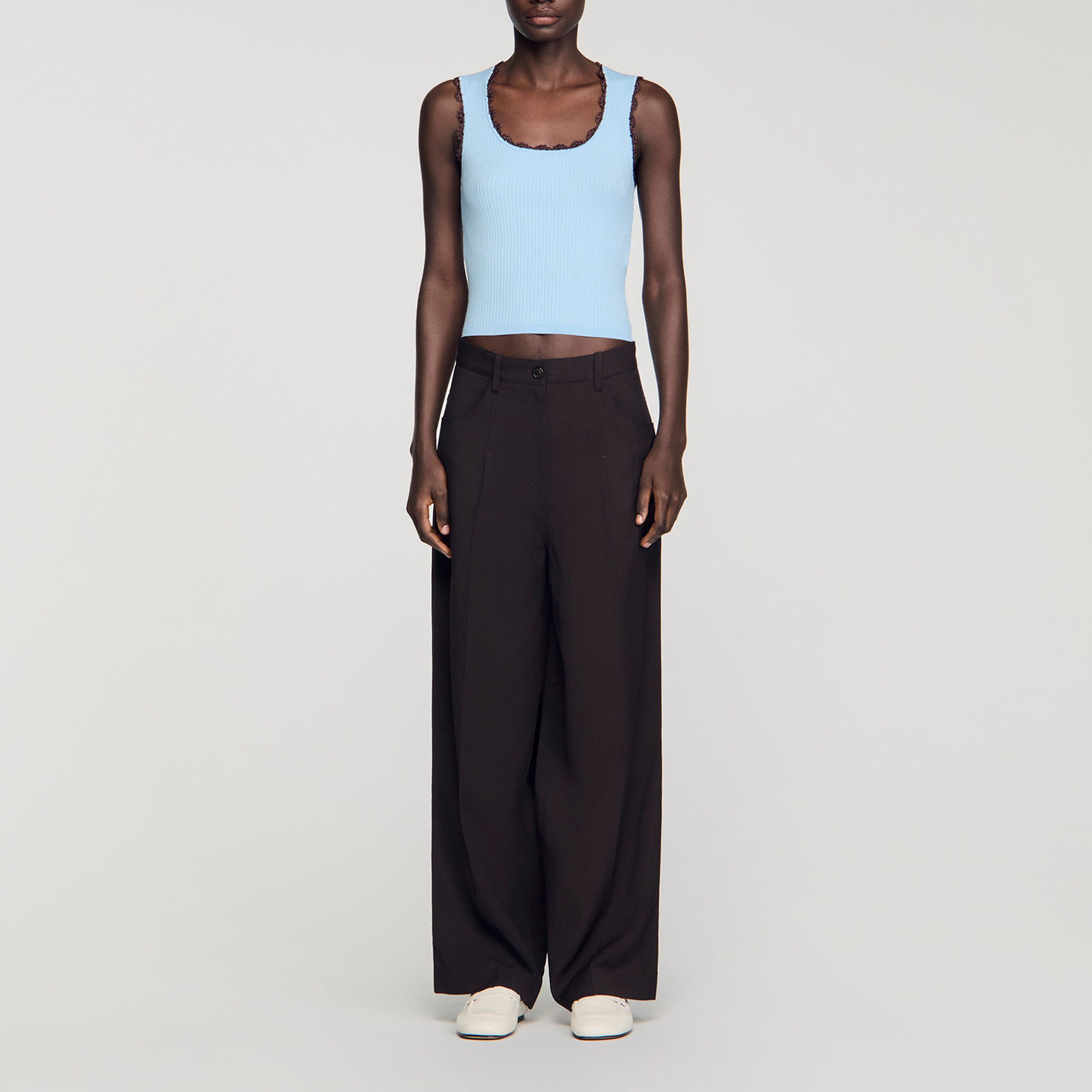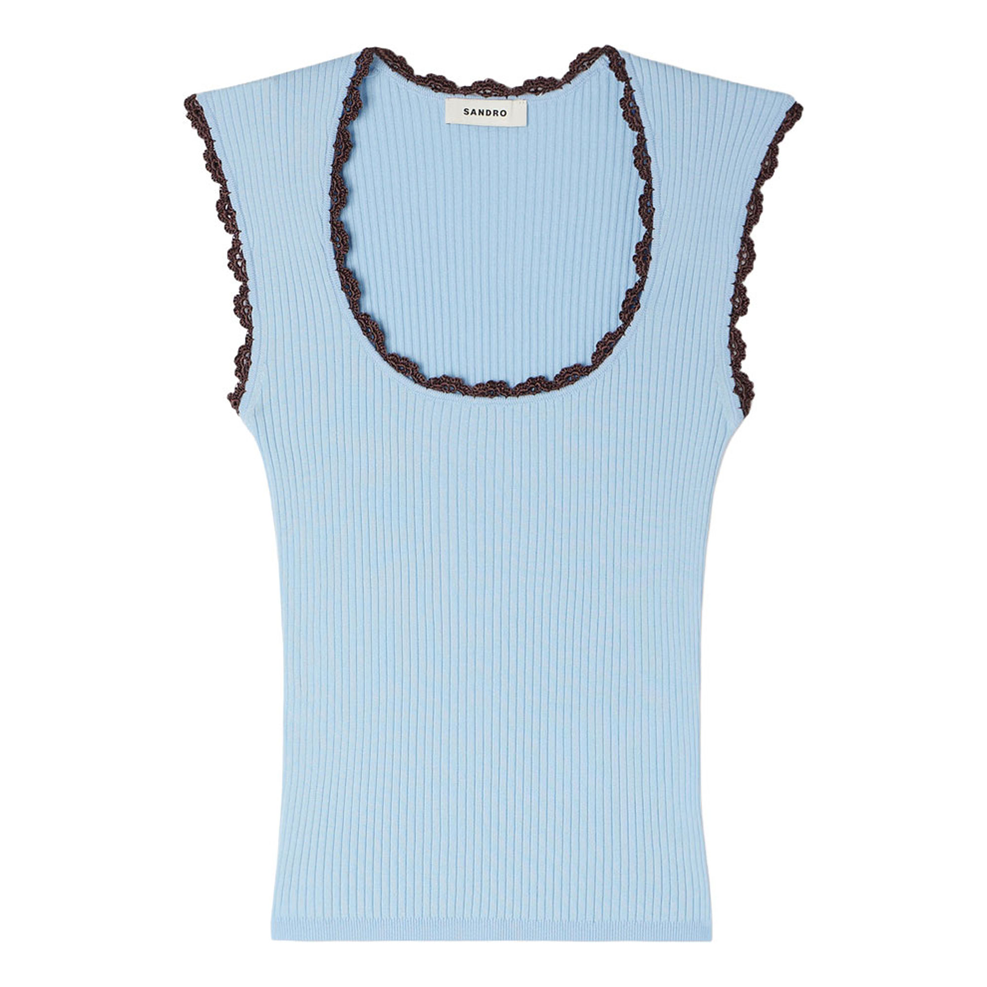 - Sleeveless, ribbed knit, contrasting crochet trim, scooped round neckline