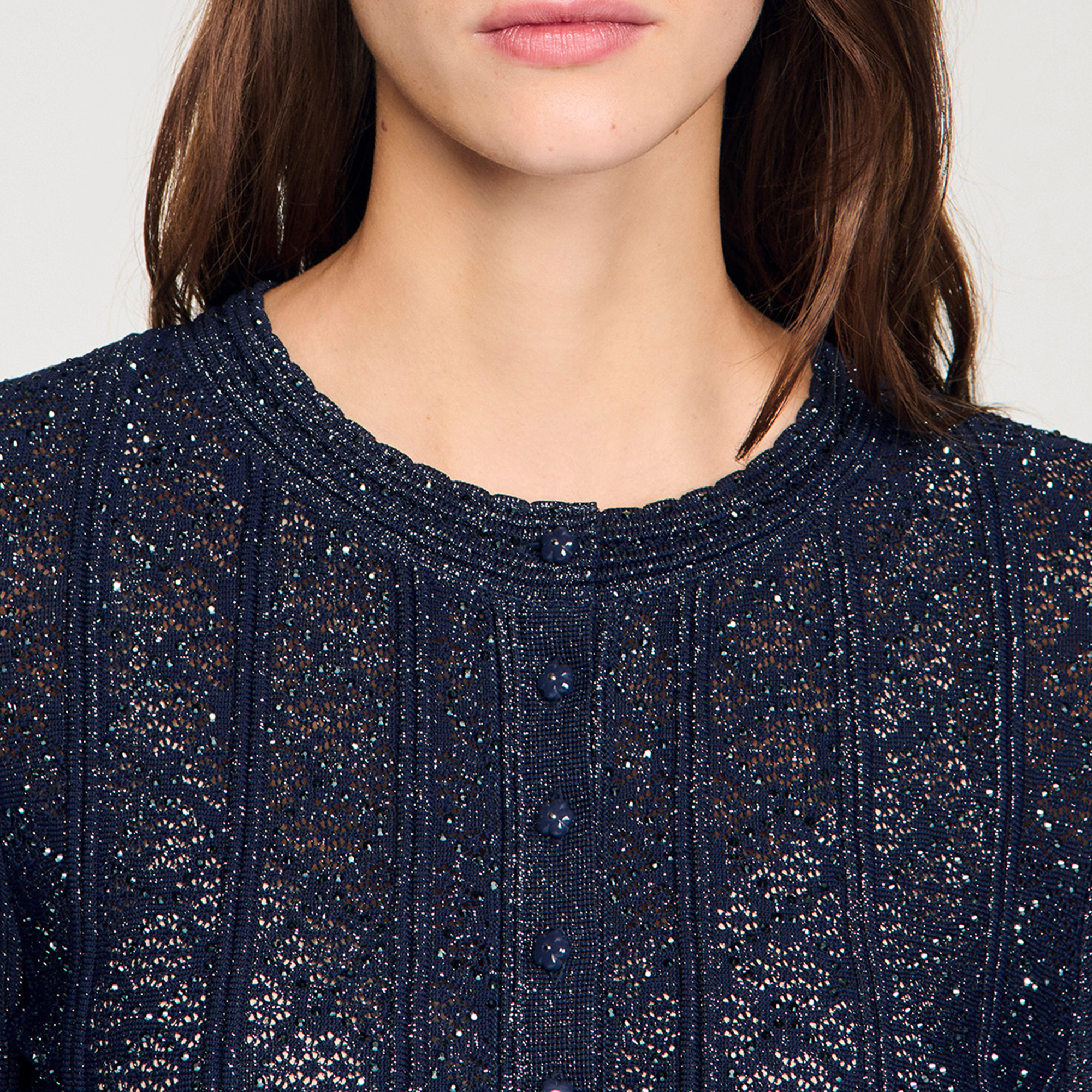 - Round neck, three quarter length sleeves, front button fastening, rhinestone-embellished design, textured knit construction, abstract pattern