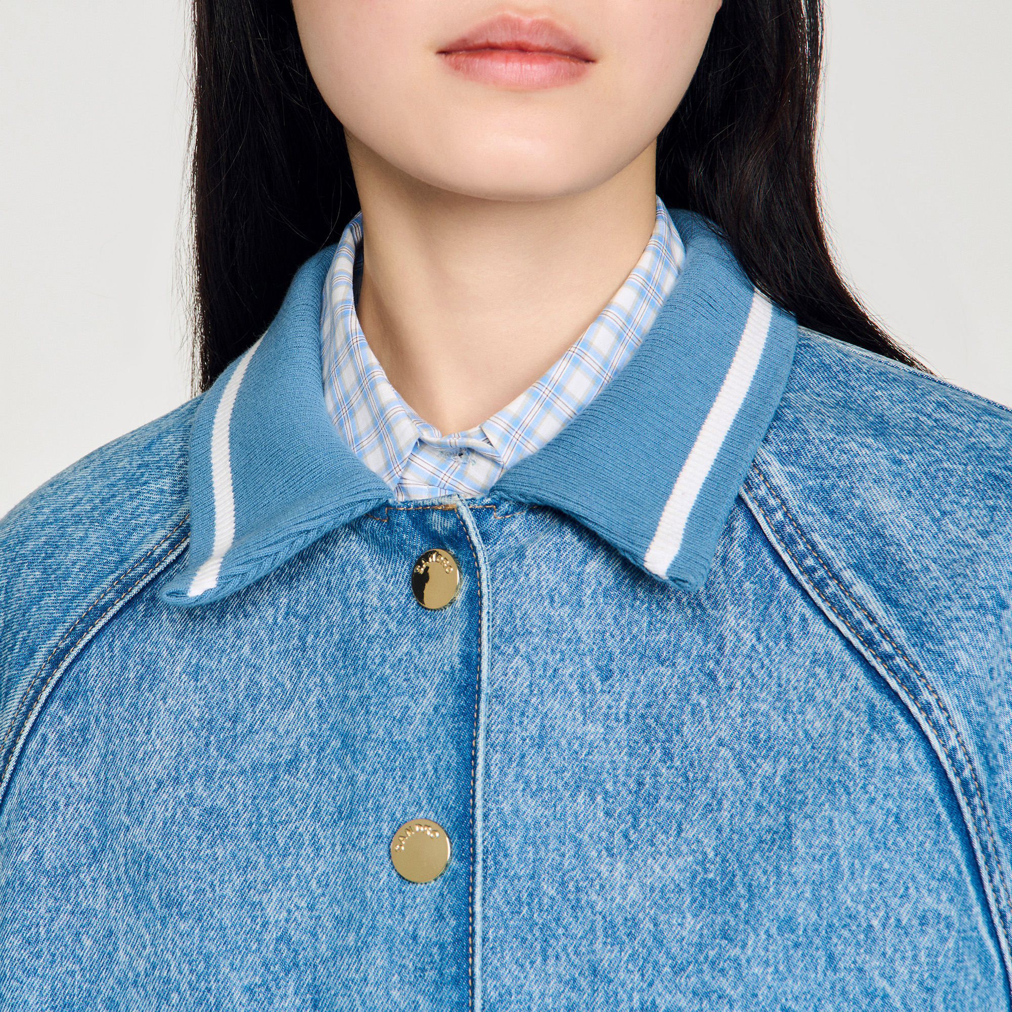 - Ribbed polo collar, long raglan sleeves, large patch pockets with flaps, front metal press-stud fastening, denim finish