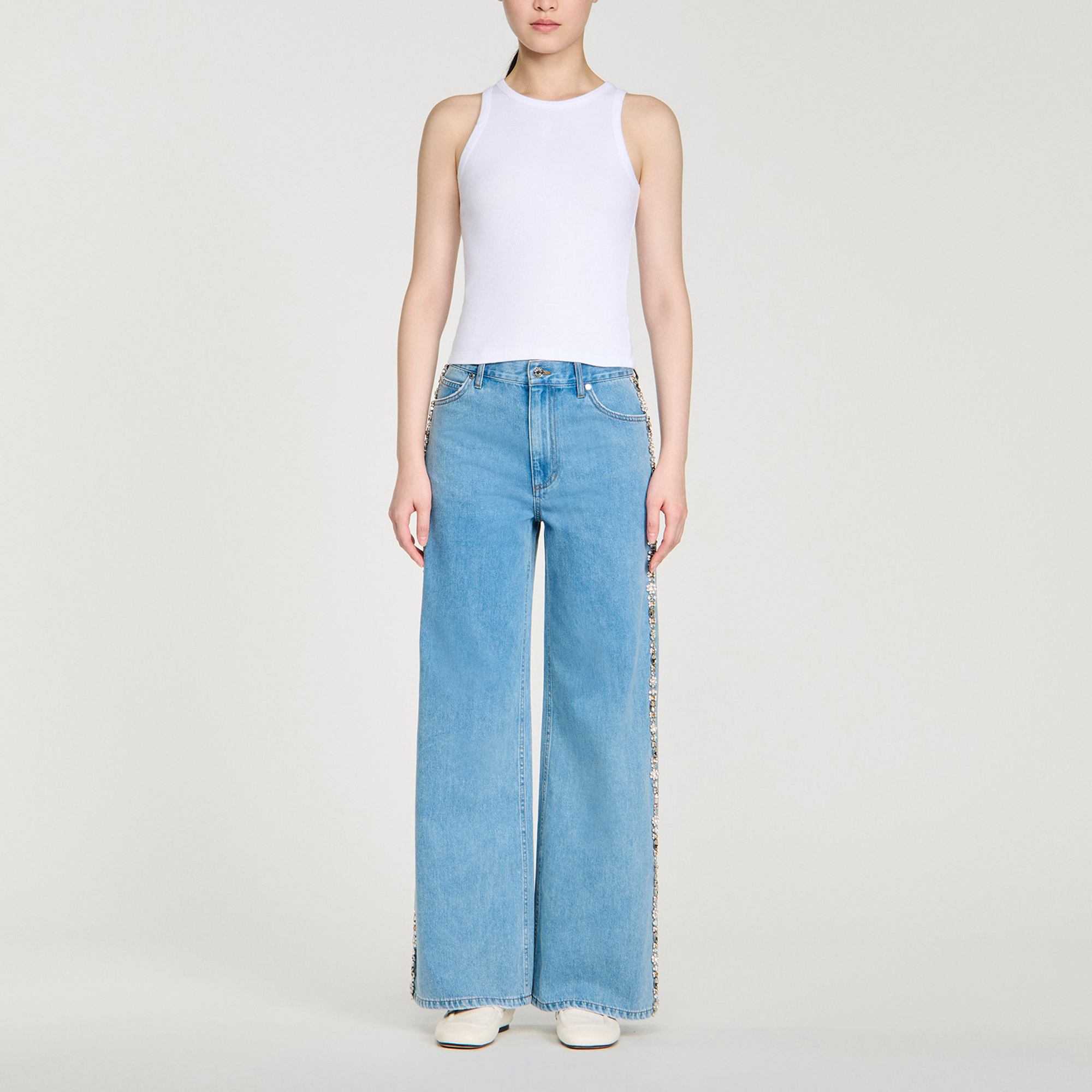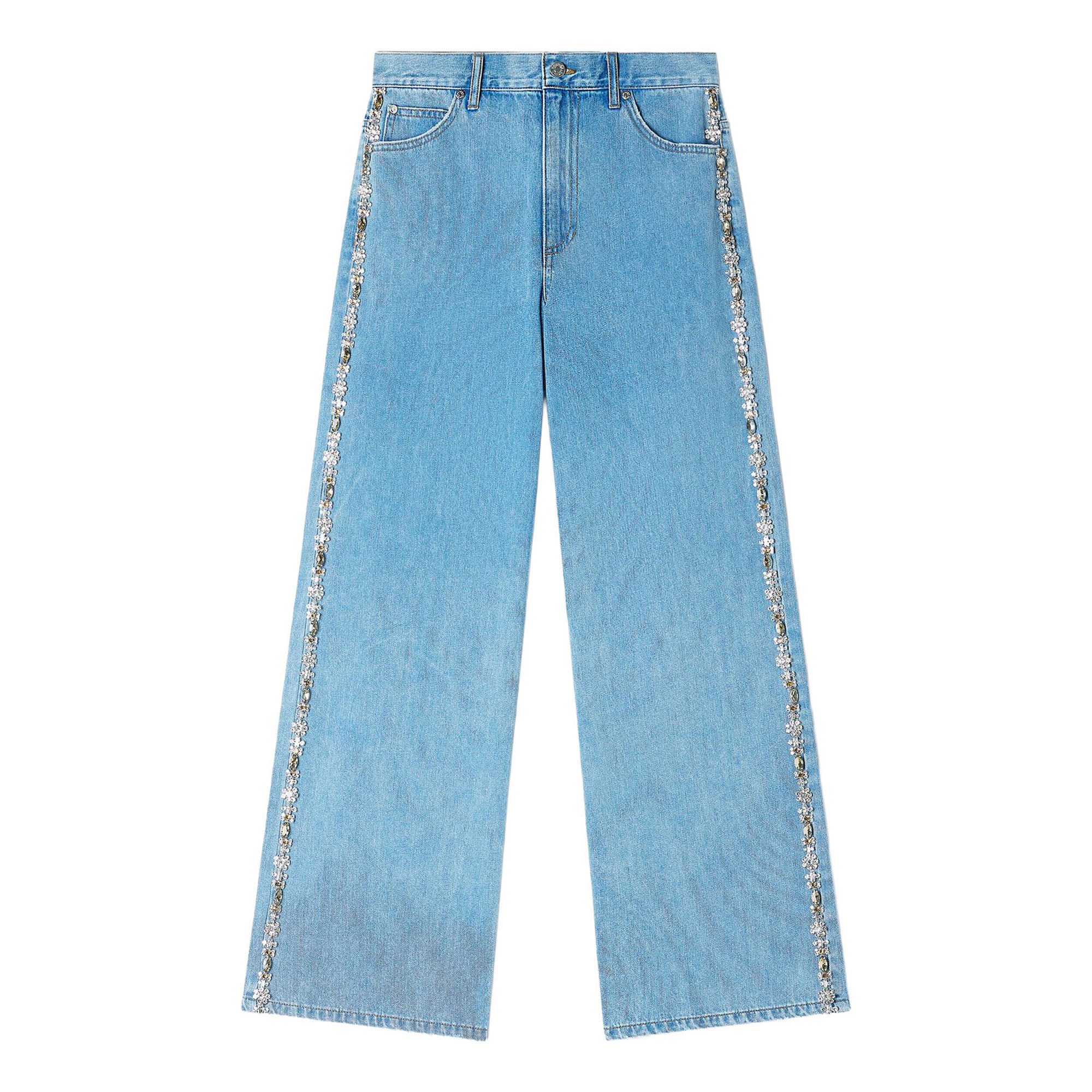- Wide-leg, rhinestone trim applied along the leg, button fastening and zip fly, five pockets