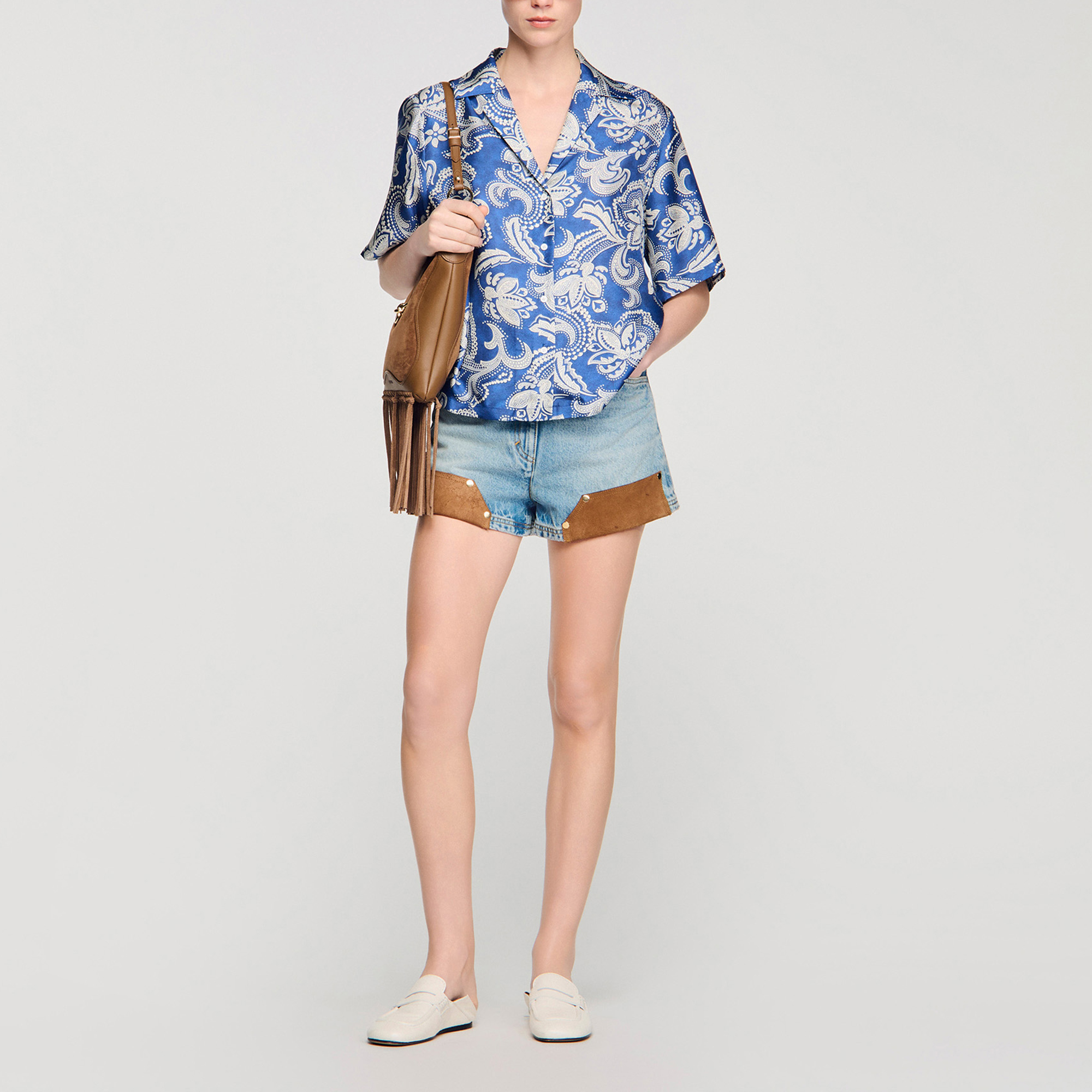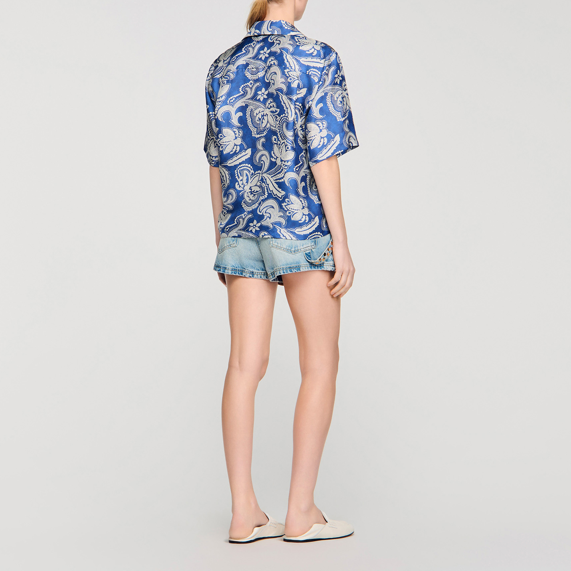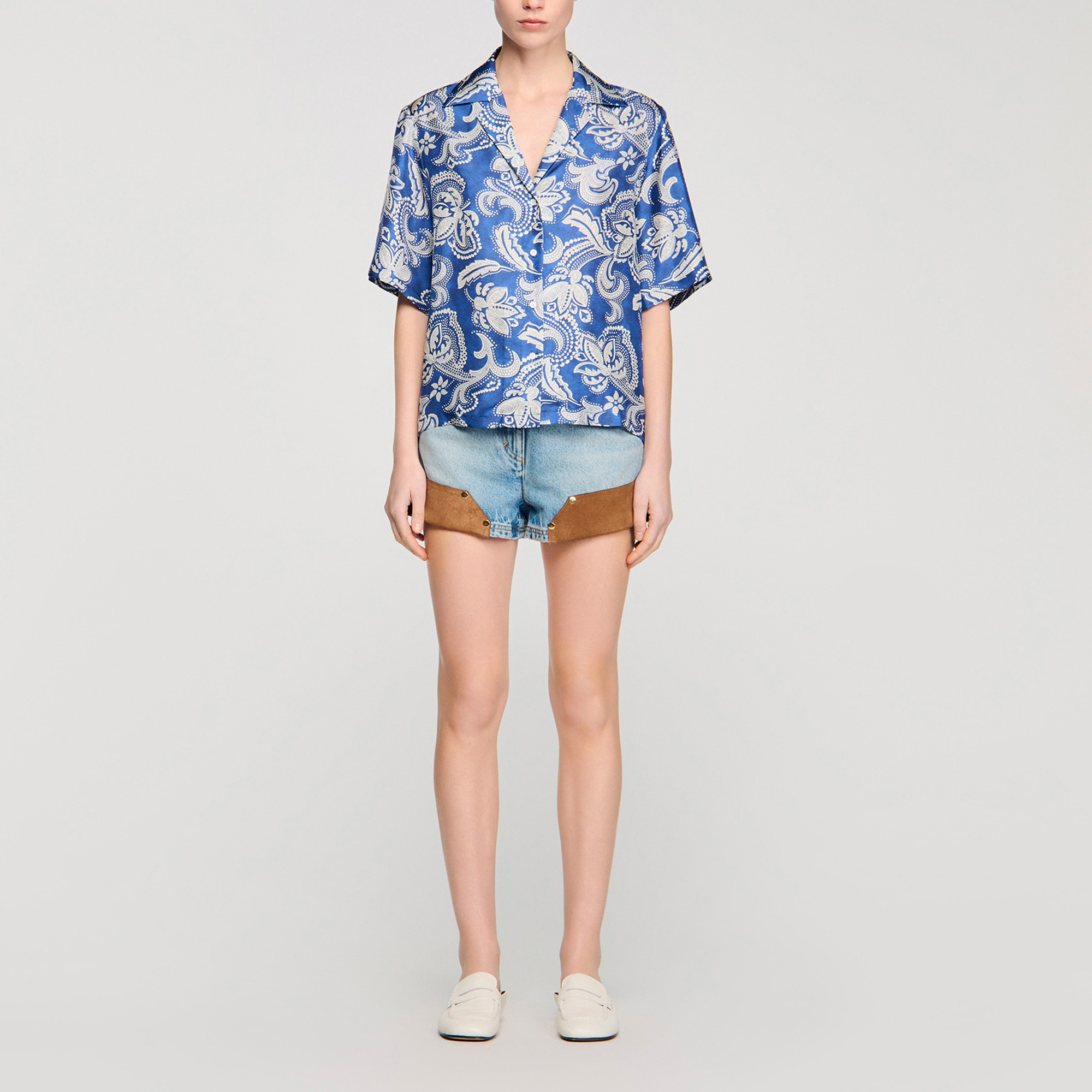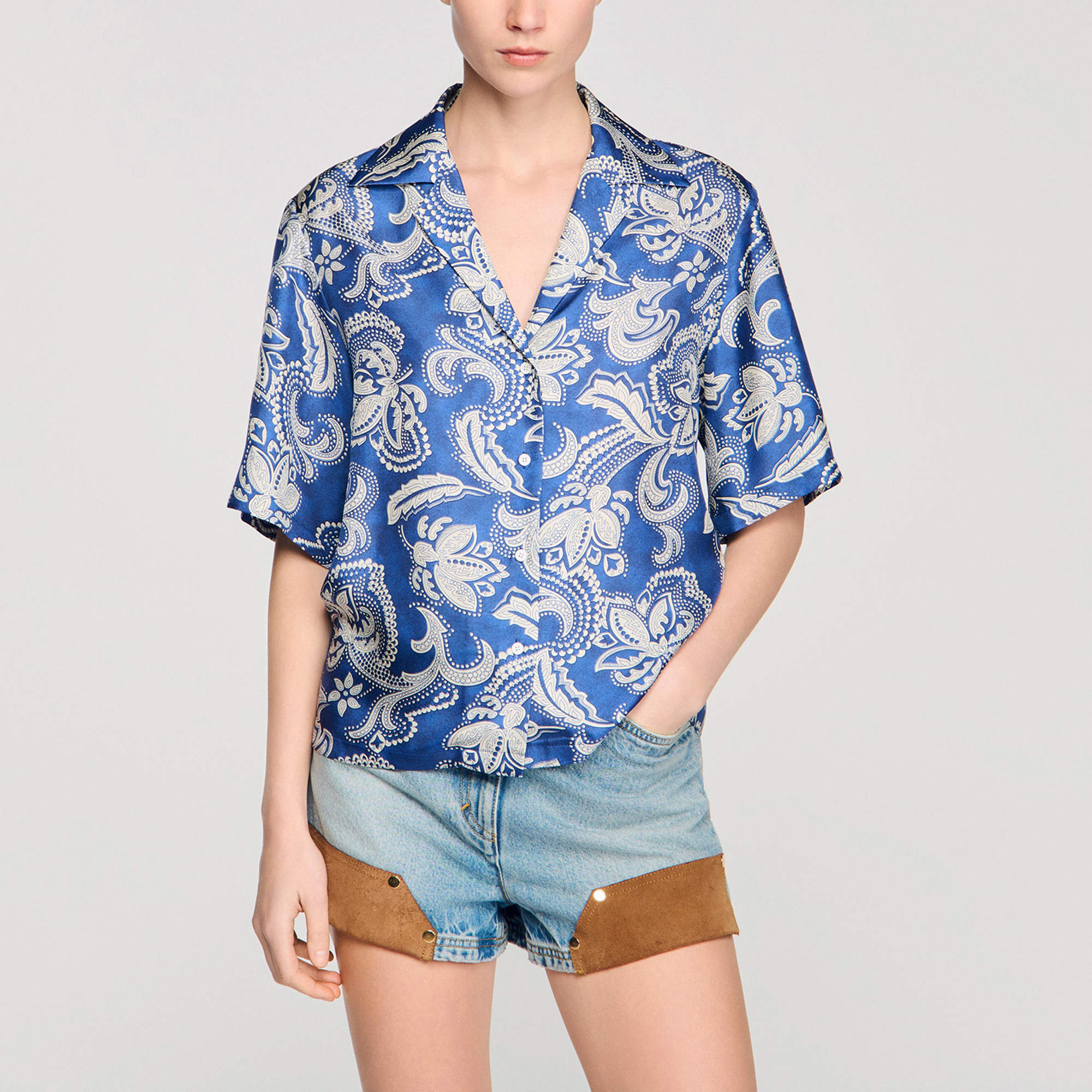 - Straight-cut, floral print, lapel collar, short sleeves, button fastening