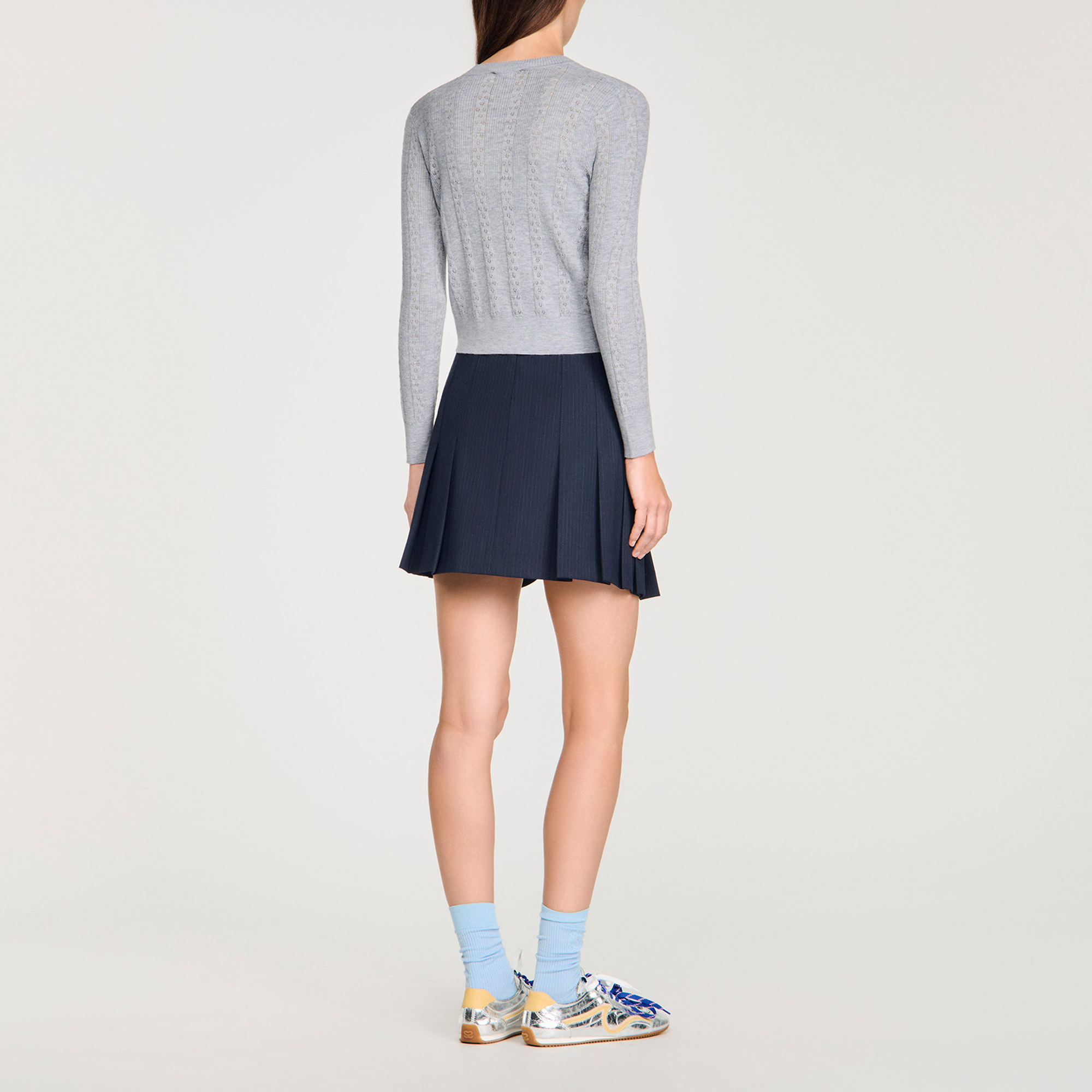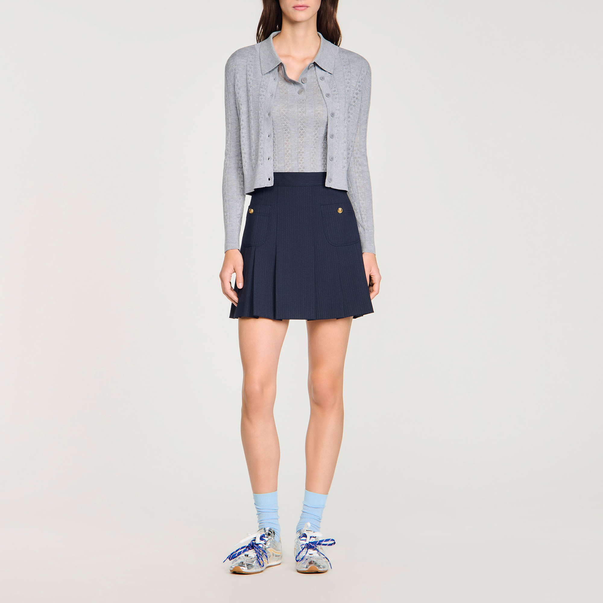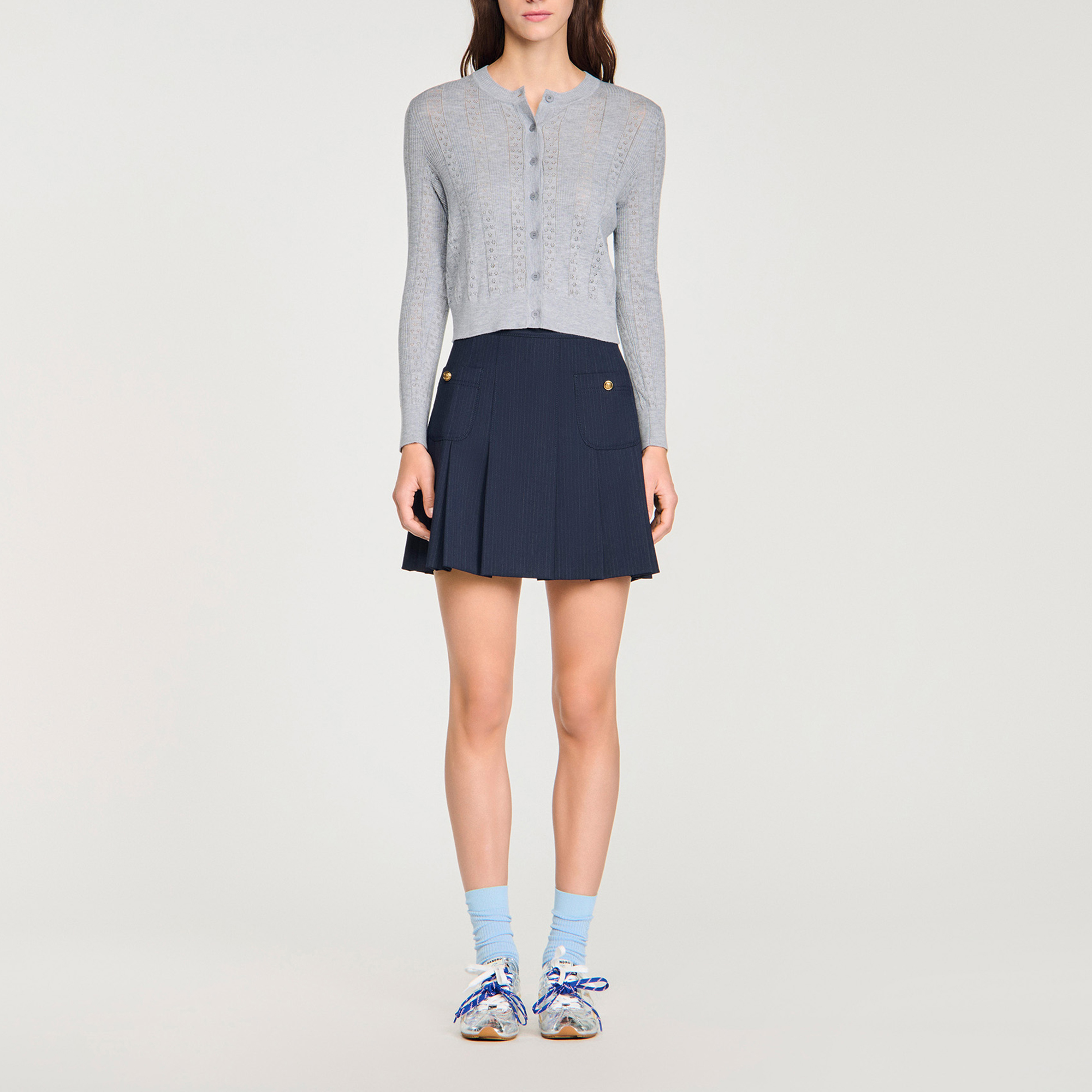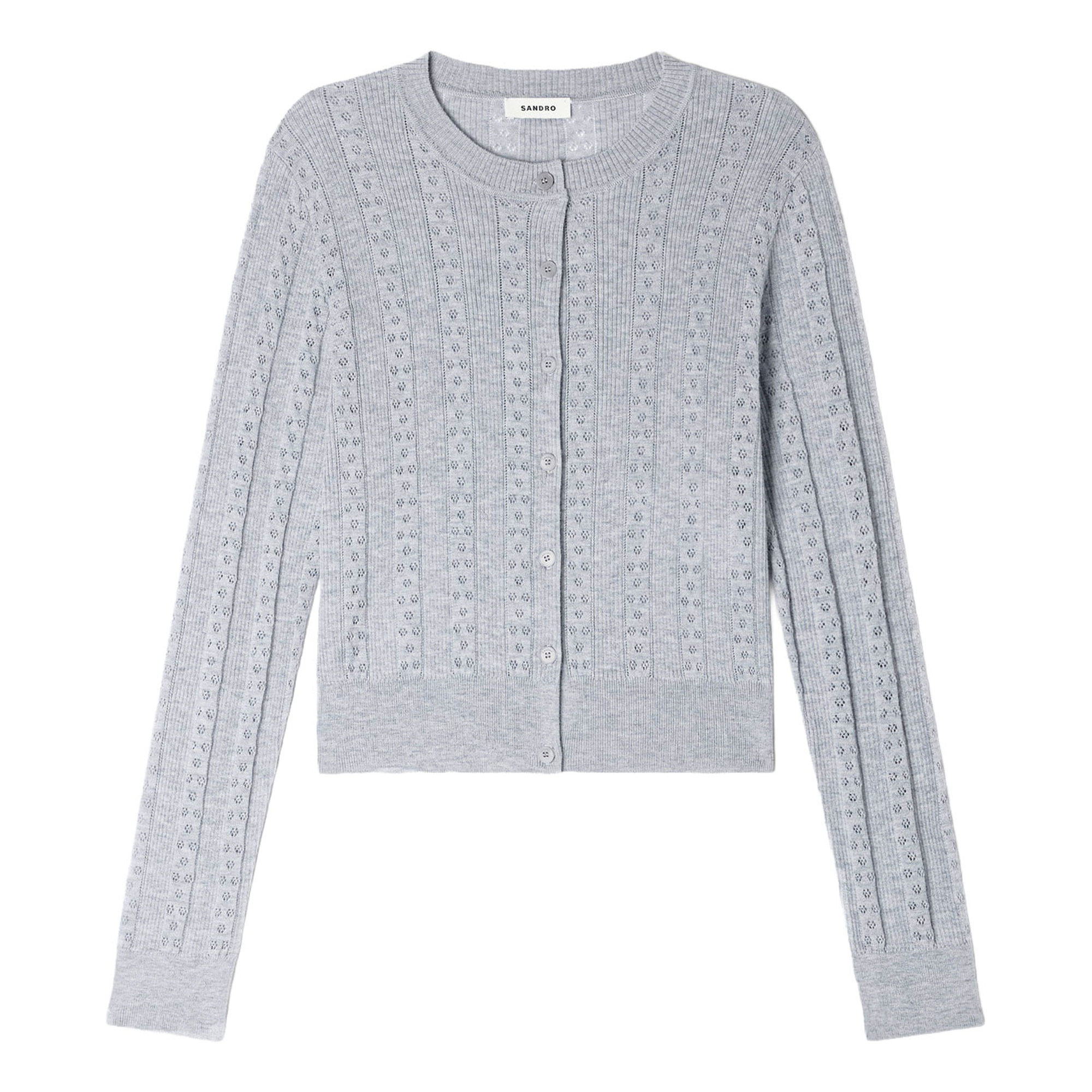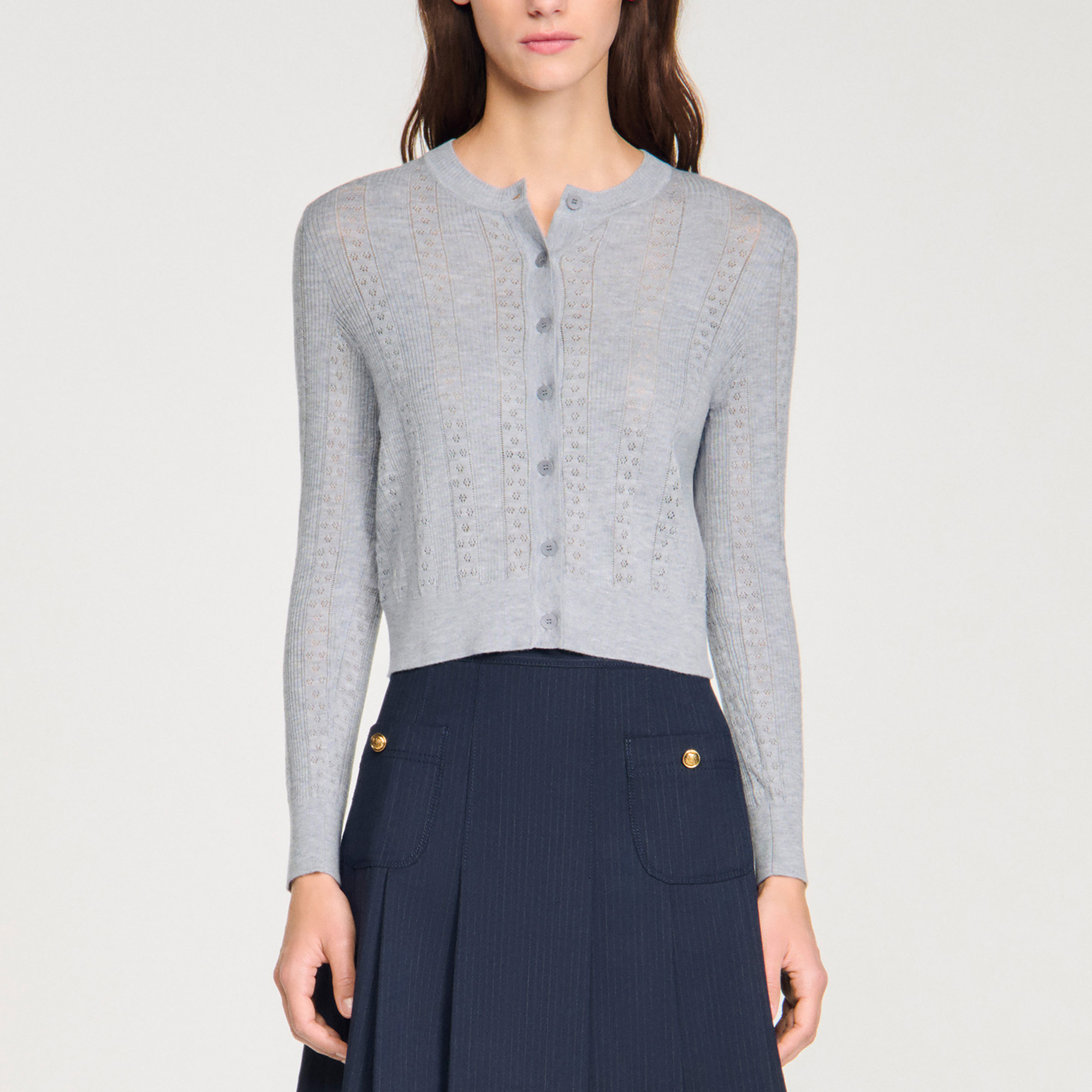 • Straight-cut, pointelle knit, round neckline, long sleeves, button fastening, ribbed trim on neckline, cuffs and hem