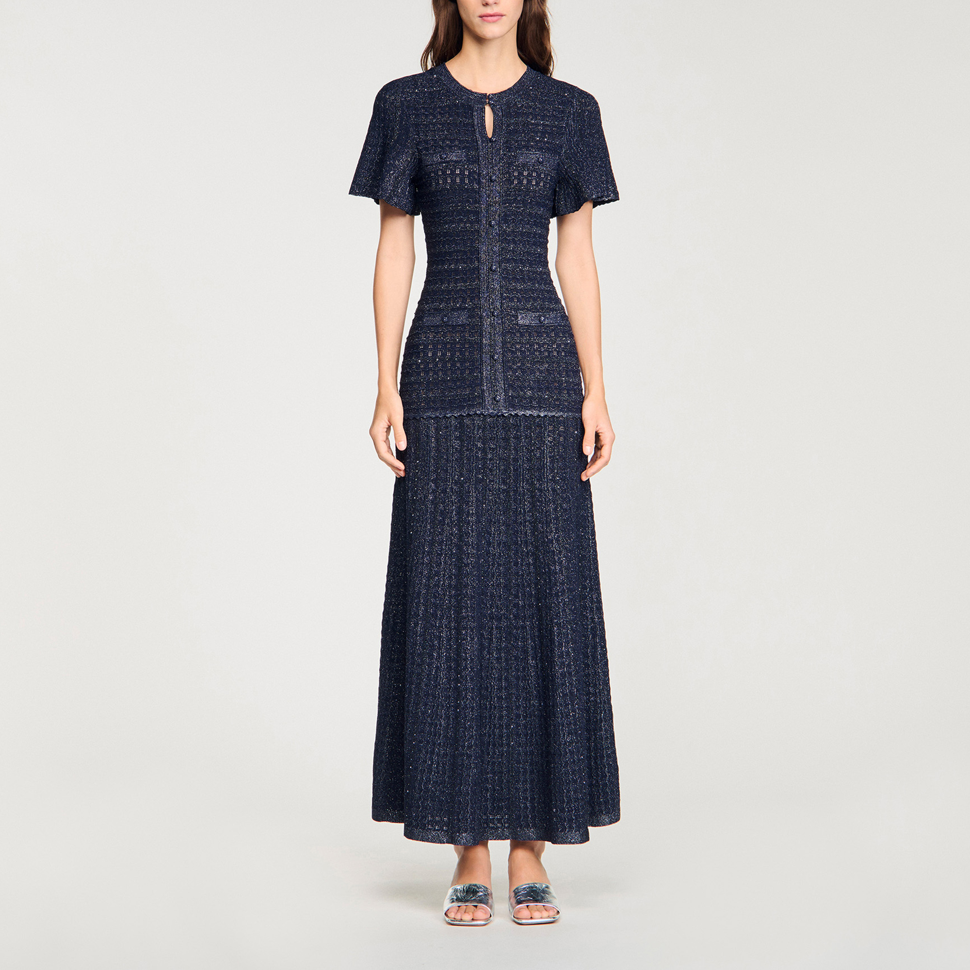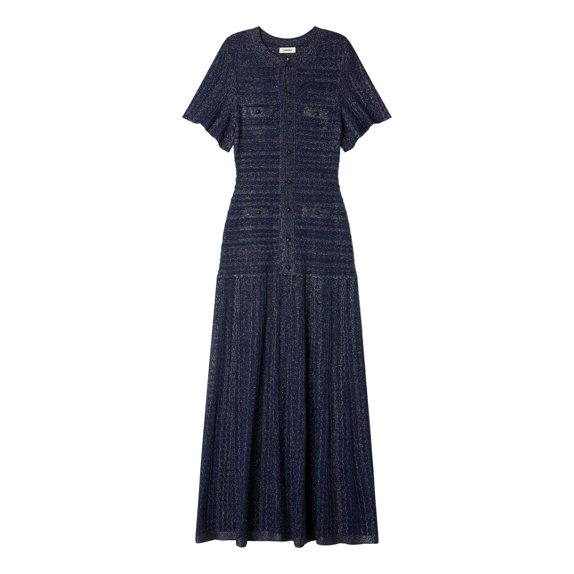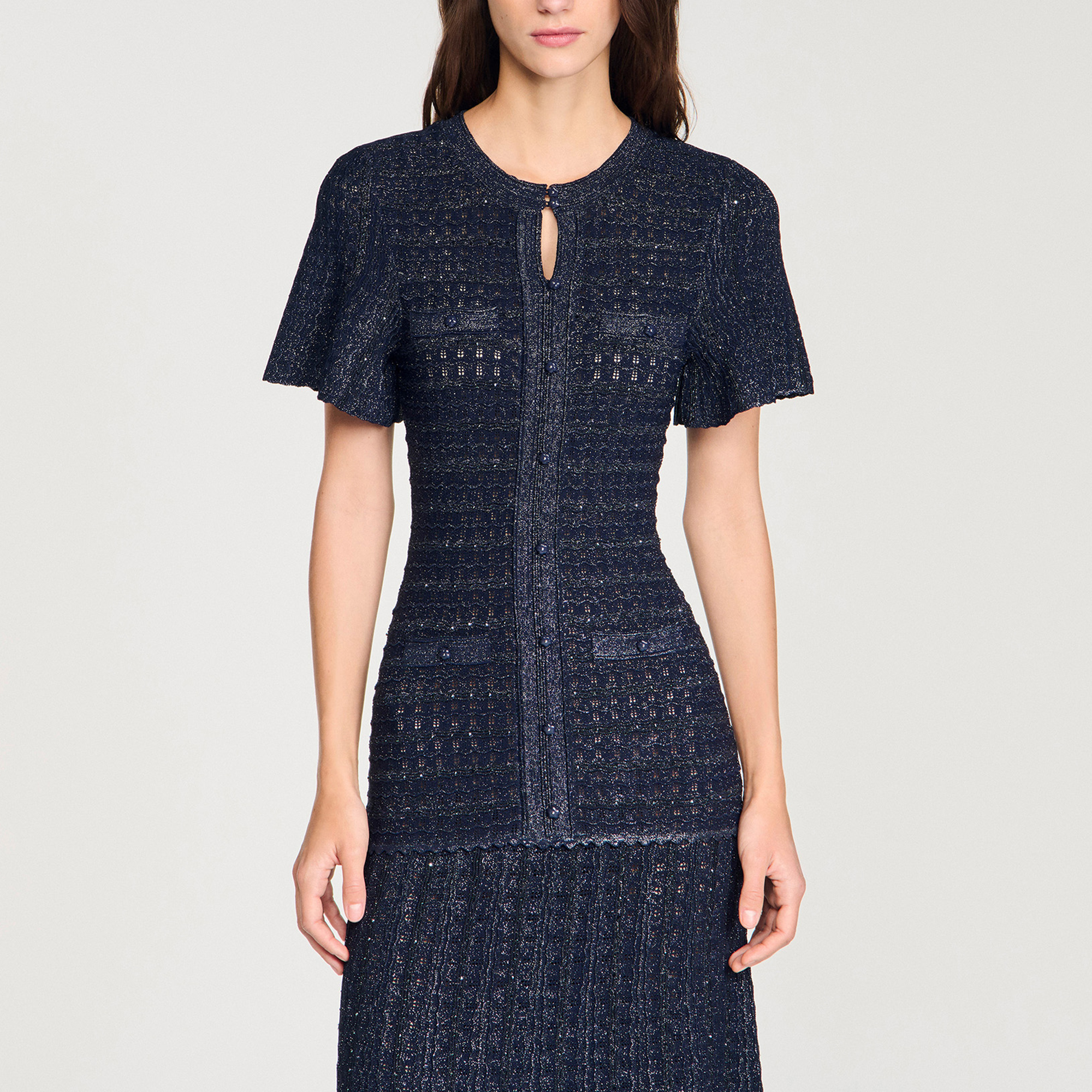 - Round neck, flared short sleeves, front button fastening, decorative welt pockets, flared skirt, textured knit construction, rhinestone embellishments