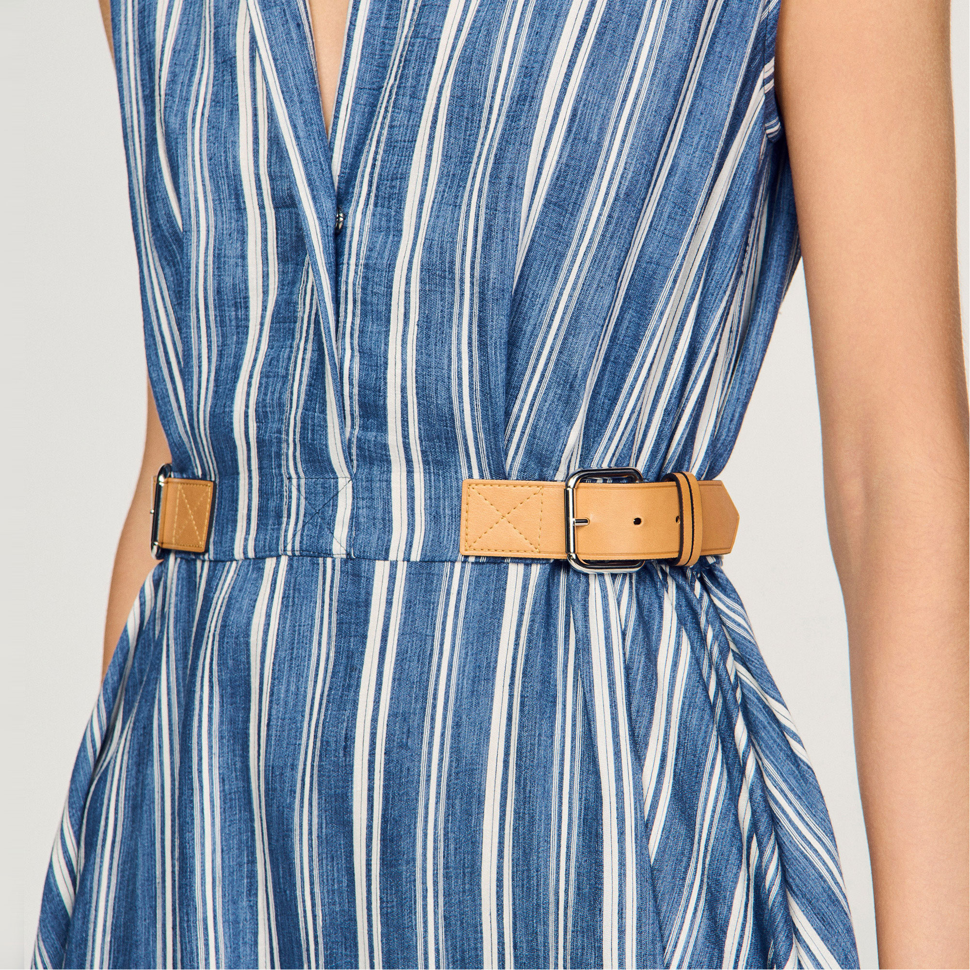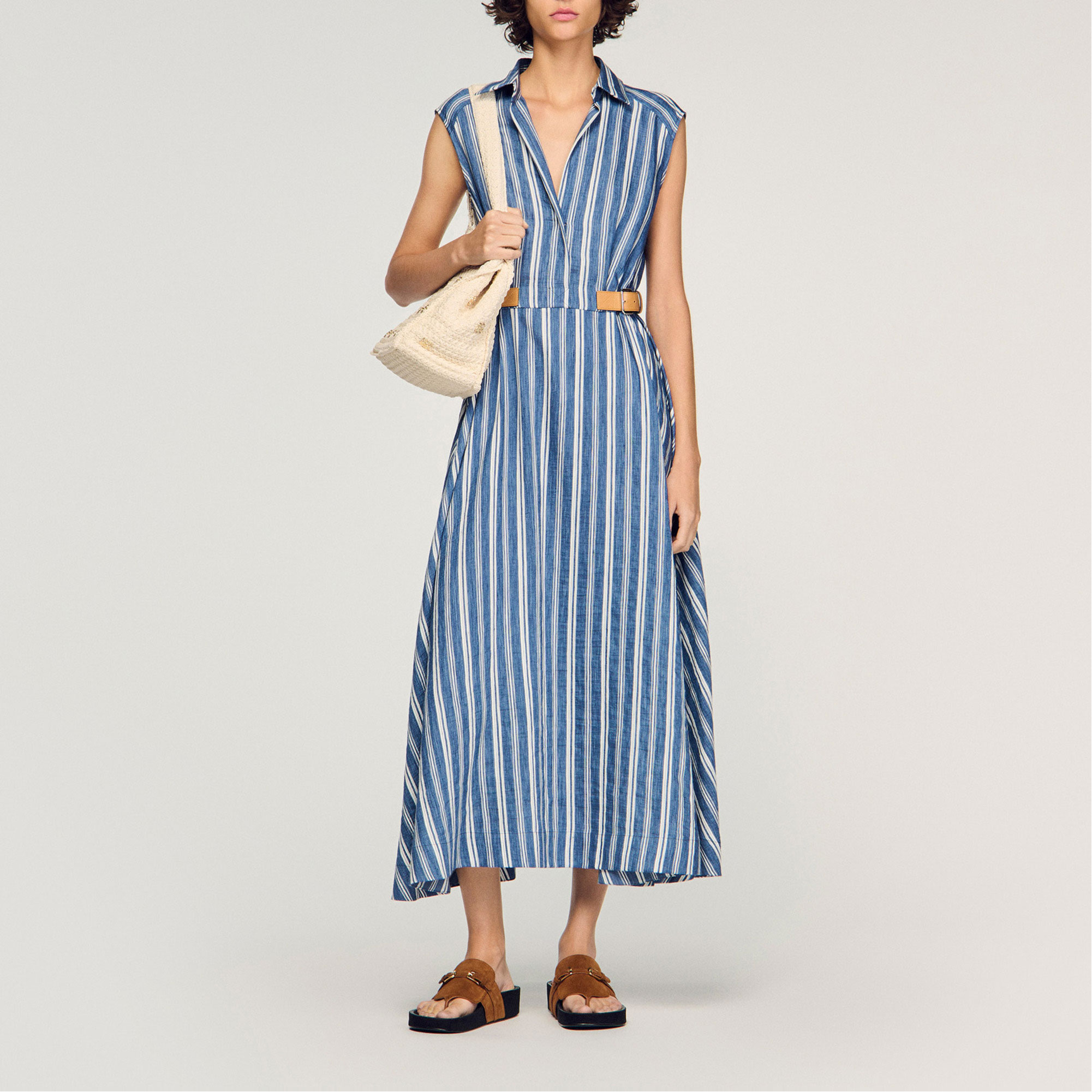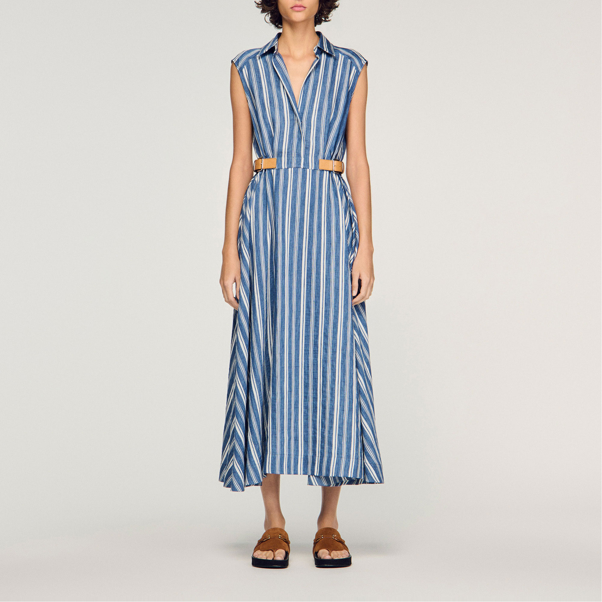 - Maxi silhouette, striped, shirt collar, flared skirt, V-neckline, concealed press studs, sleeveless, semi-elasticated waistband, waist cut-out detail, contrast leather tab