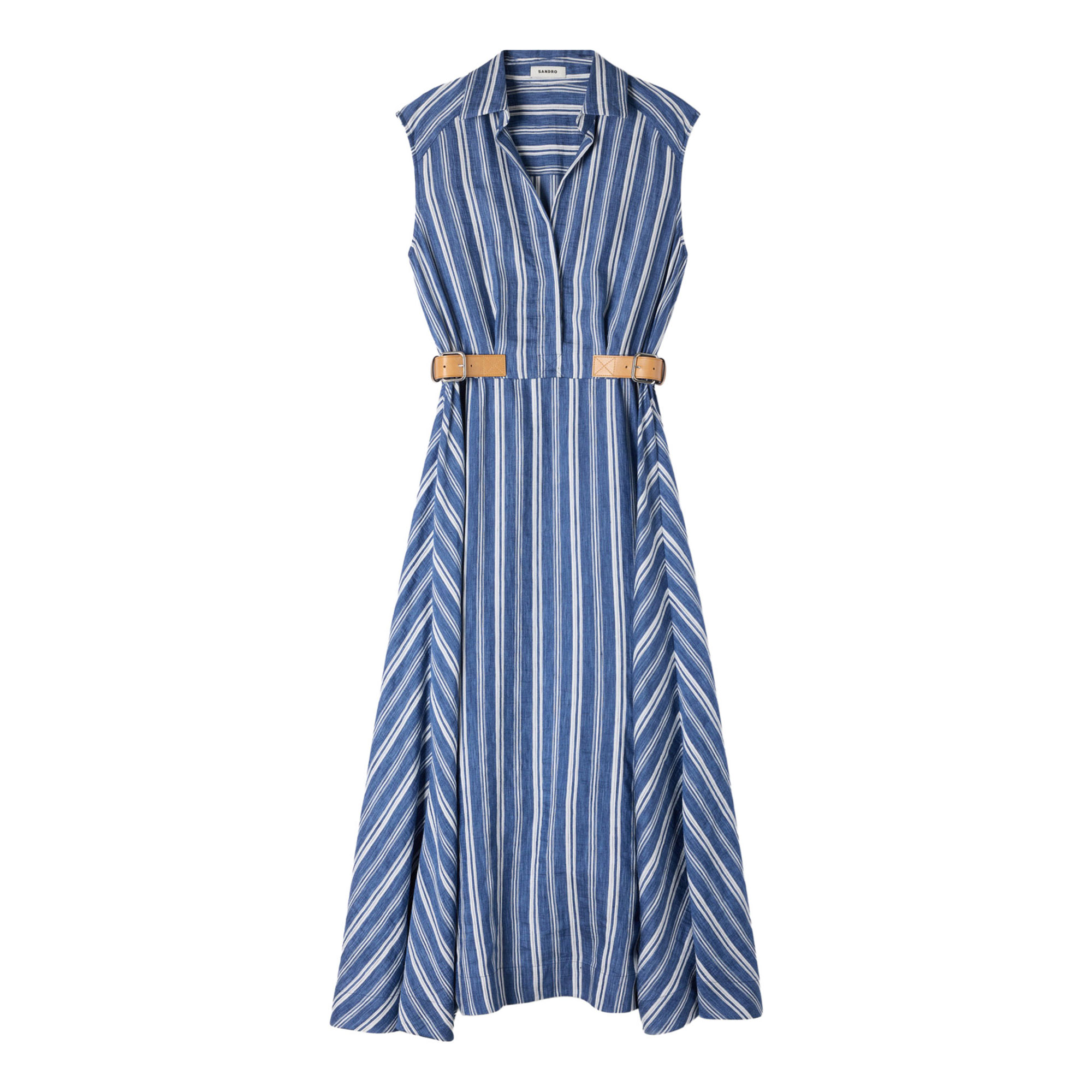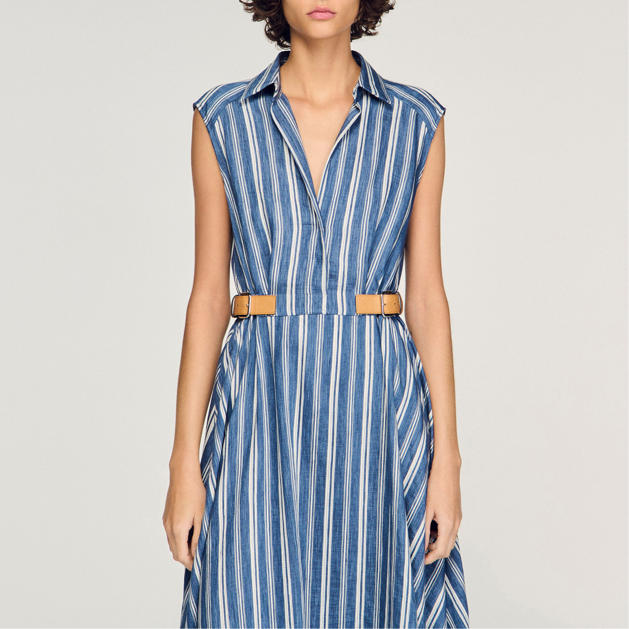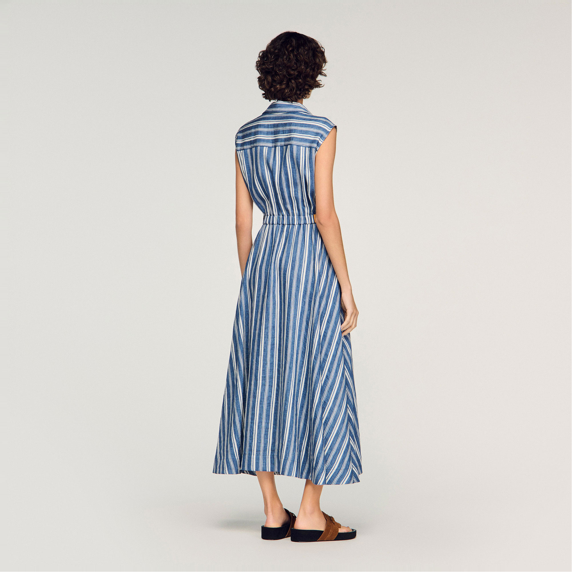 - Maxi silhouette, striped, shirt collar, flared skirt, V-neckline, concealed press studs, sleeveless, semi-elasticated waistband, waist cut-out detail, contrast leather tab