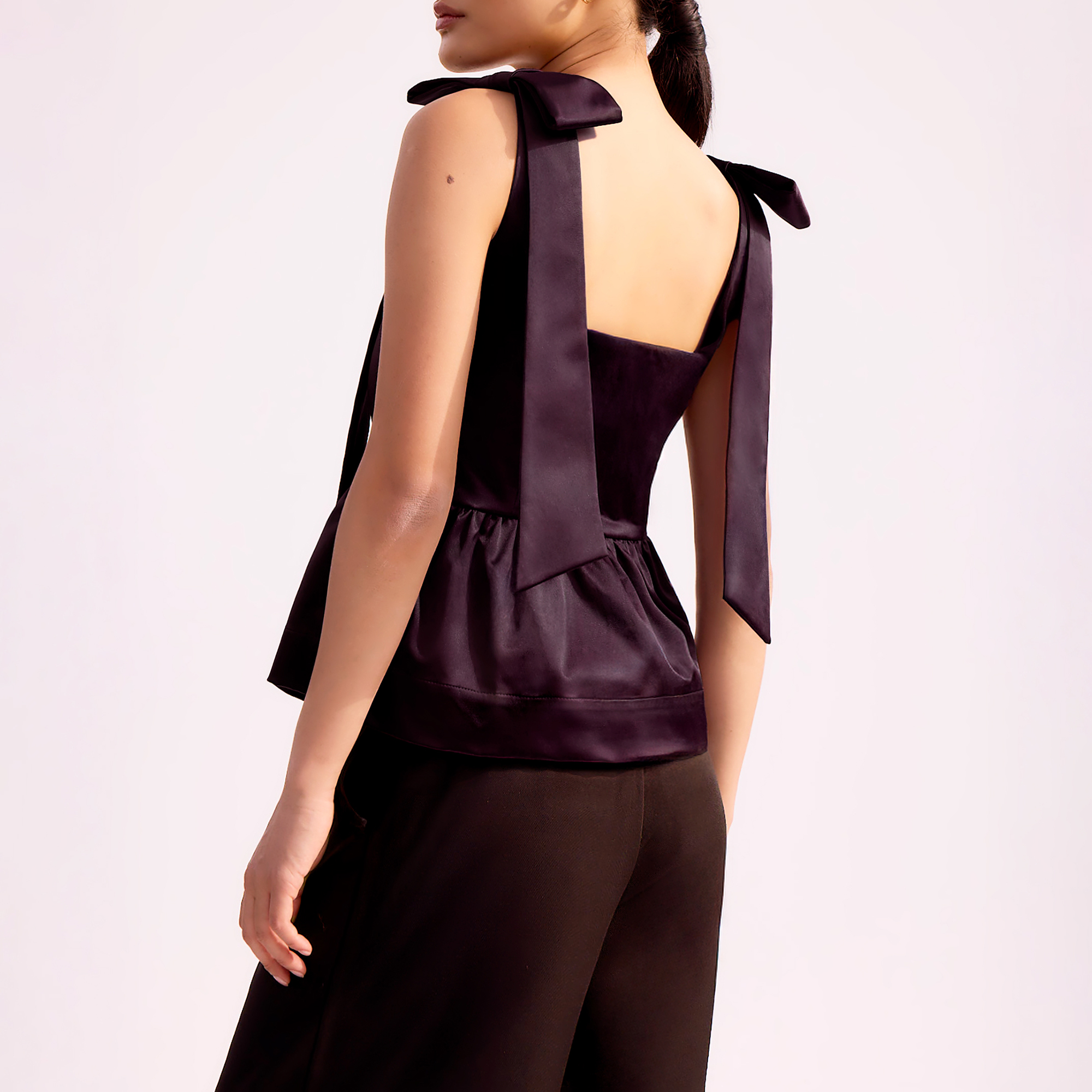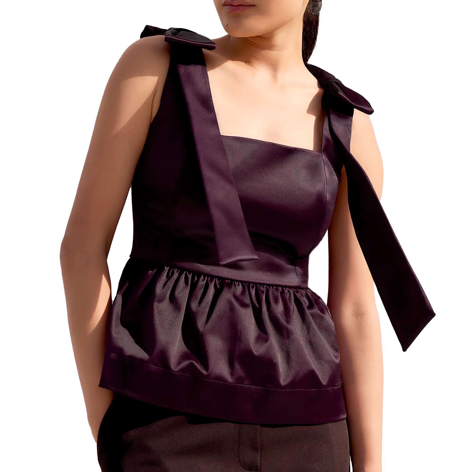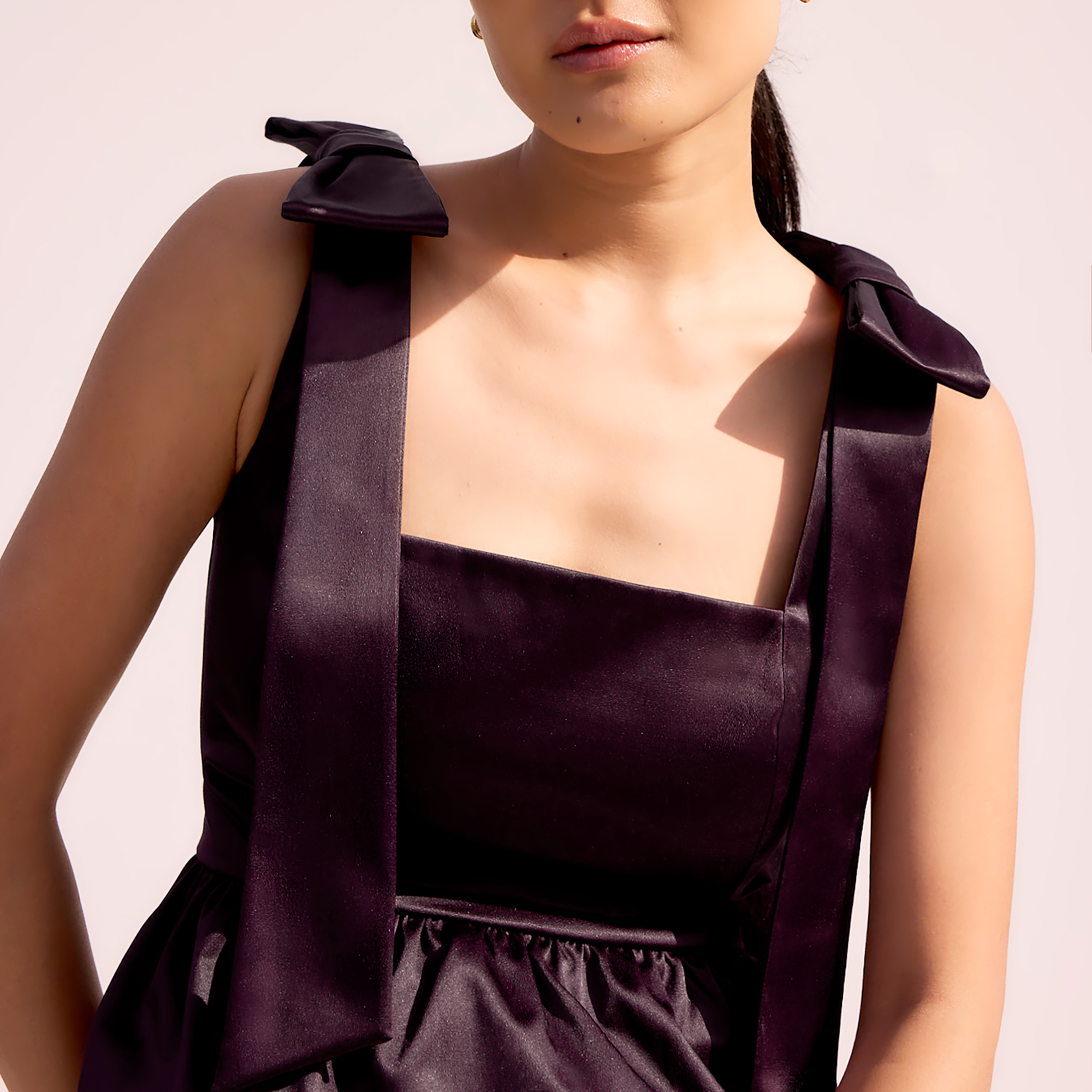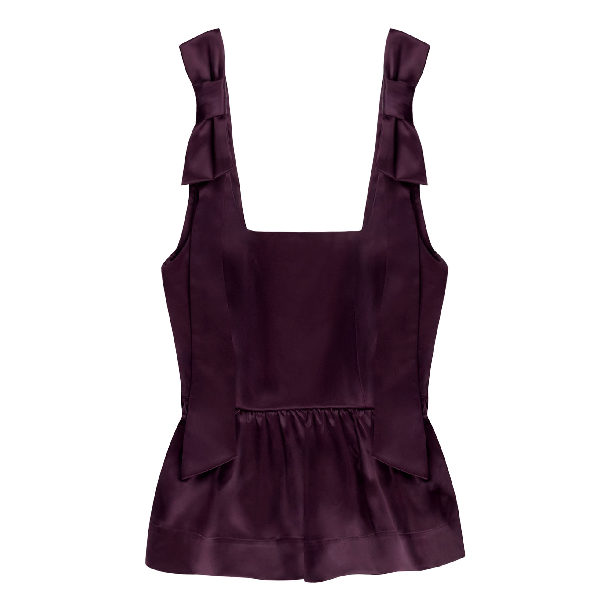 - Square neckline, wide straps with bow detailing, tailored waist, peplum hem, satin finish