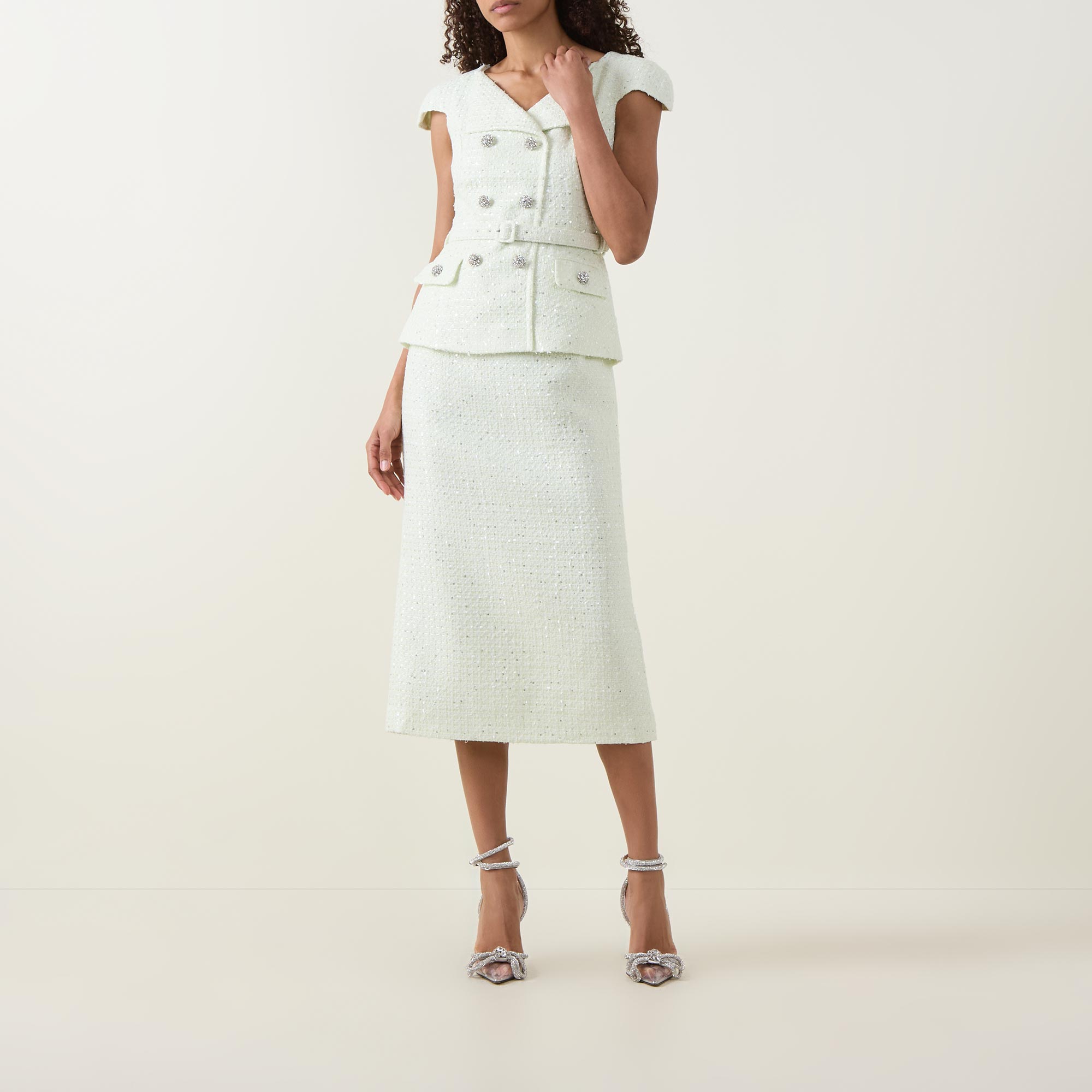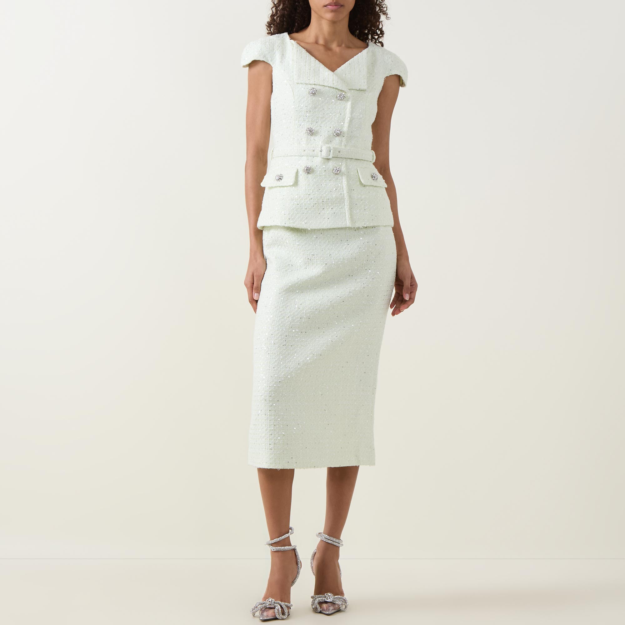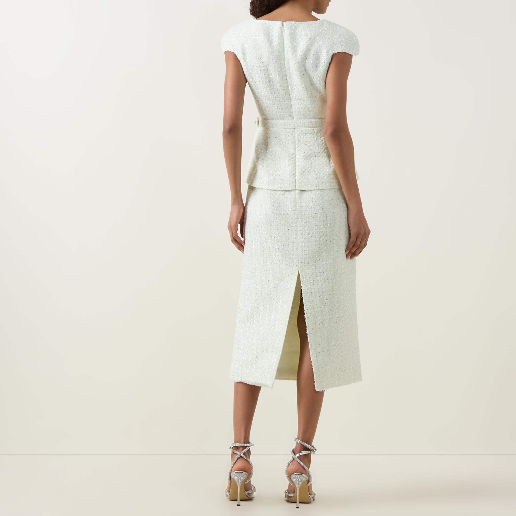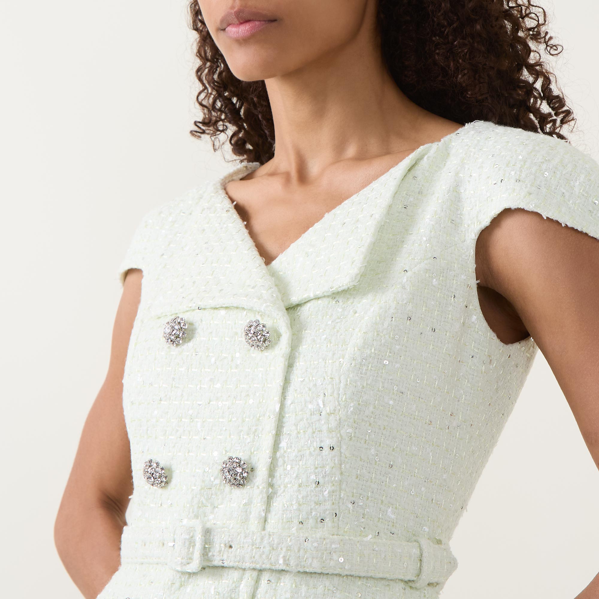 - Pencil fit, short sleeves, midi length, boucle fabric, removable belt, concealed rear zip fastening, two side pockets, face framing collar