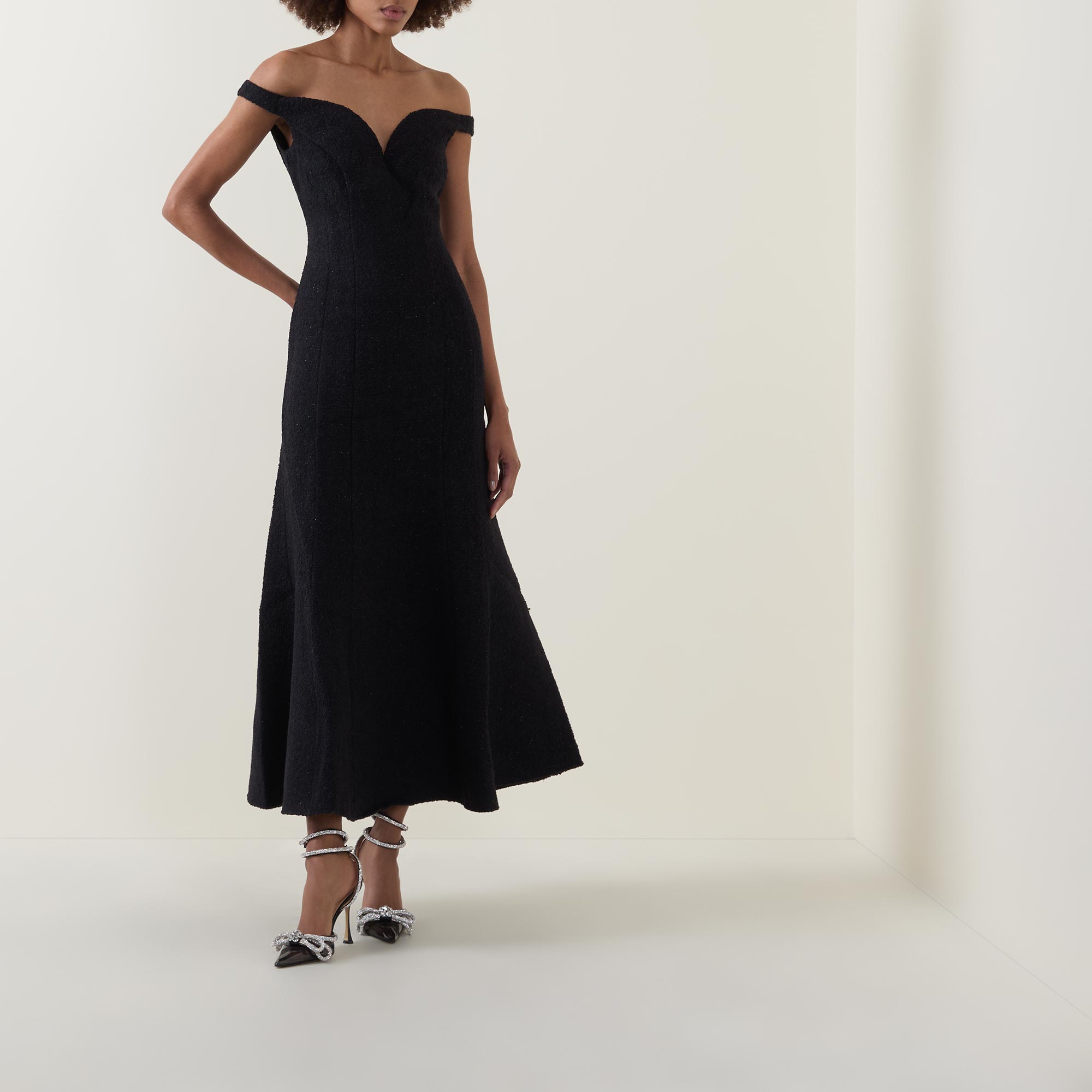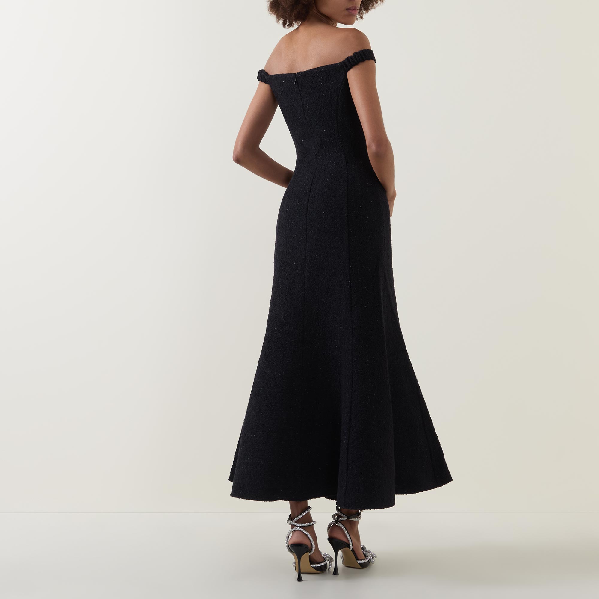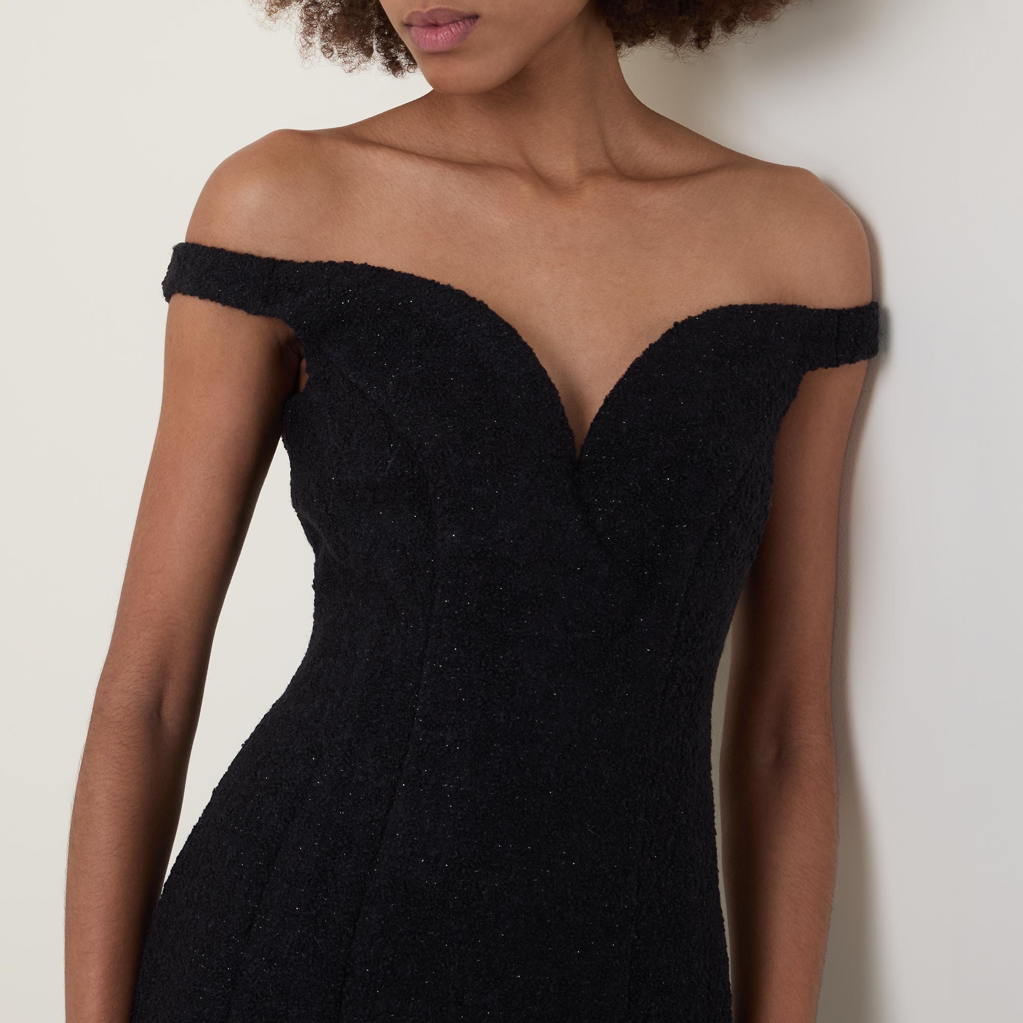 • Off-the-shoulder design, sweetheart neckline, back zip-fastening closure, fitted silhouette, flared pleated hemline, textured bouclé finish