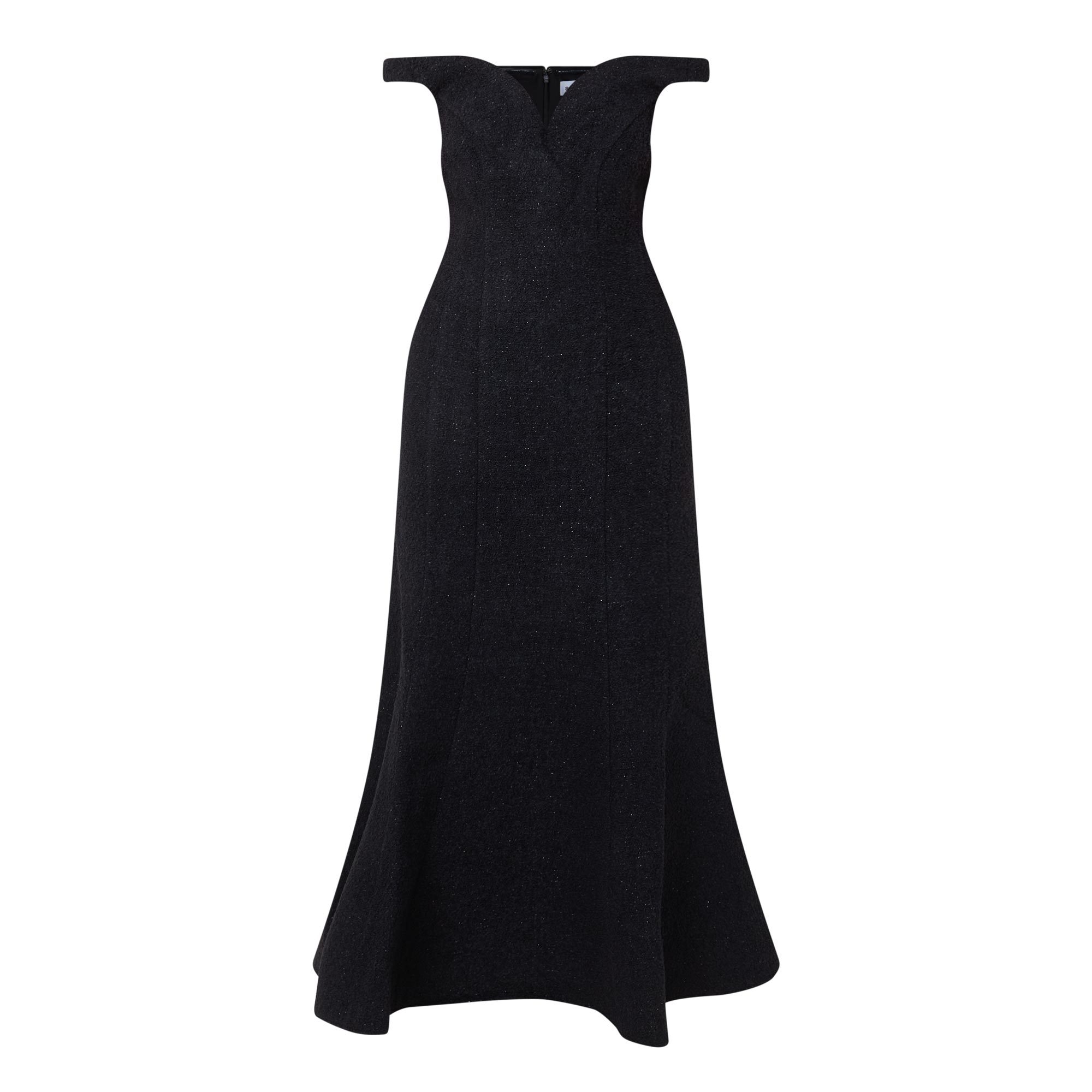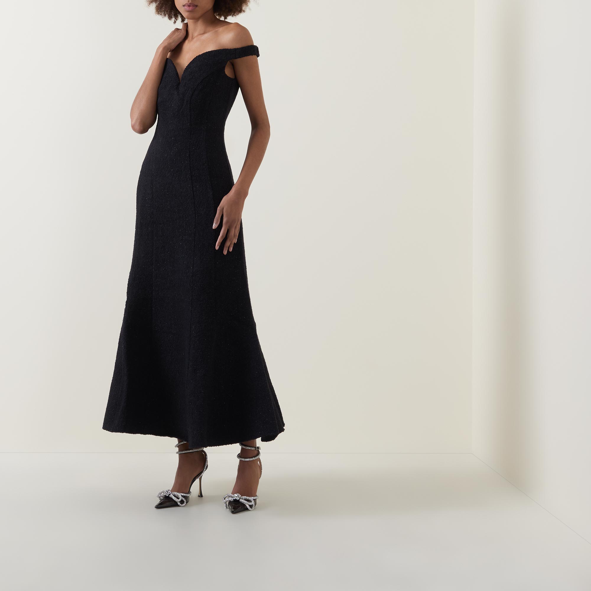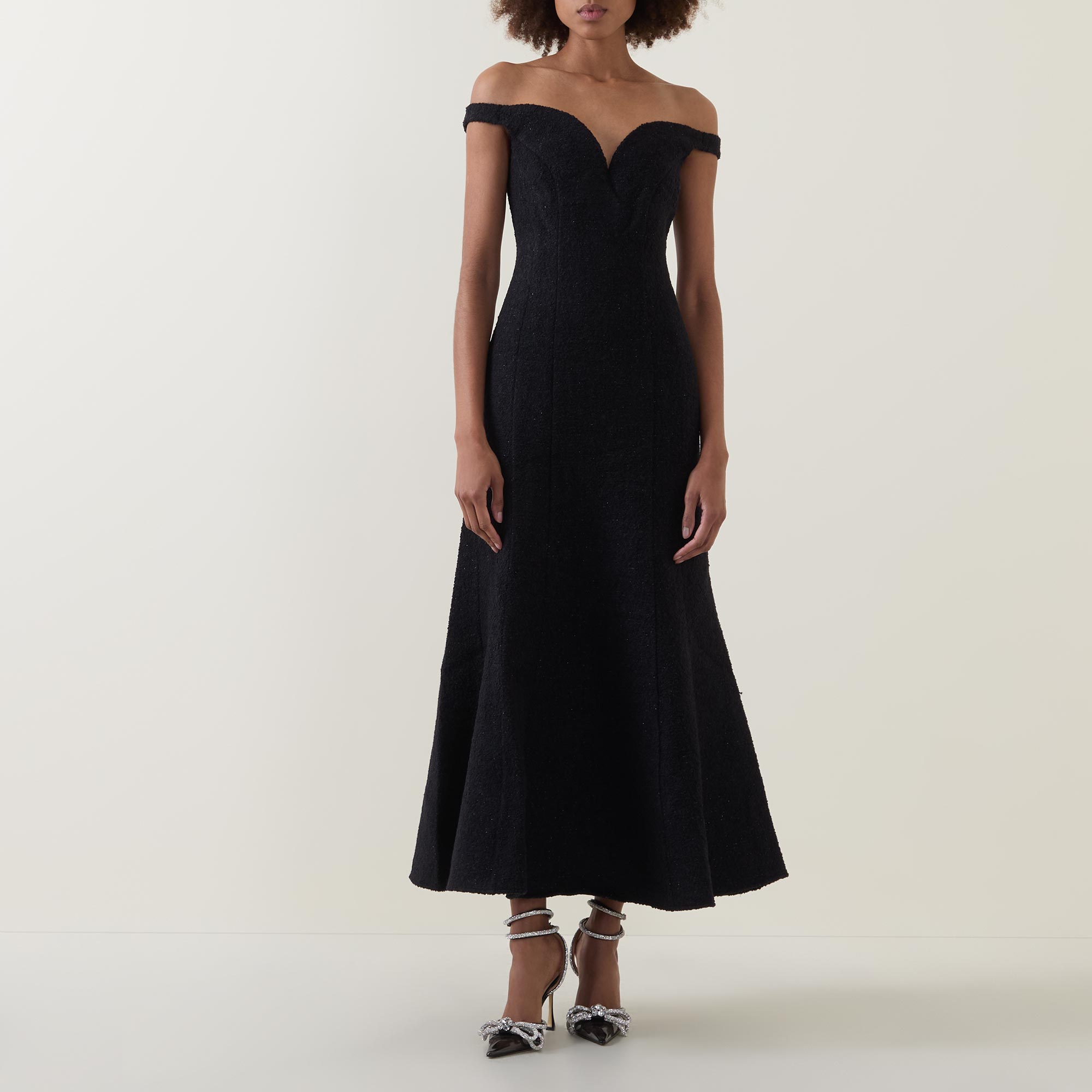 • Off-the-shoulder design, sweetheart neckline, back zip-fastening closure, fitted silhouette, flared pleated hemline, textured bouclé finish