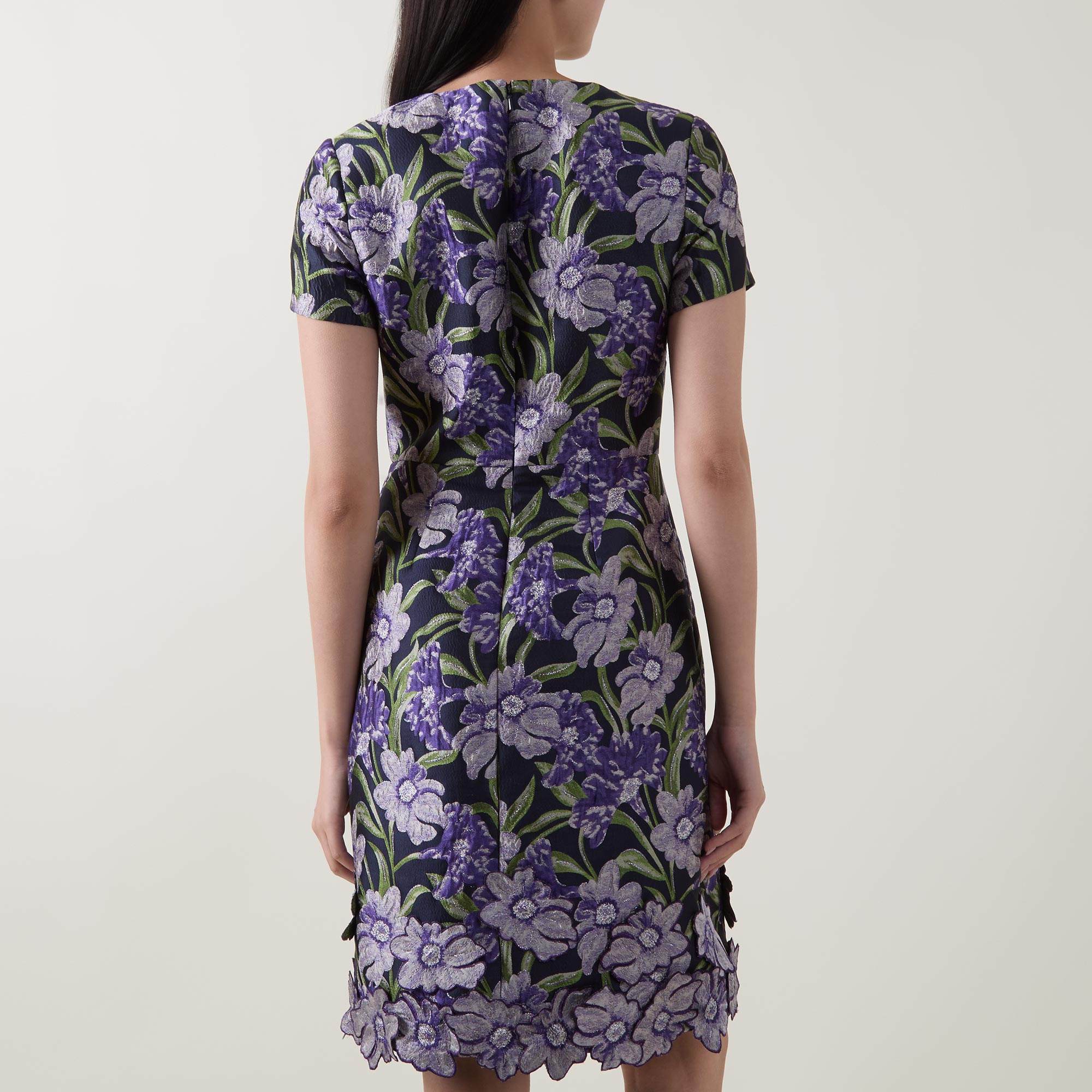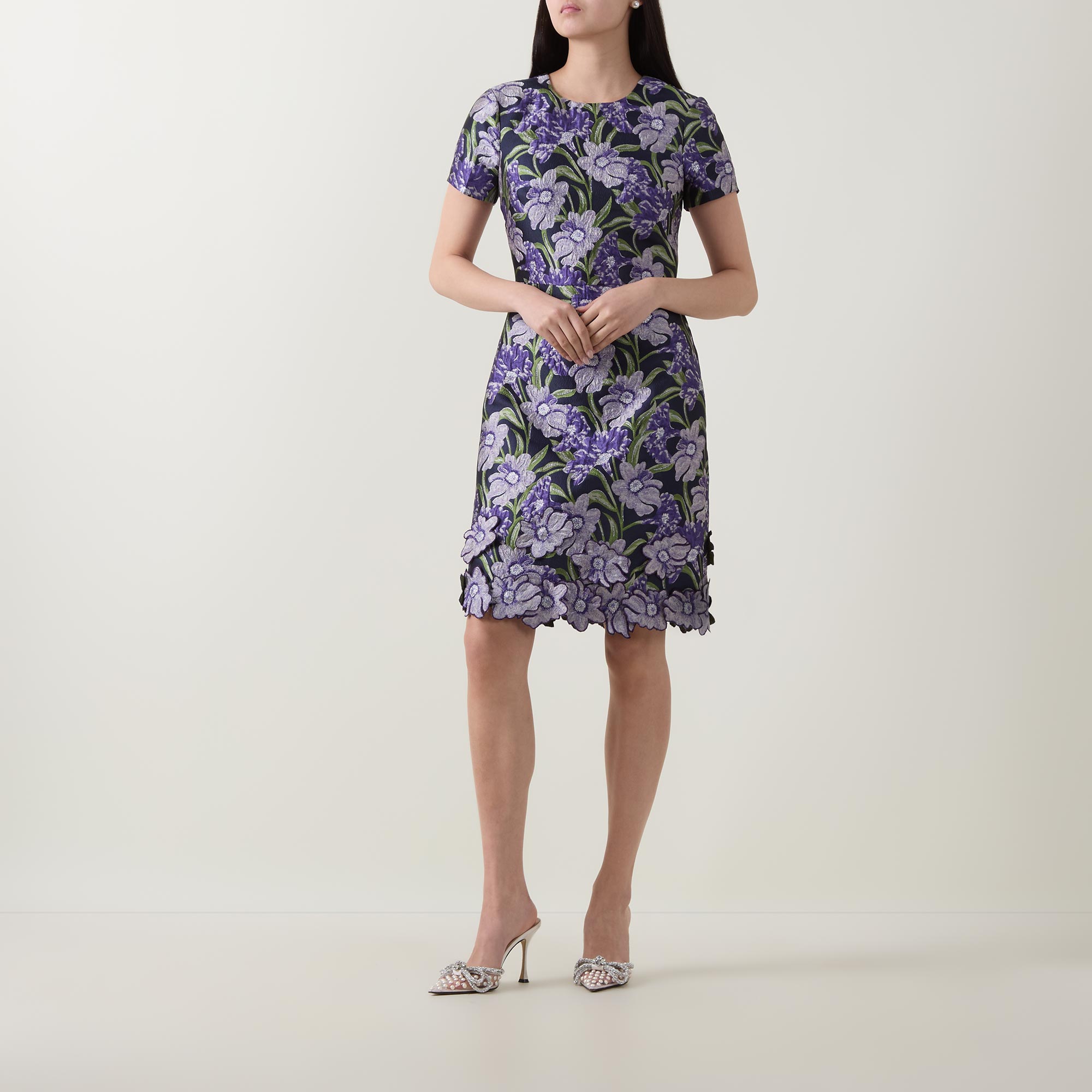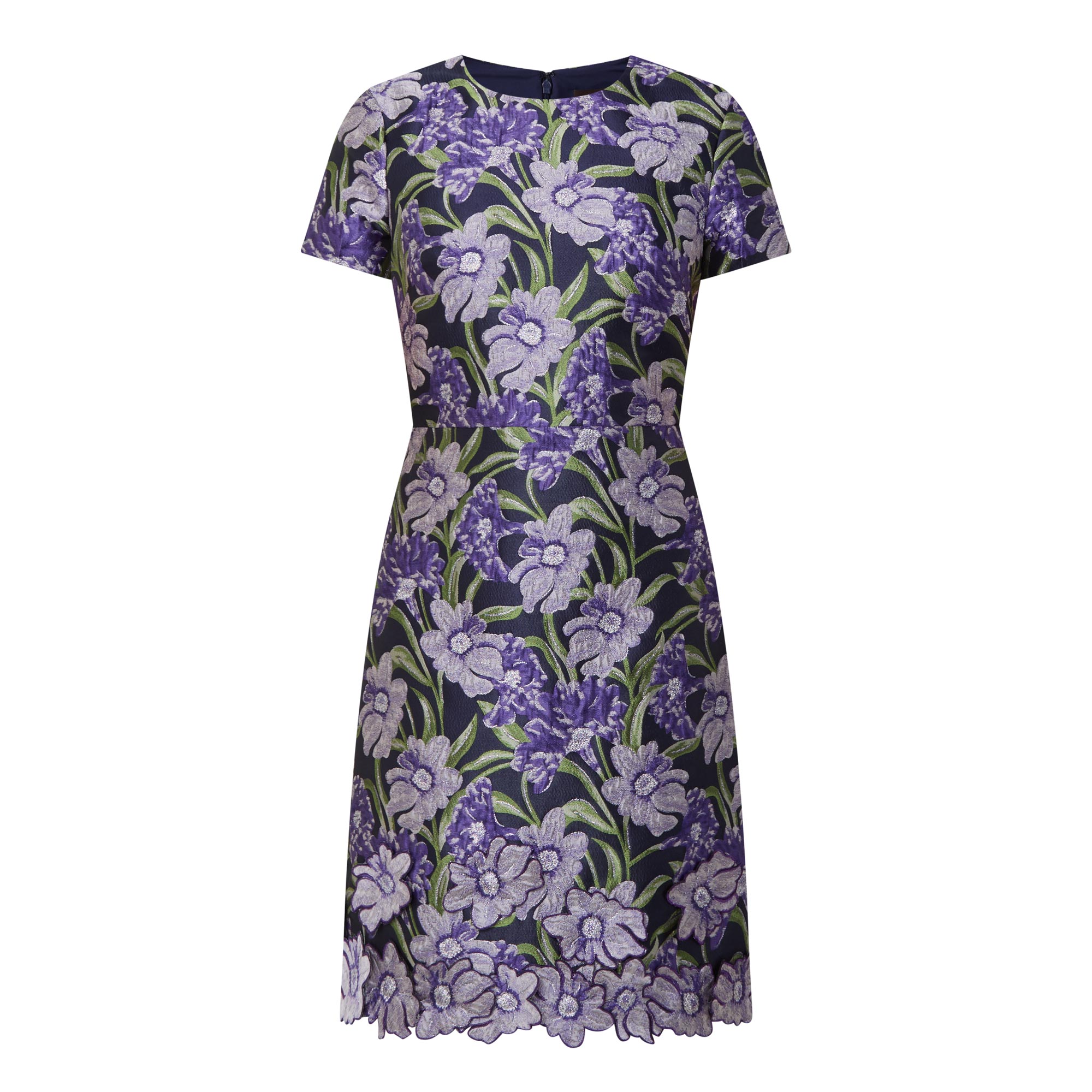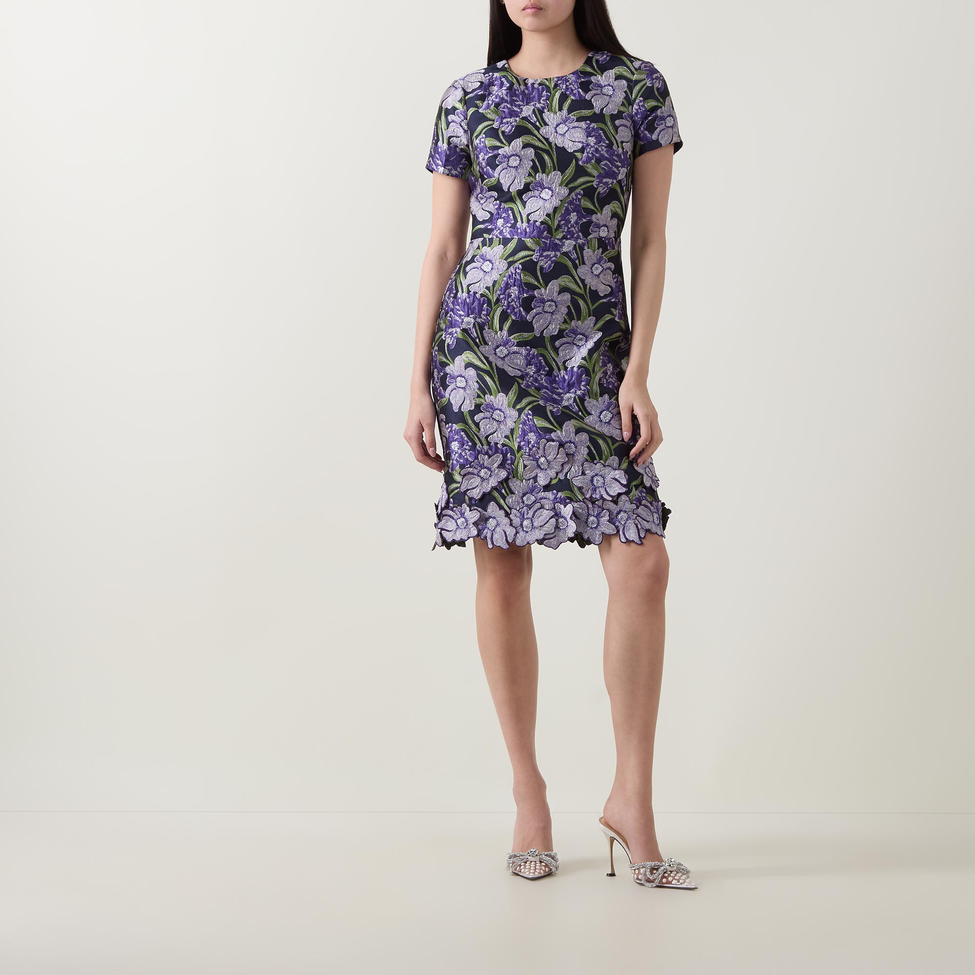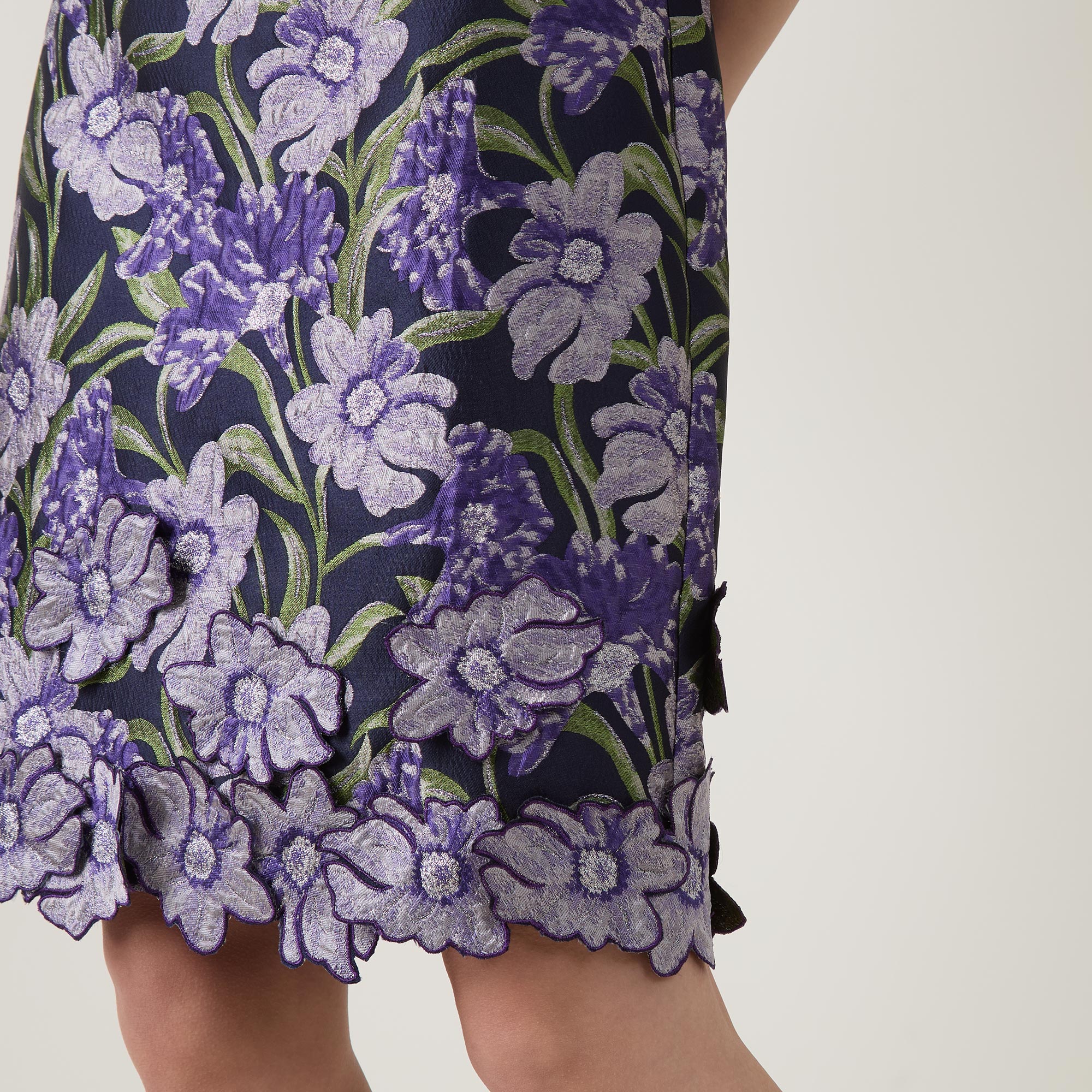 - Round neckline, short sleeves, mini length, zip fastening to the back, floral jacquard pattern