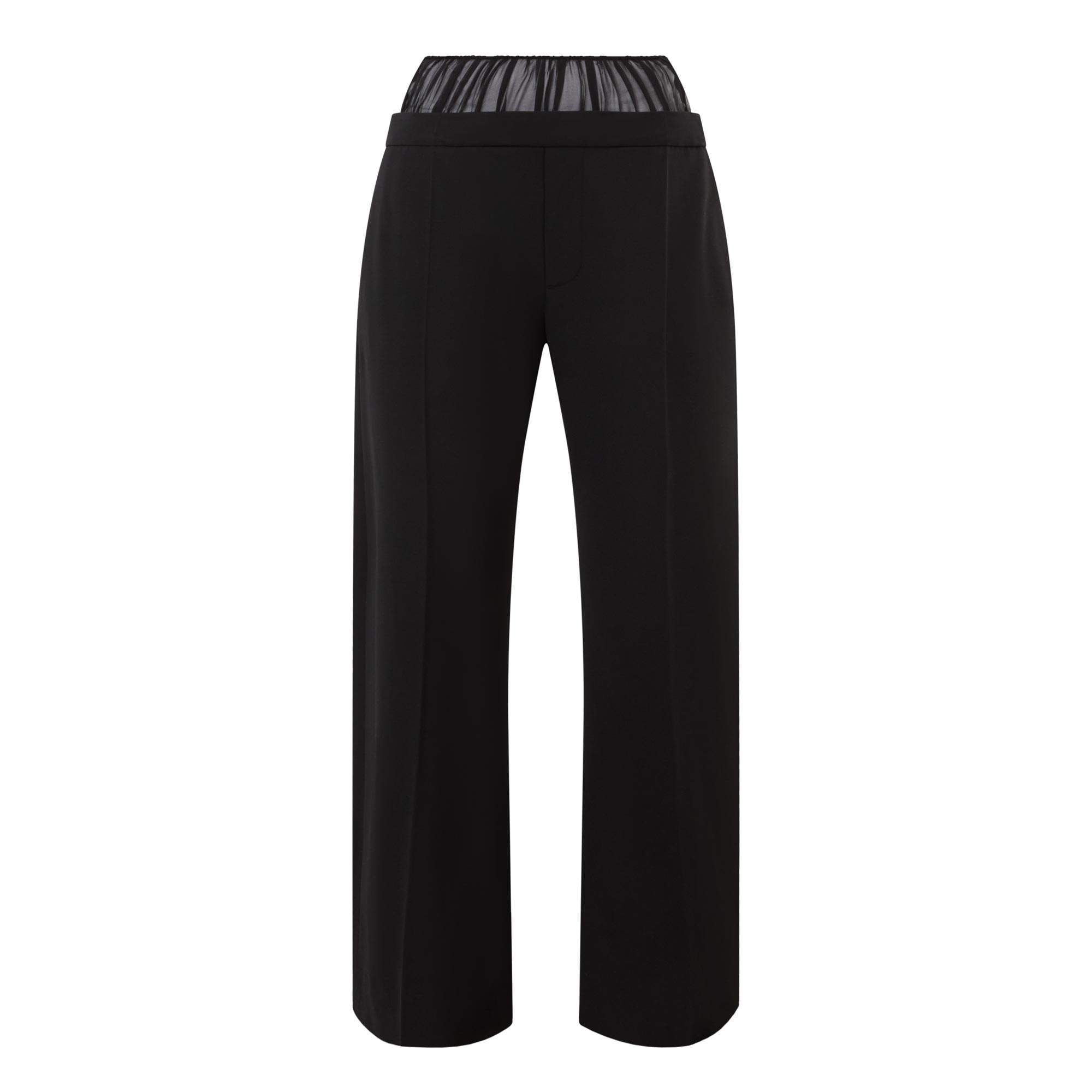 • Mid-rise, sheer panel design, wide-leg, full length, covered waistband, mock fly, two side in seam pockets, one rear welt pocket, clean hems, pressed creases