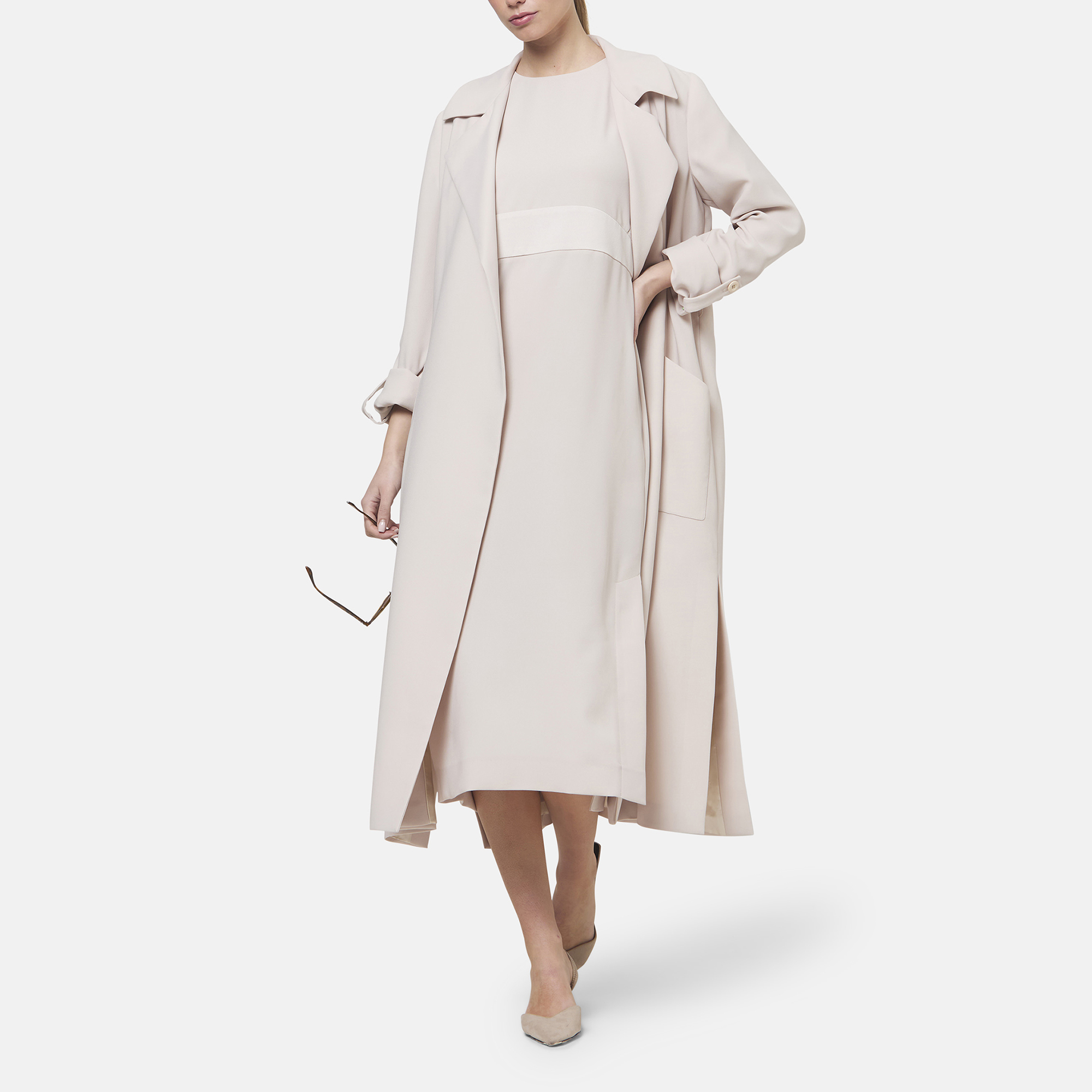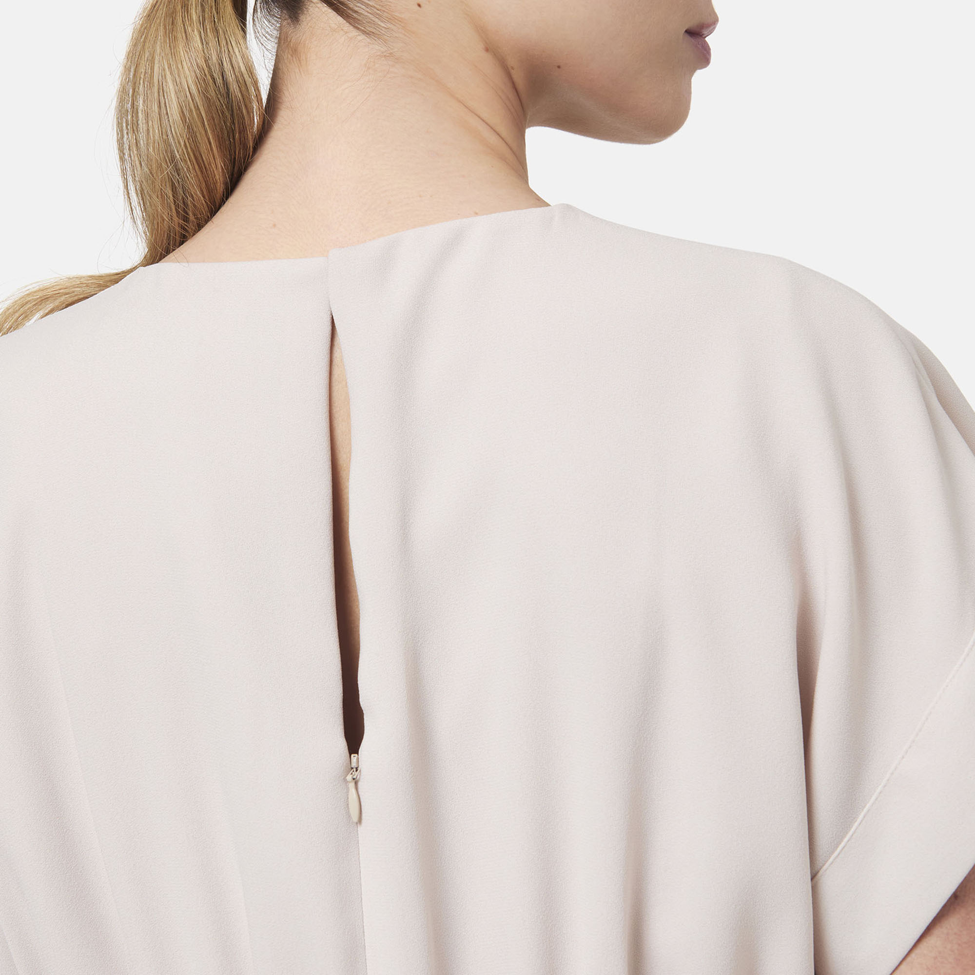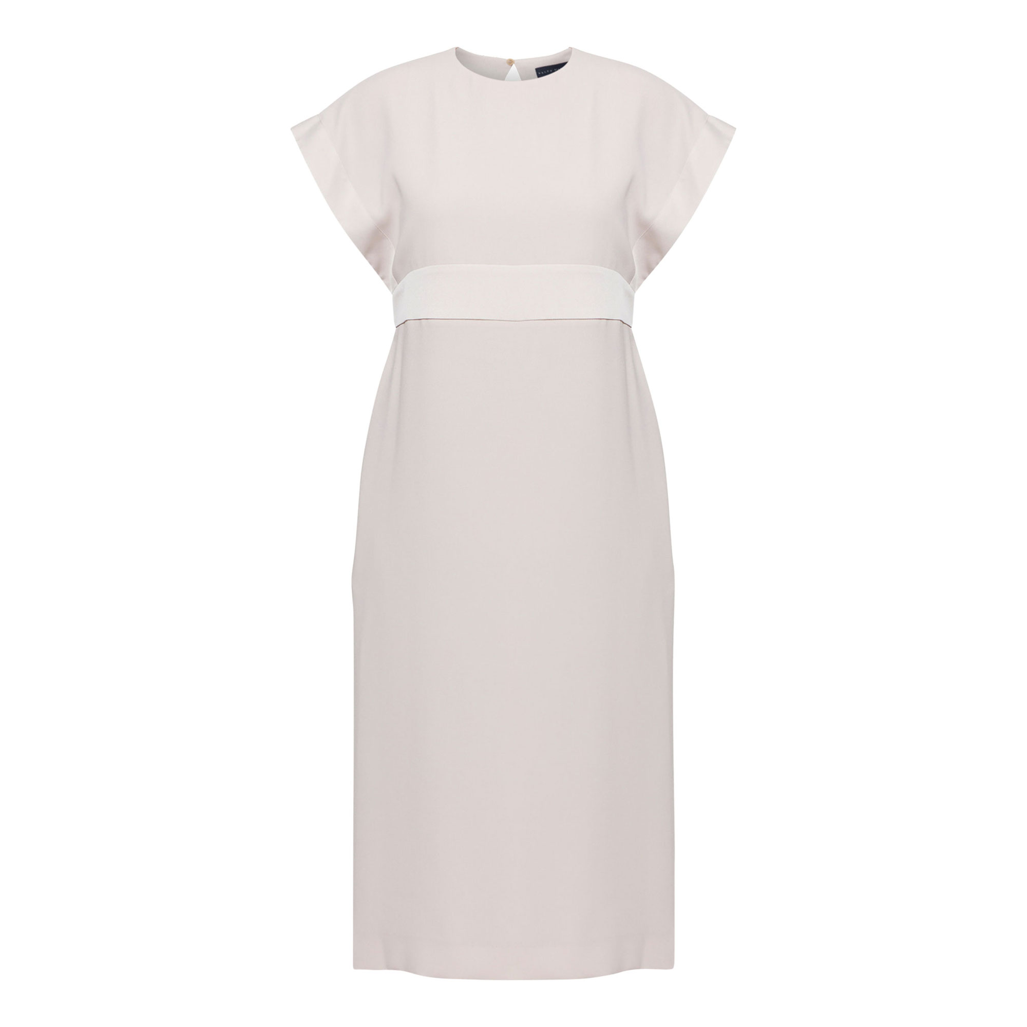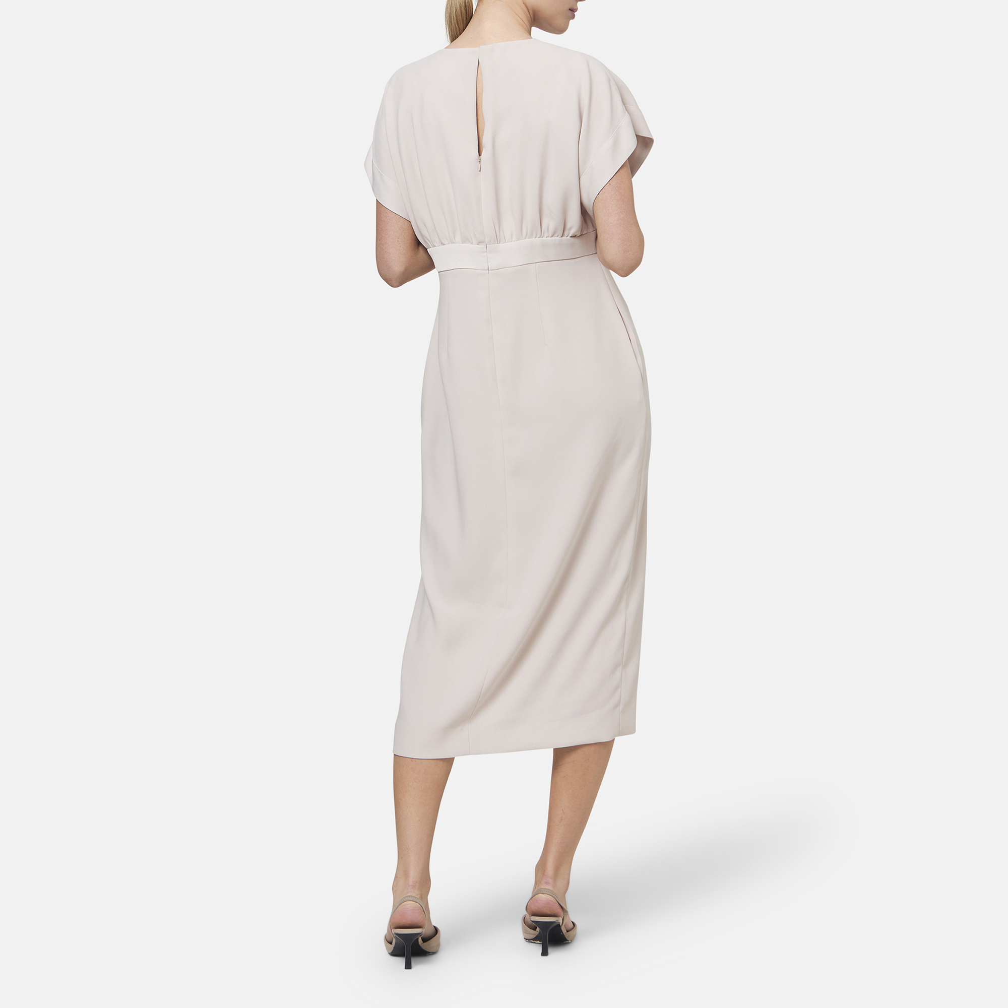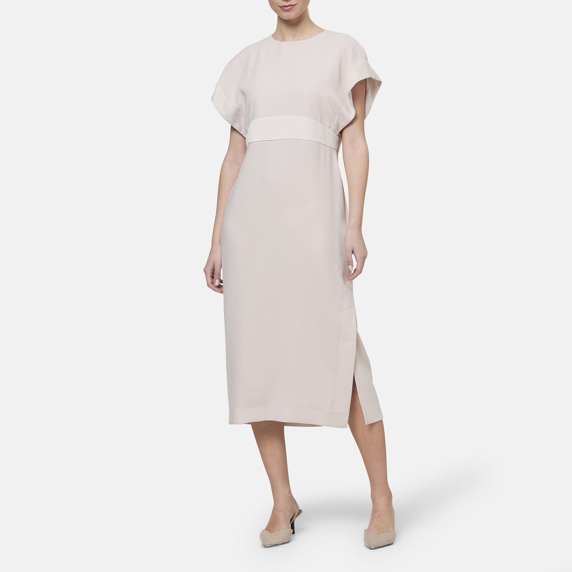 - Round neck, dropped sleeves, gathered back waist seam, side slit for ease of movement, straight hem, side split detail, satin-back crepe fabric, midi length