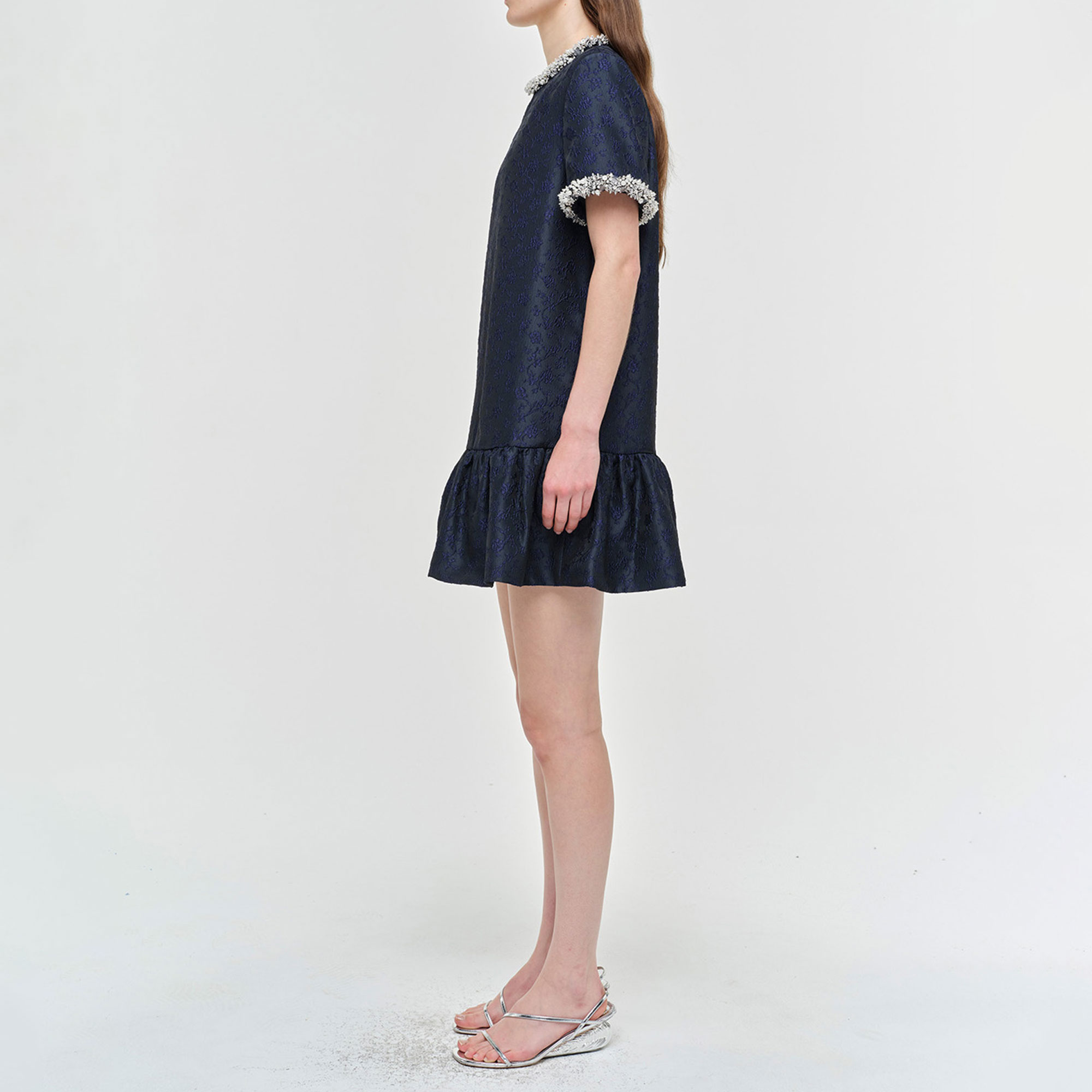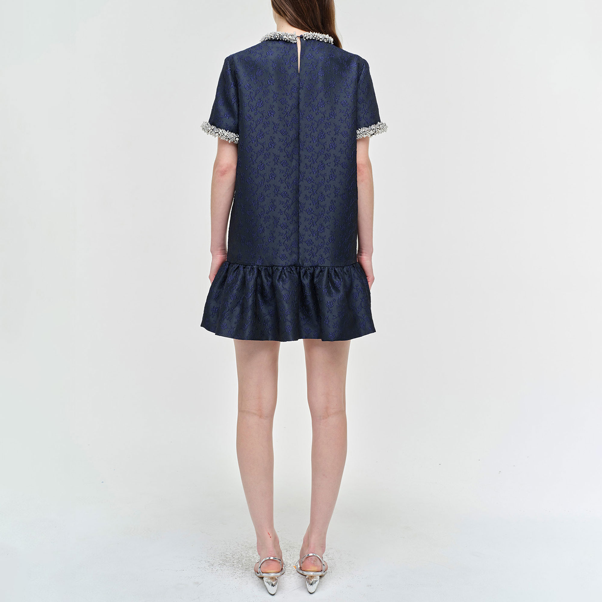 - Round neck, short sleeves, mini length, keyhole fastening, embellished trim, ruffled hemline
