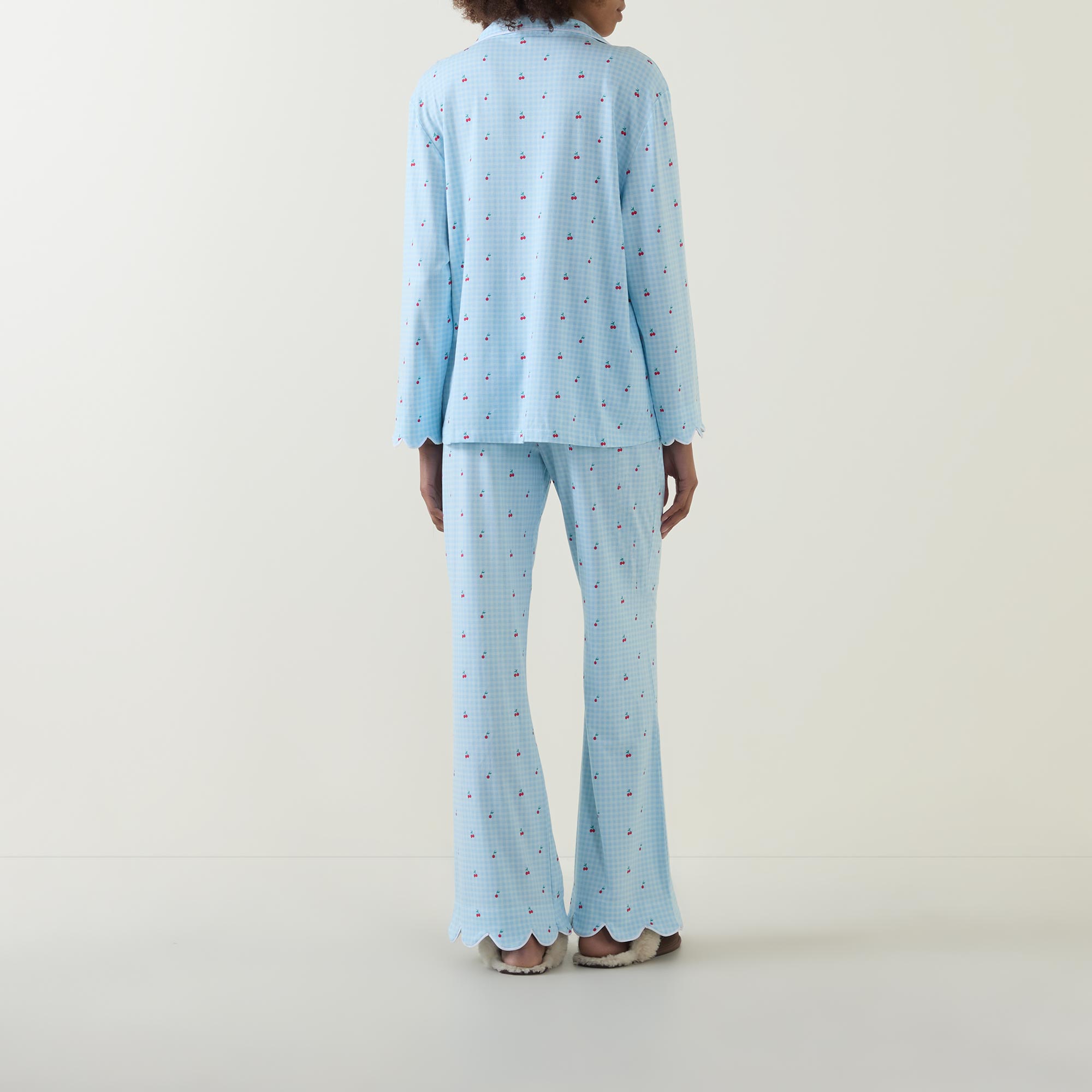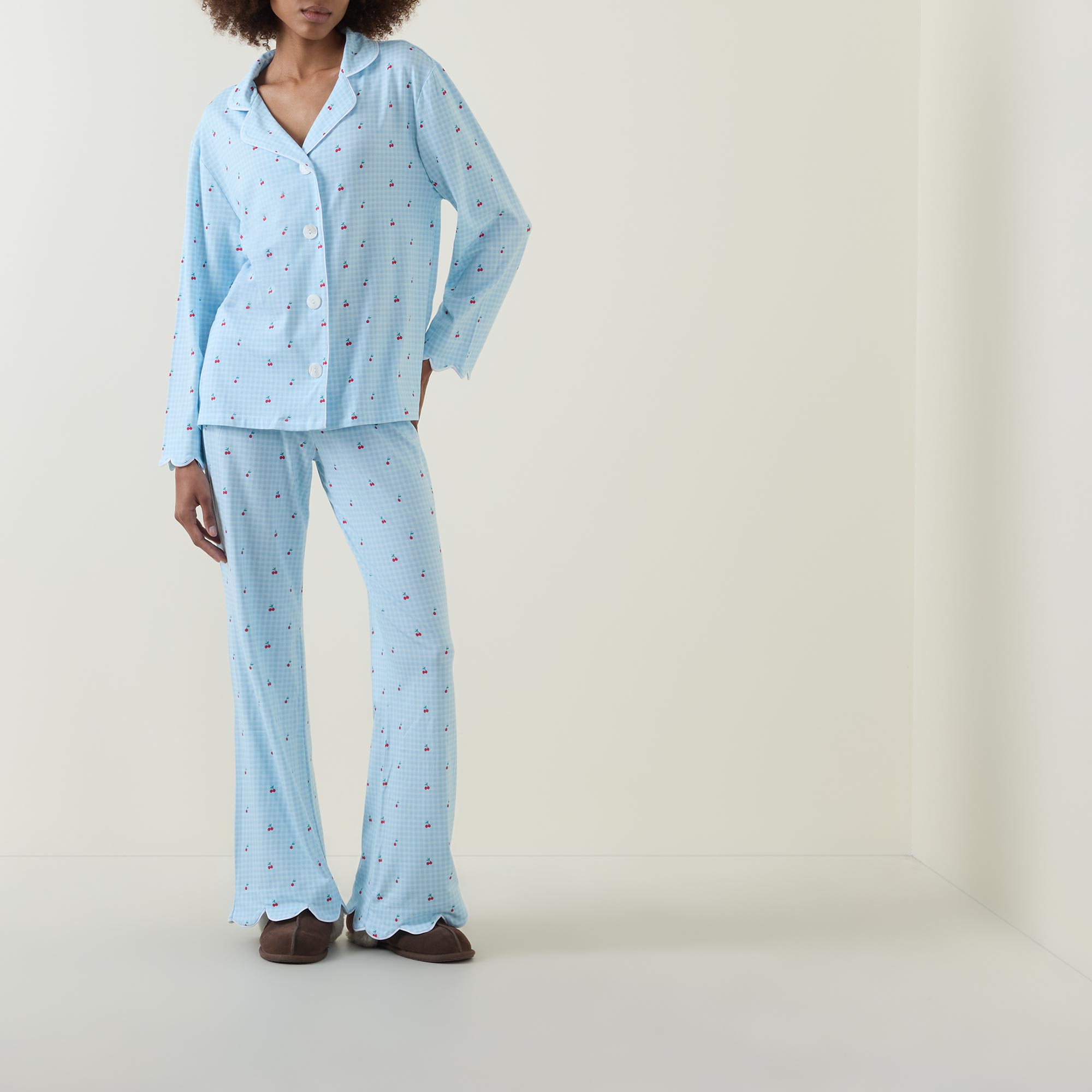 • Two-piece set, top with notch lapel collar, dropped shoulders, long sleeves, scalloped cuffs, front button fastening, straight hem, mid rise bottoms, elasticated waistband, straight leg, scalloped cuffs, contrast piping, gingham print, cherry print throughout, soft finish