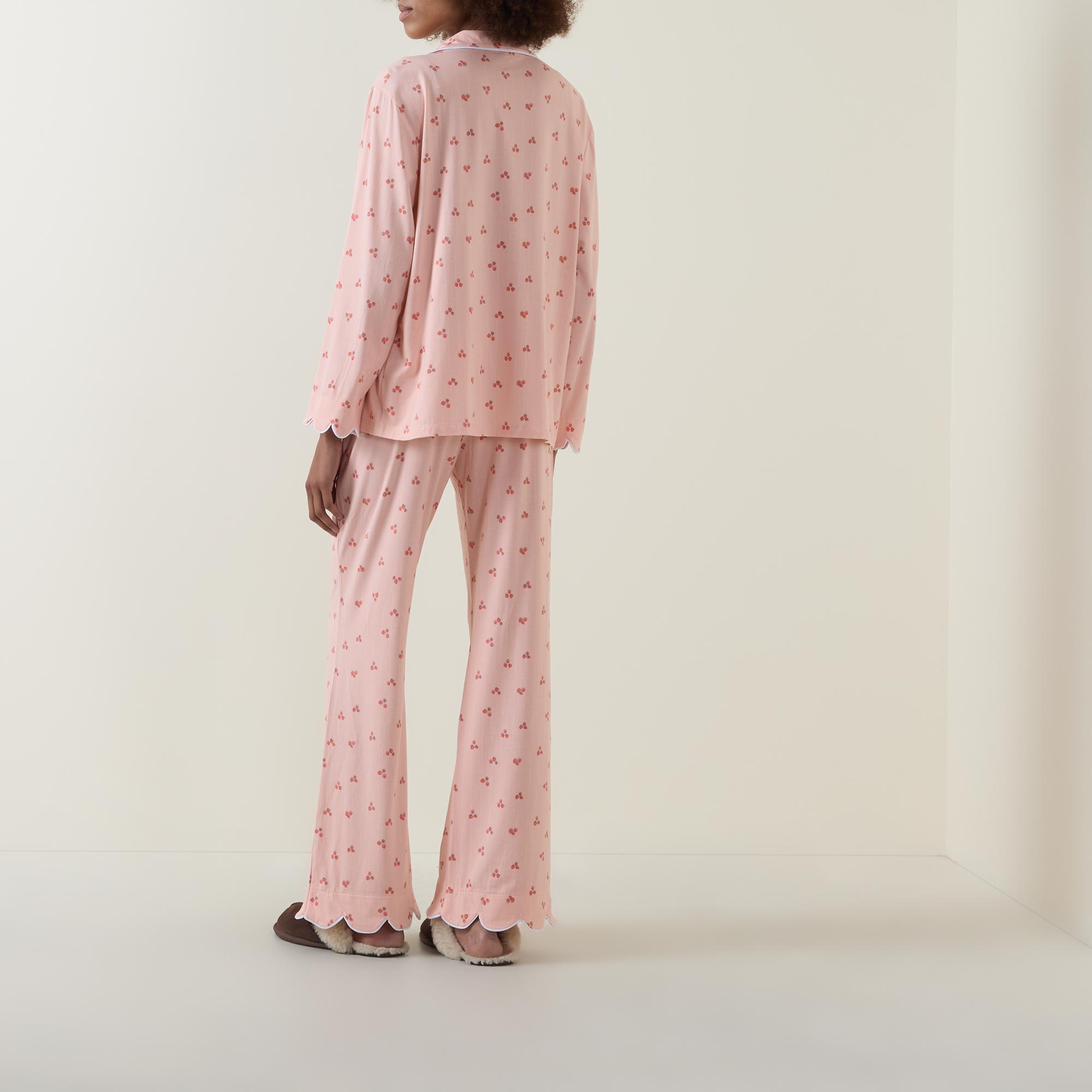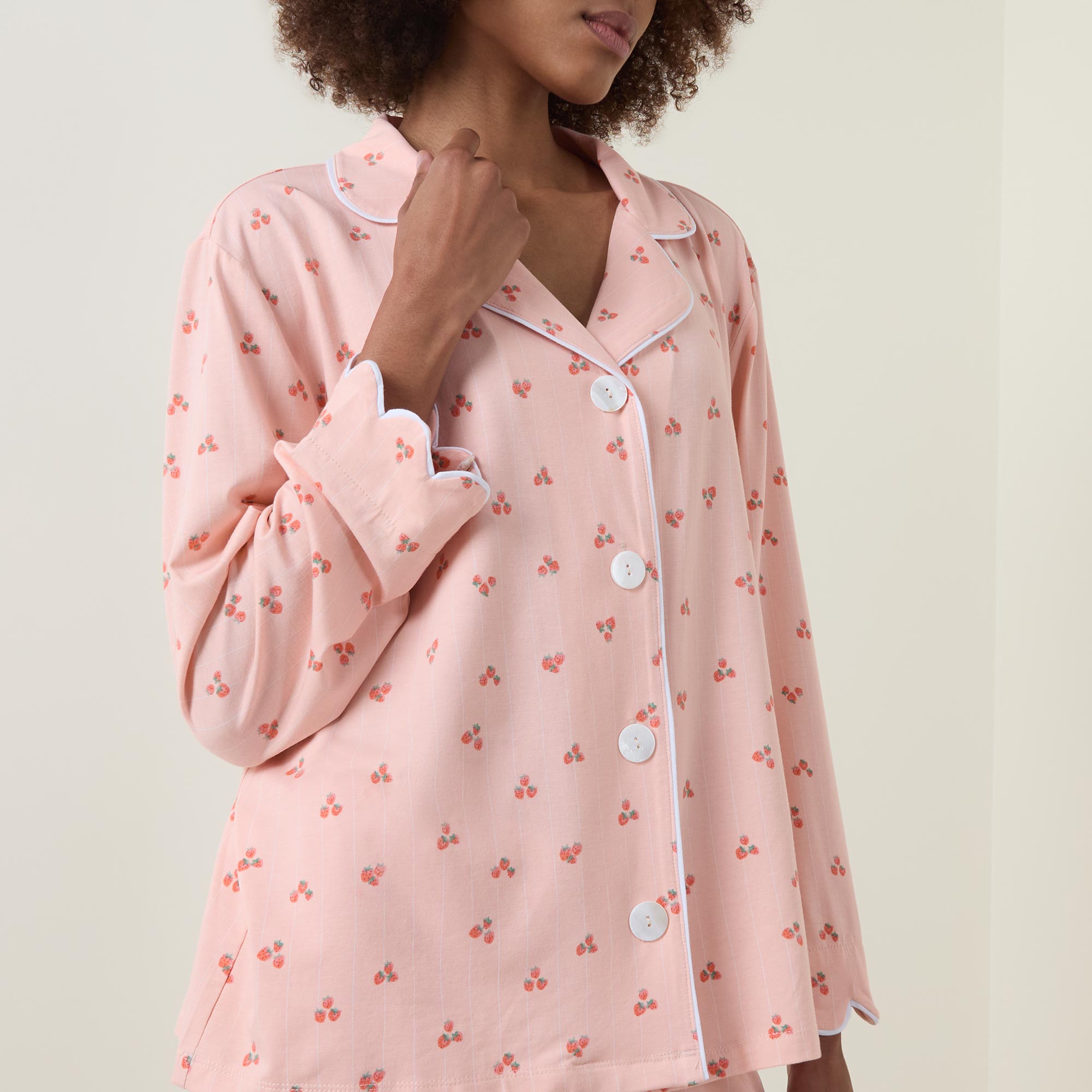 - Two-piece set, top with notch lapel collar, dropped shoulders, long sleeves, scalloped cuffs, front button fastening, straight hem, mid rise bottoms, elasticated waistband, straight leg, scalloped cuffs, contrast piping, strawberry print throughout, soft finish