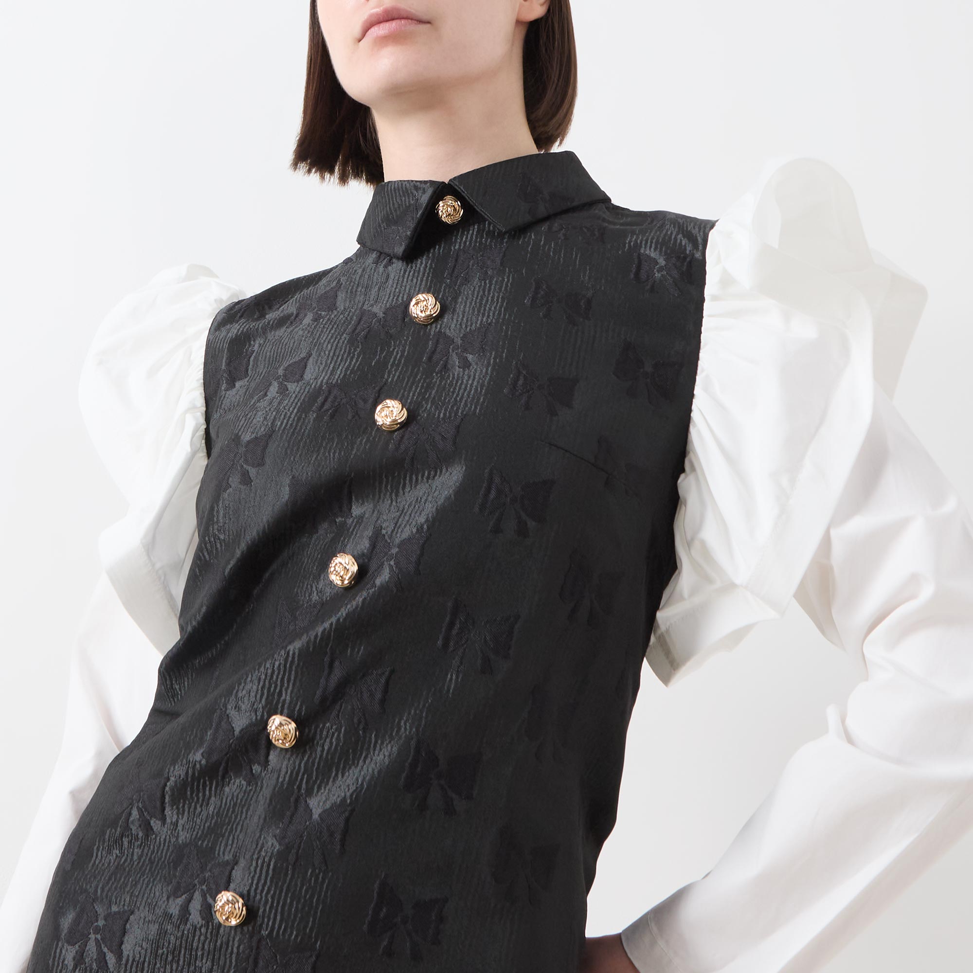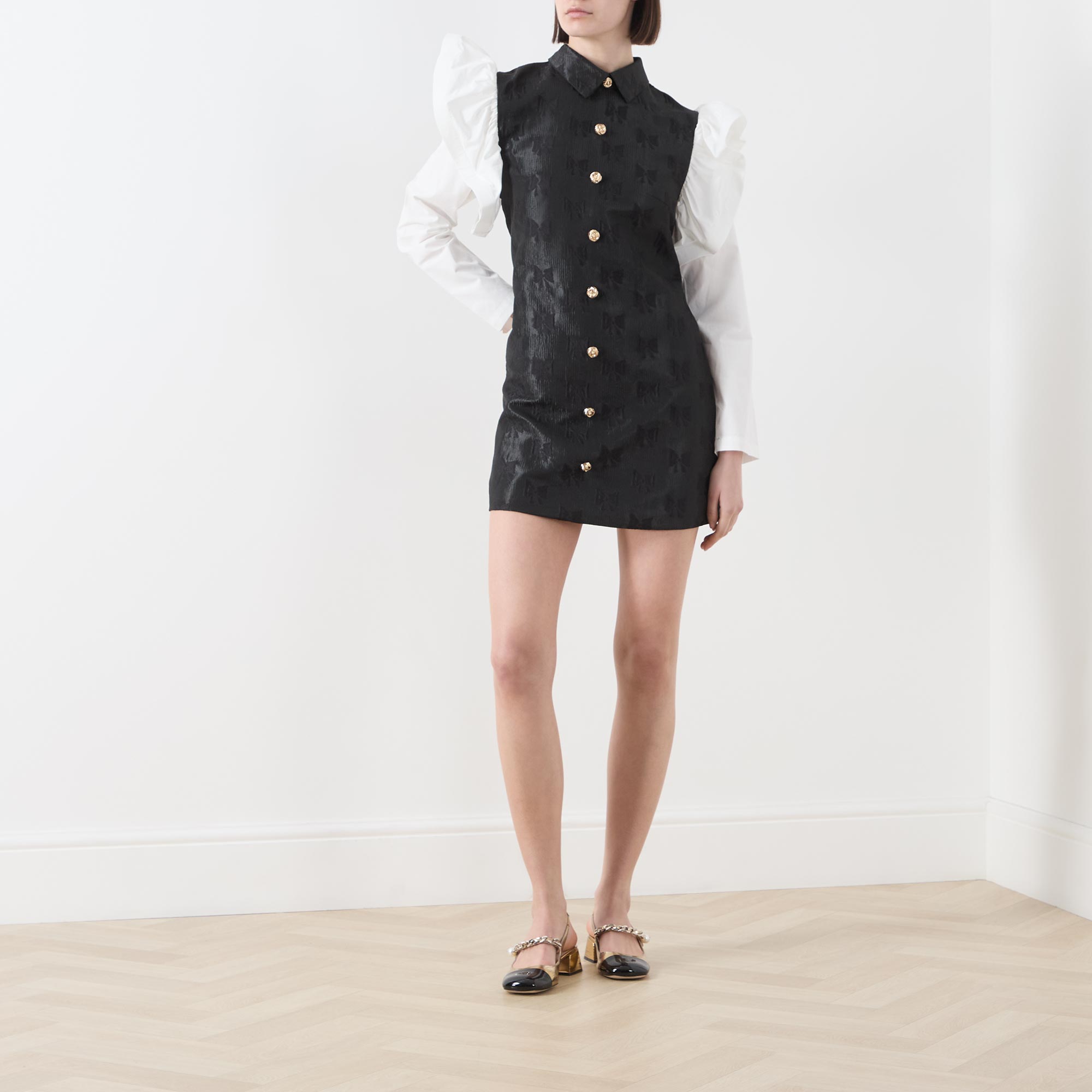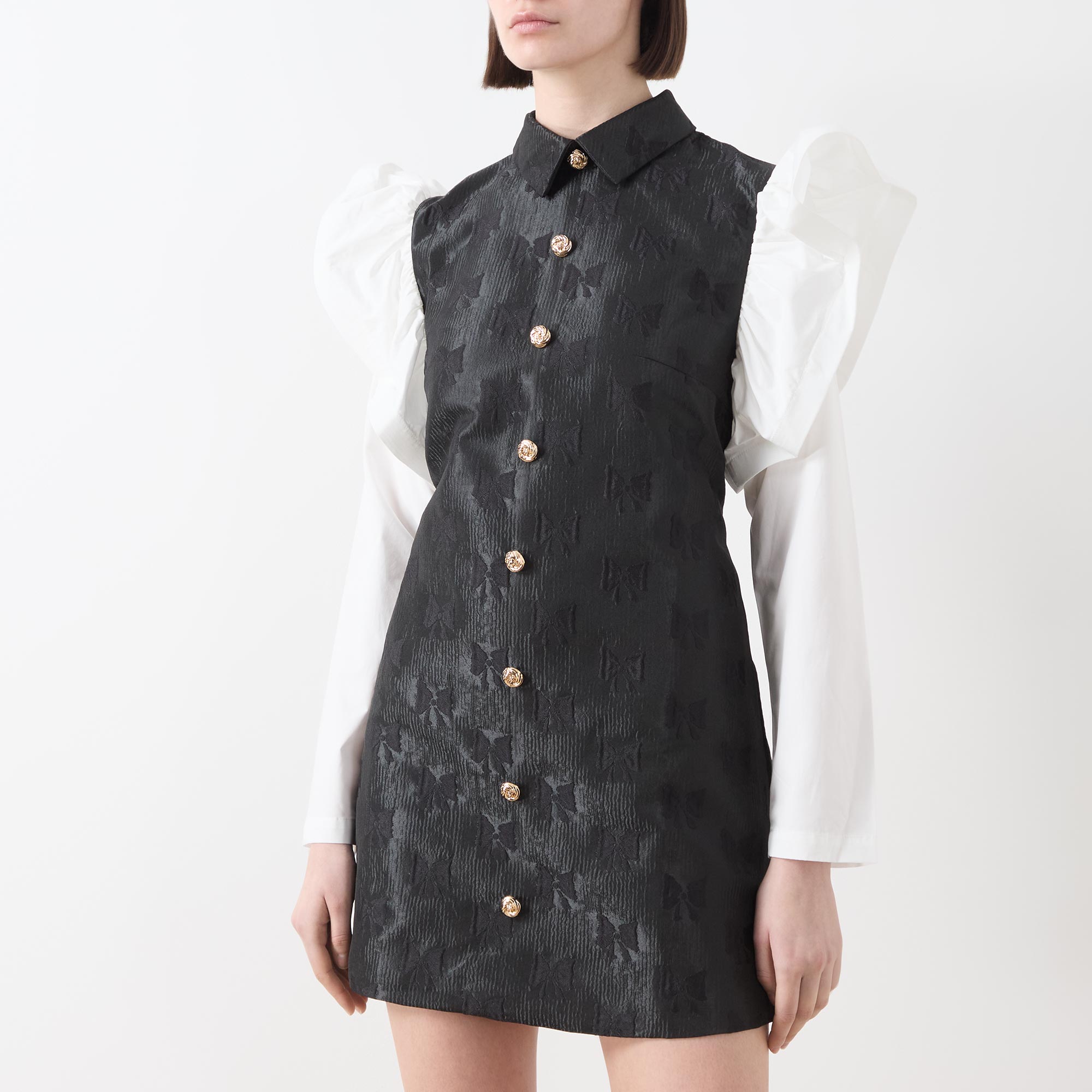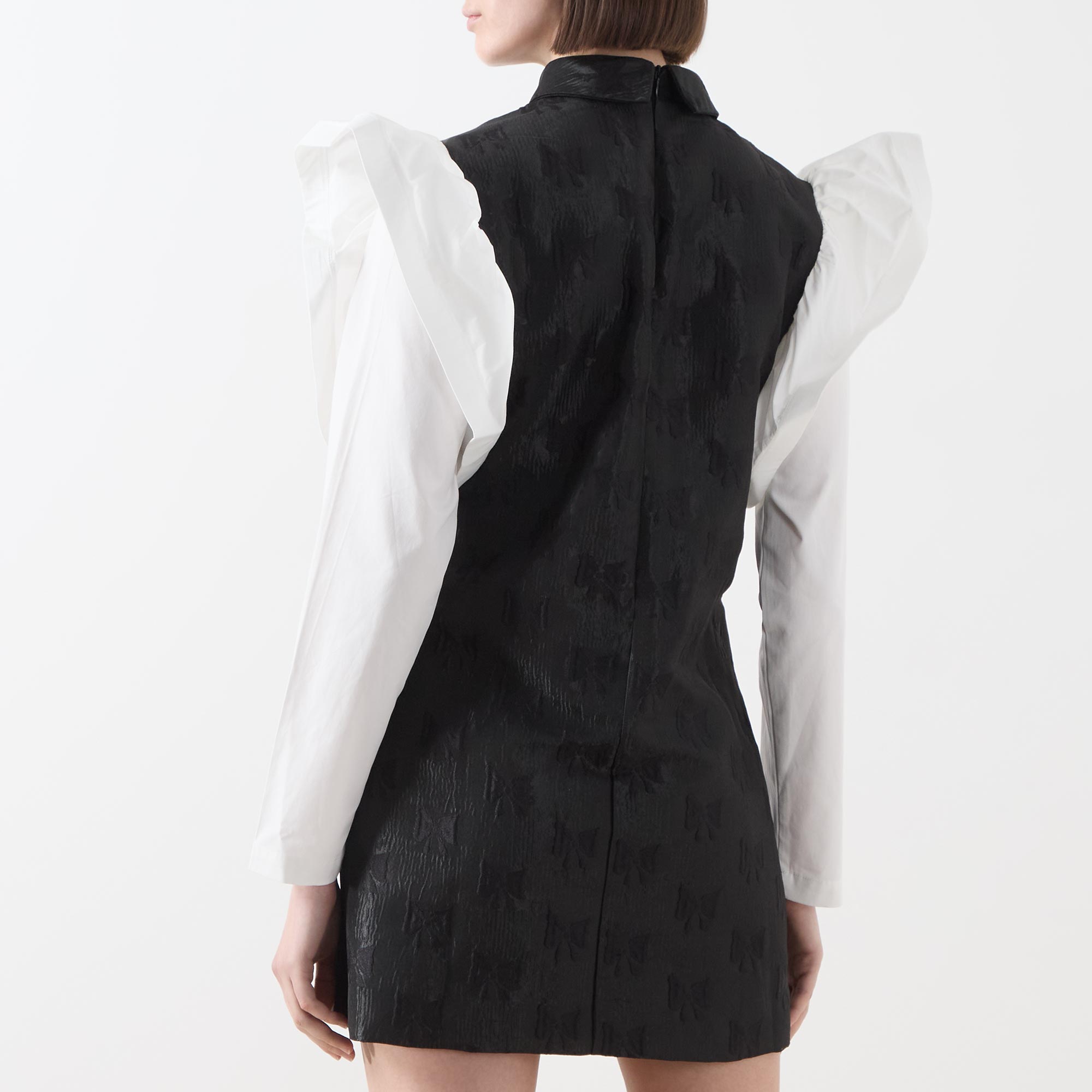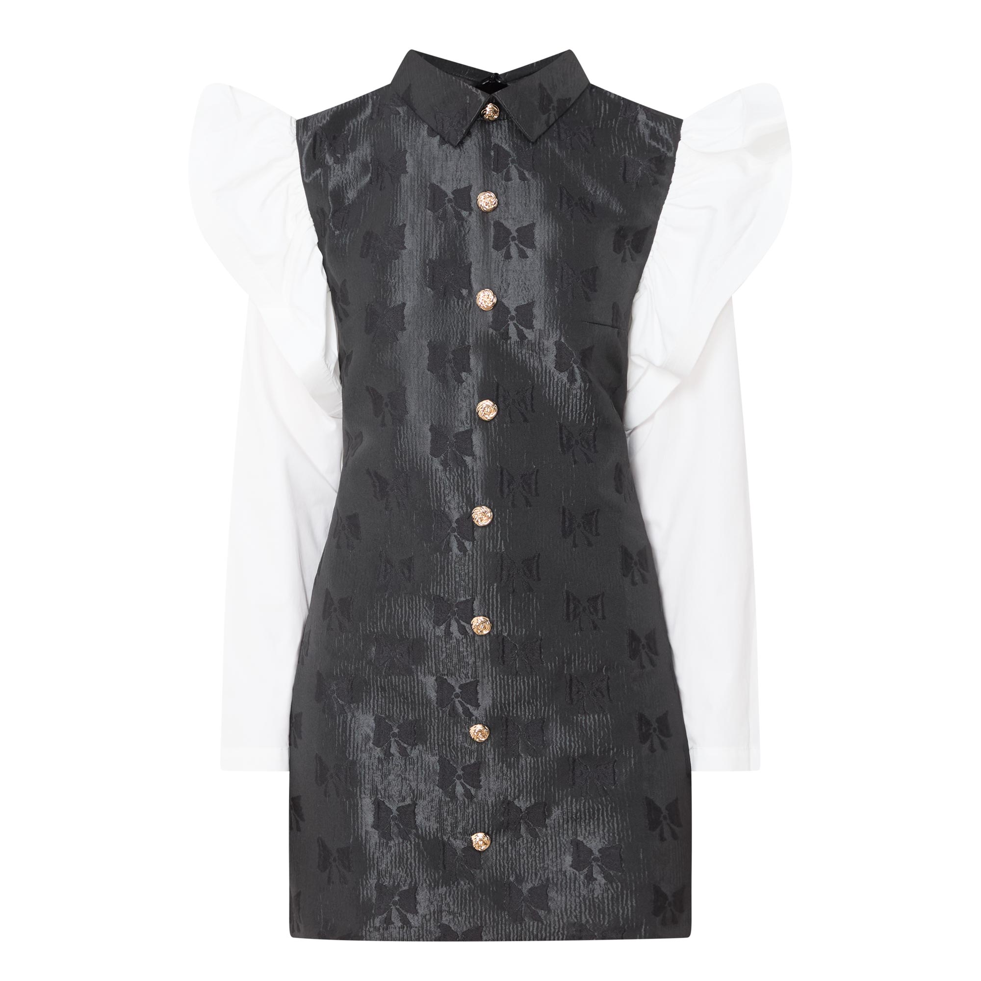 - Point collar, structured crinoline trim detailed shoulders, long sleeves, front statement button placket, rear concealed zip closure, fitted through the waist and hips, straight hem, bow motif jacquard fabric, mini length