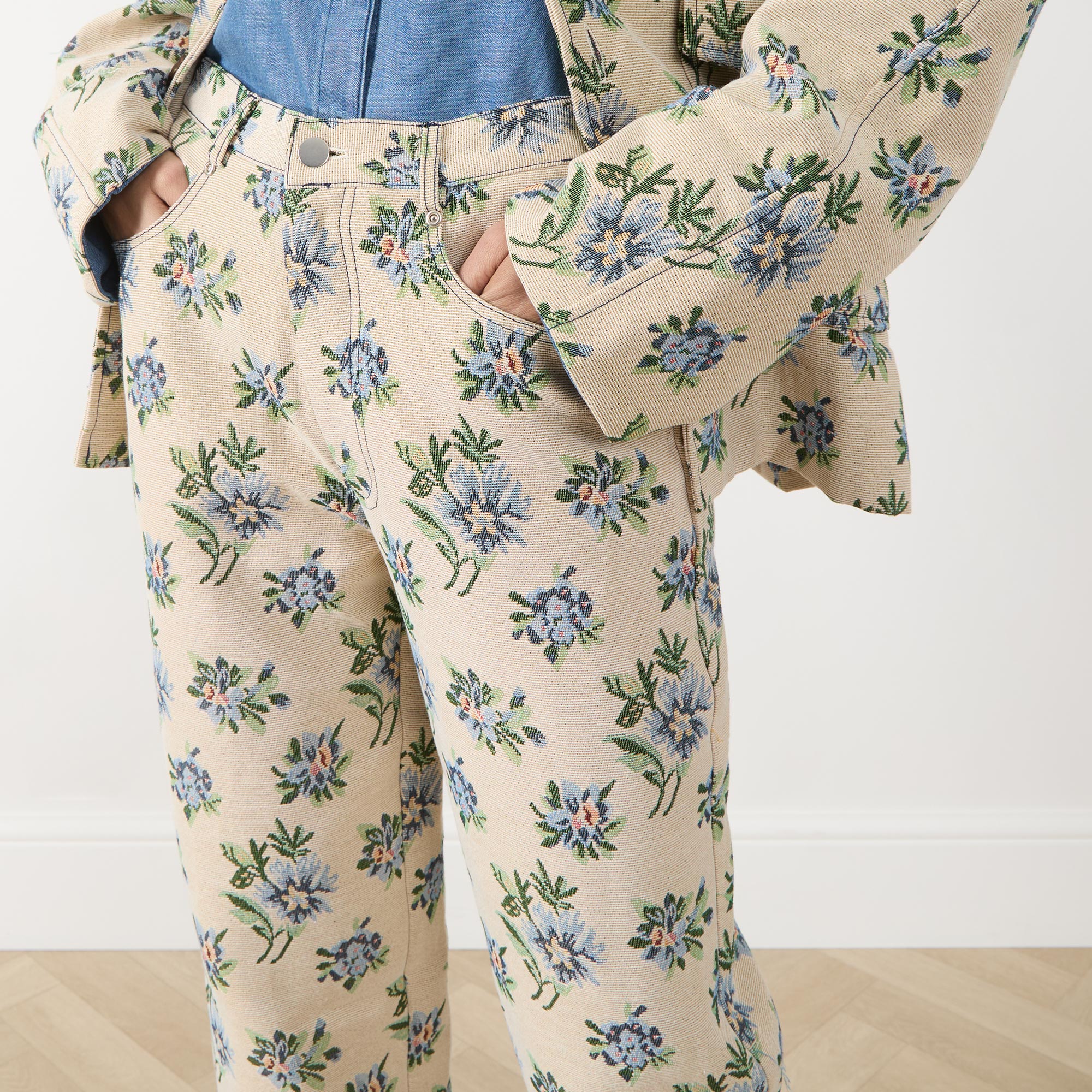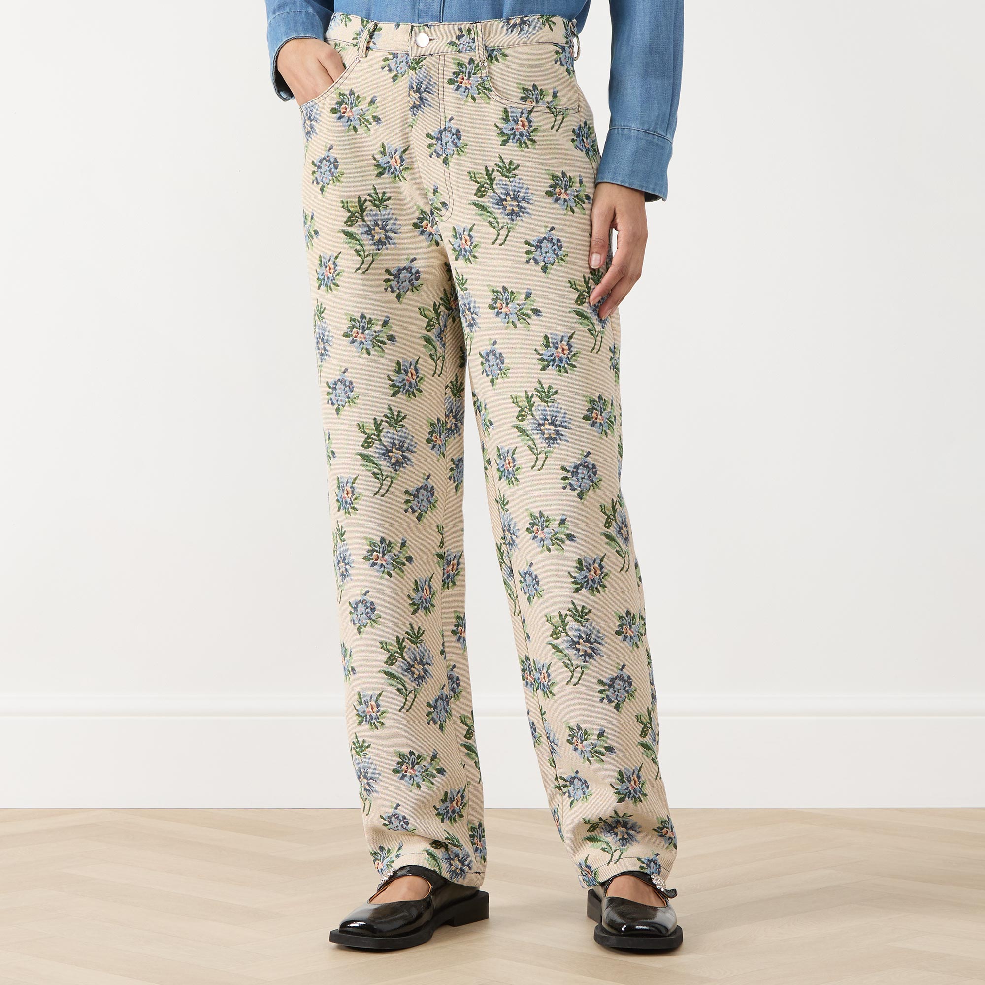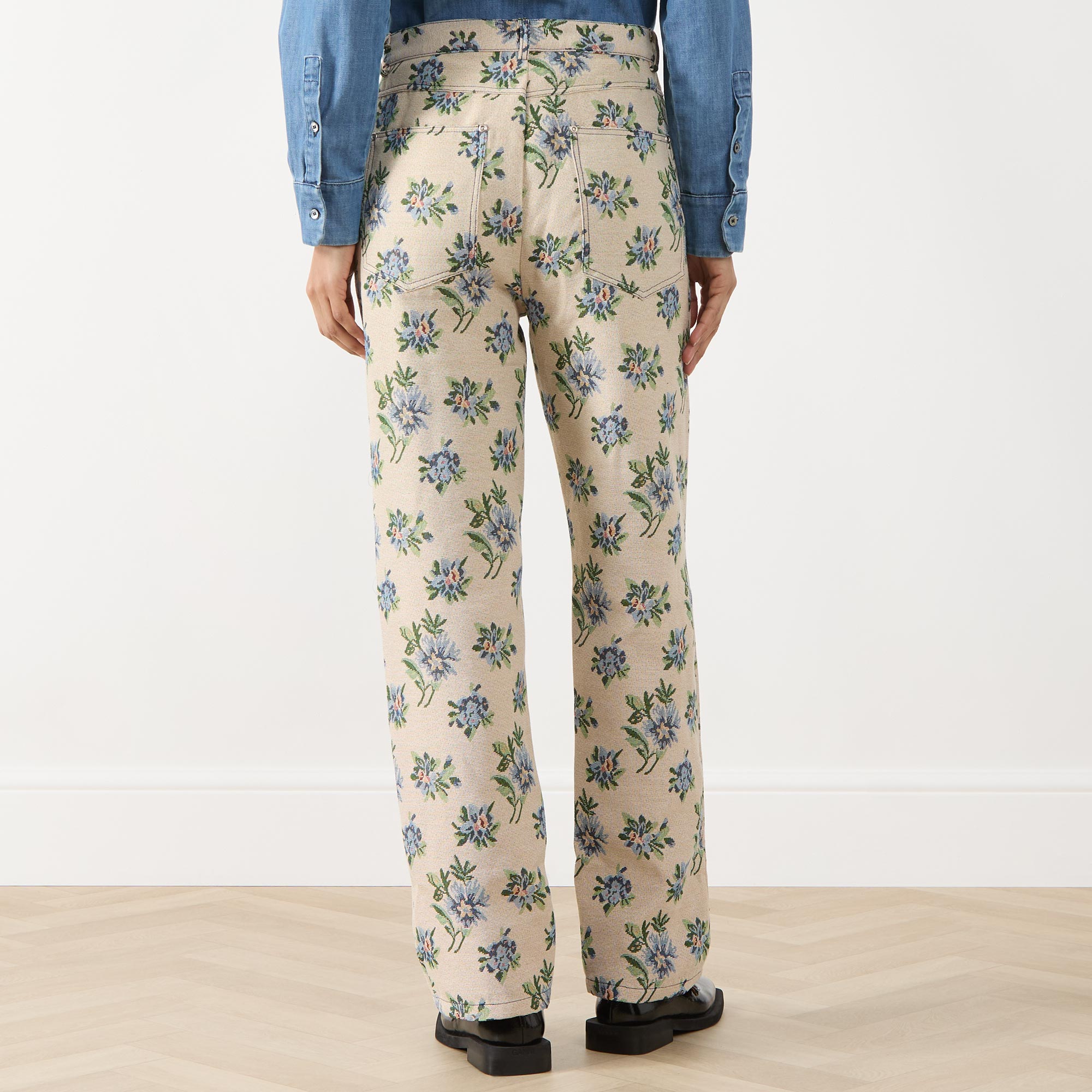 - High rise, straight leg, full length, belt loops, concealed fly and button fastening, two front slip pockets, two rear patch pockets, clean hems, tapestry pattern, lined