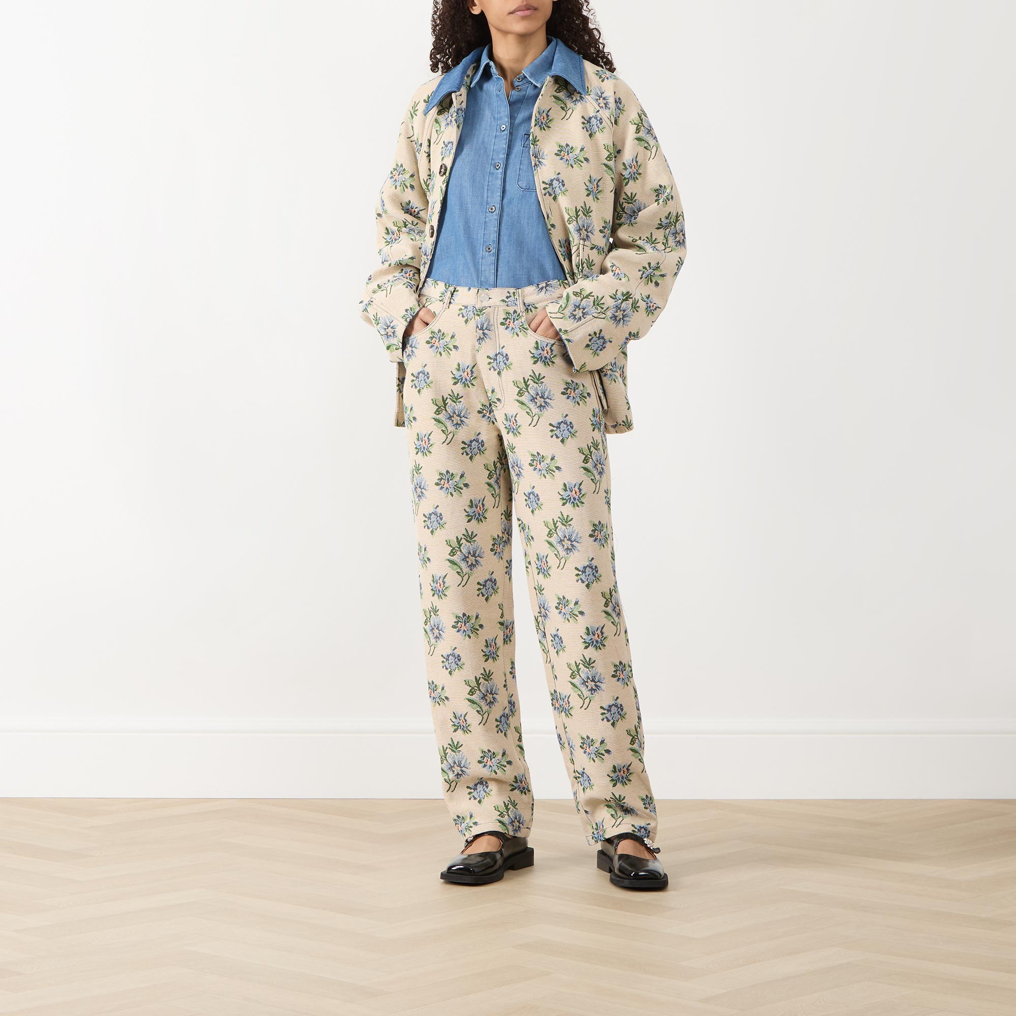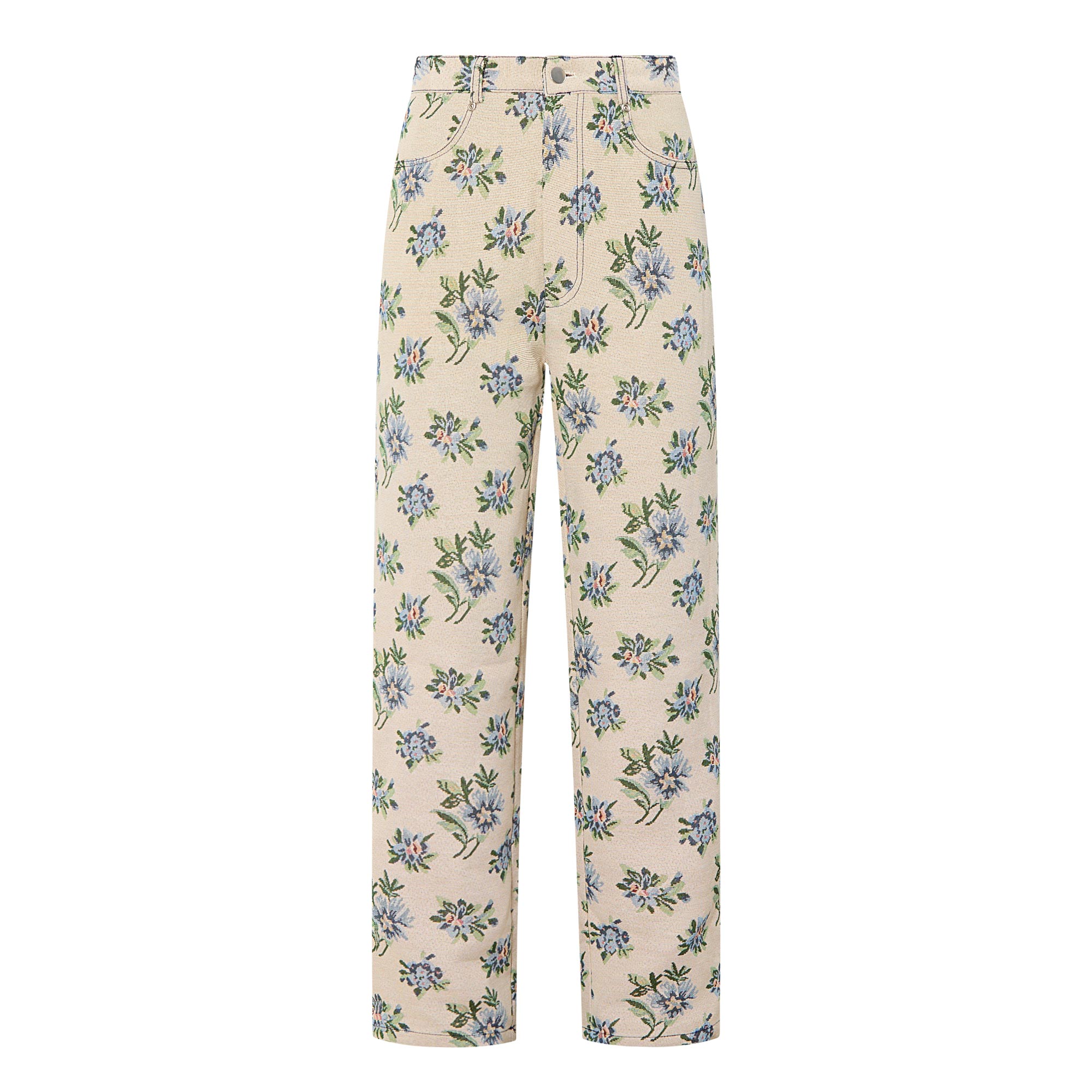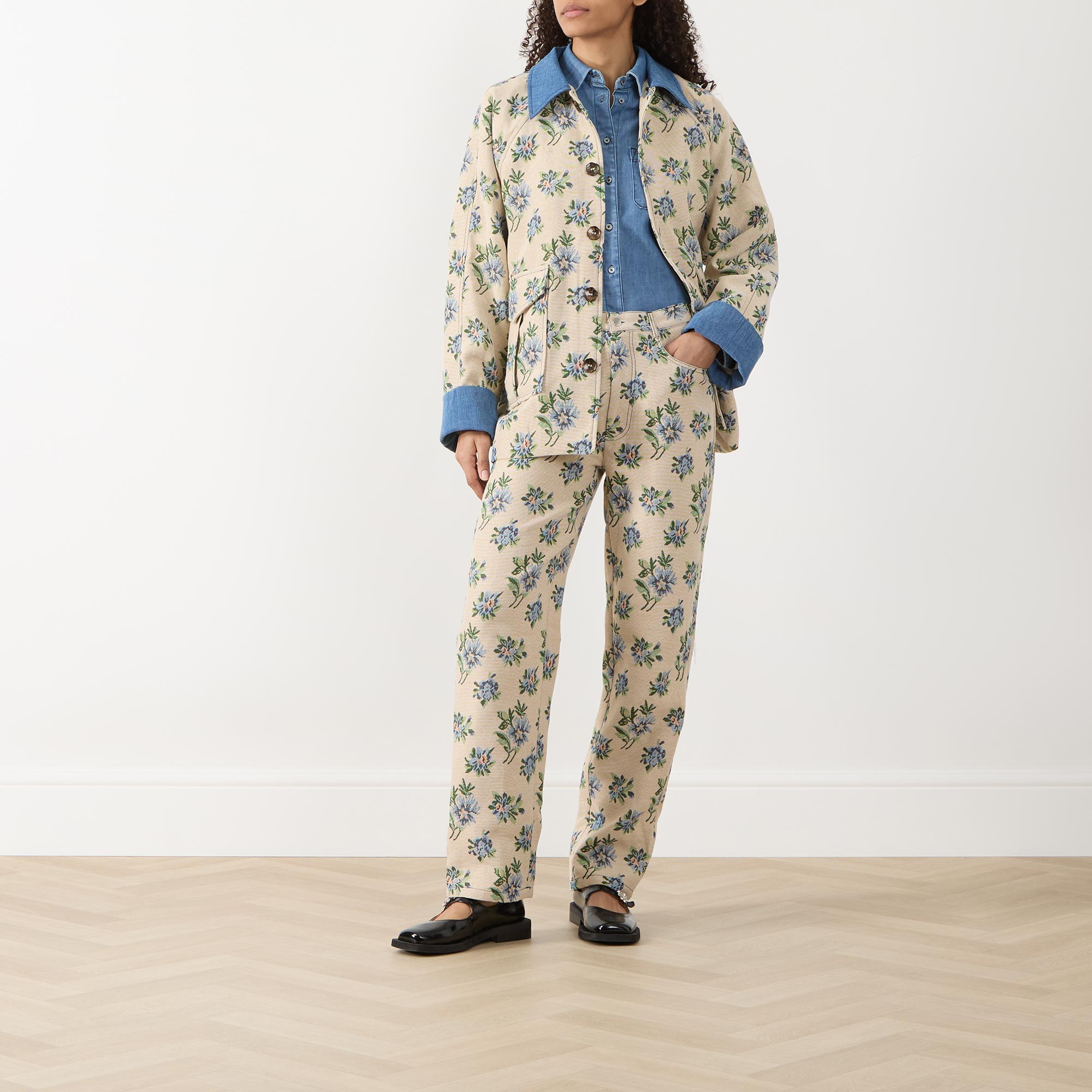 - High rise, straight leg, full length, belt loops, concealed fly and button fastening, two front slip pockets, two rear patch pockets, clean hems, tapestry pattern, lined