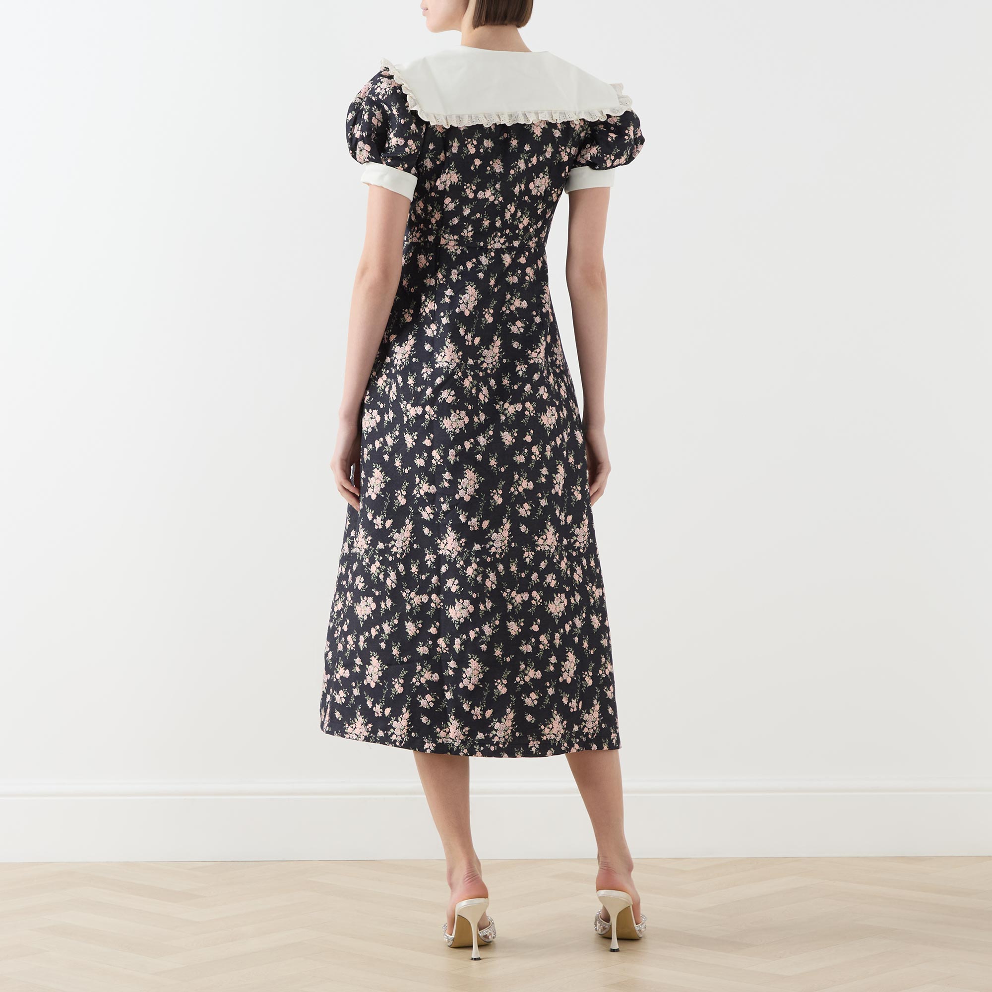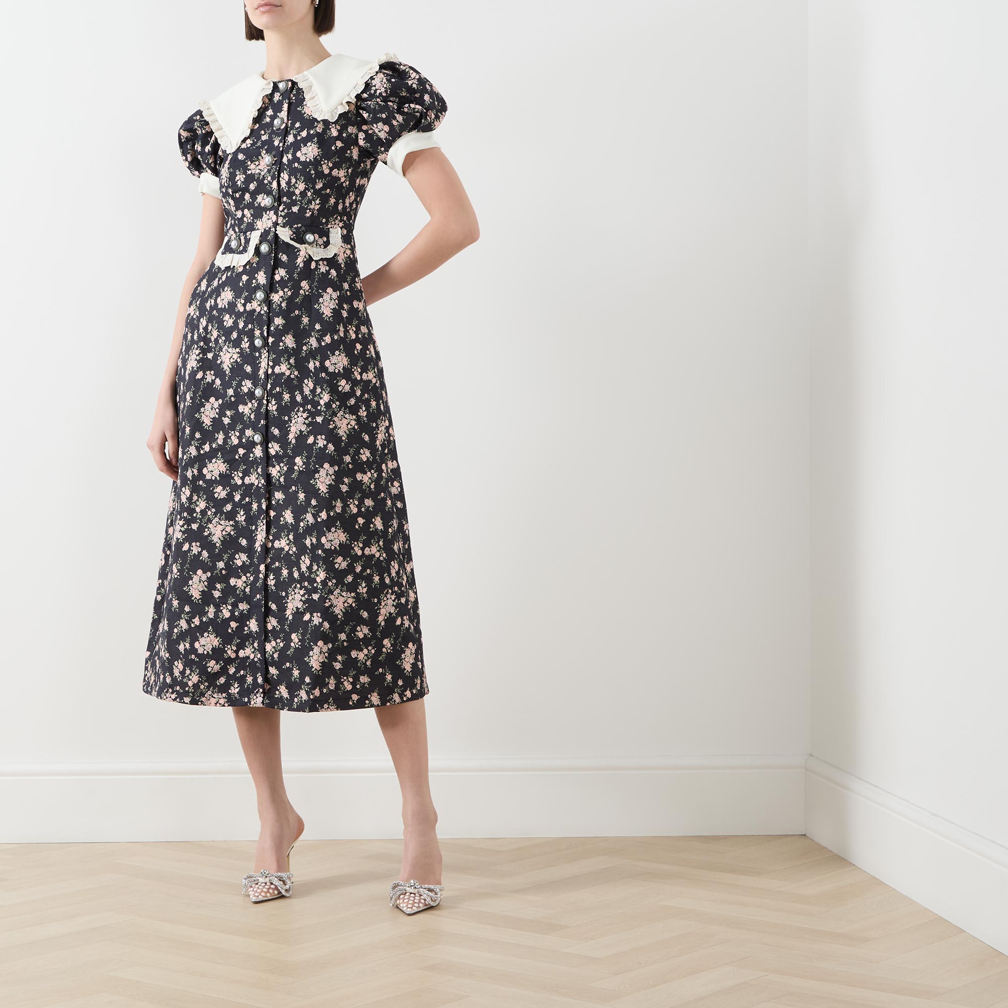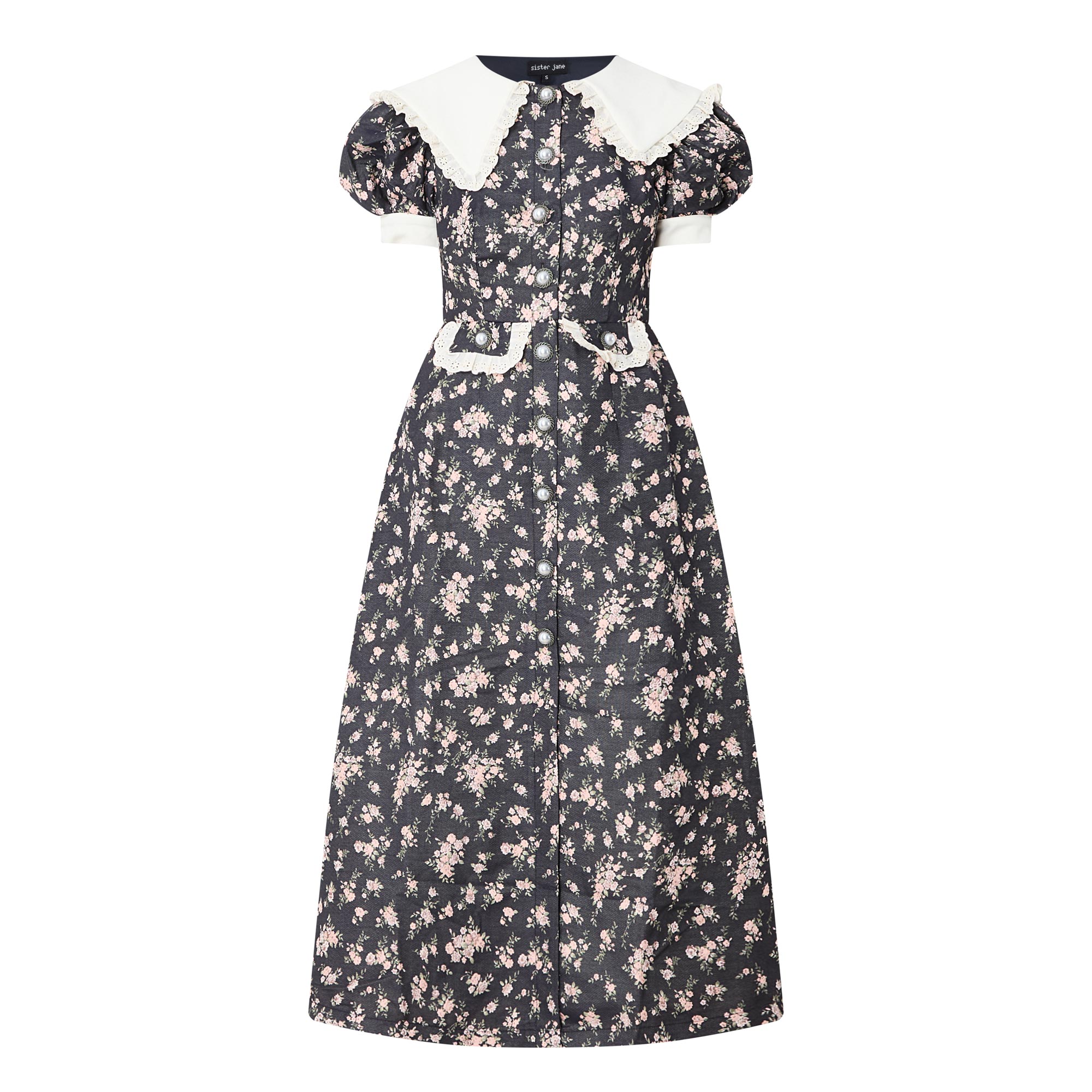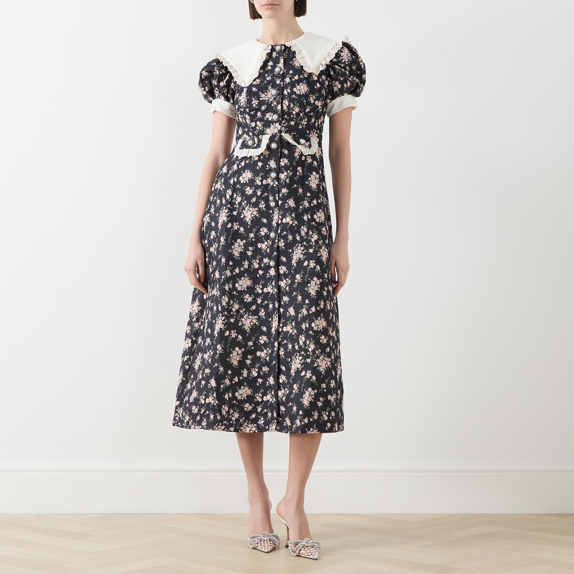 • Exaggerated collar, short puff sleeves, contrast bound cuffs, front statement button placket, two waist flap pockets, gathered broderie anglaise frill trim detailing throughout, flared skirt, delicate floral jacquard pattern, midi length