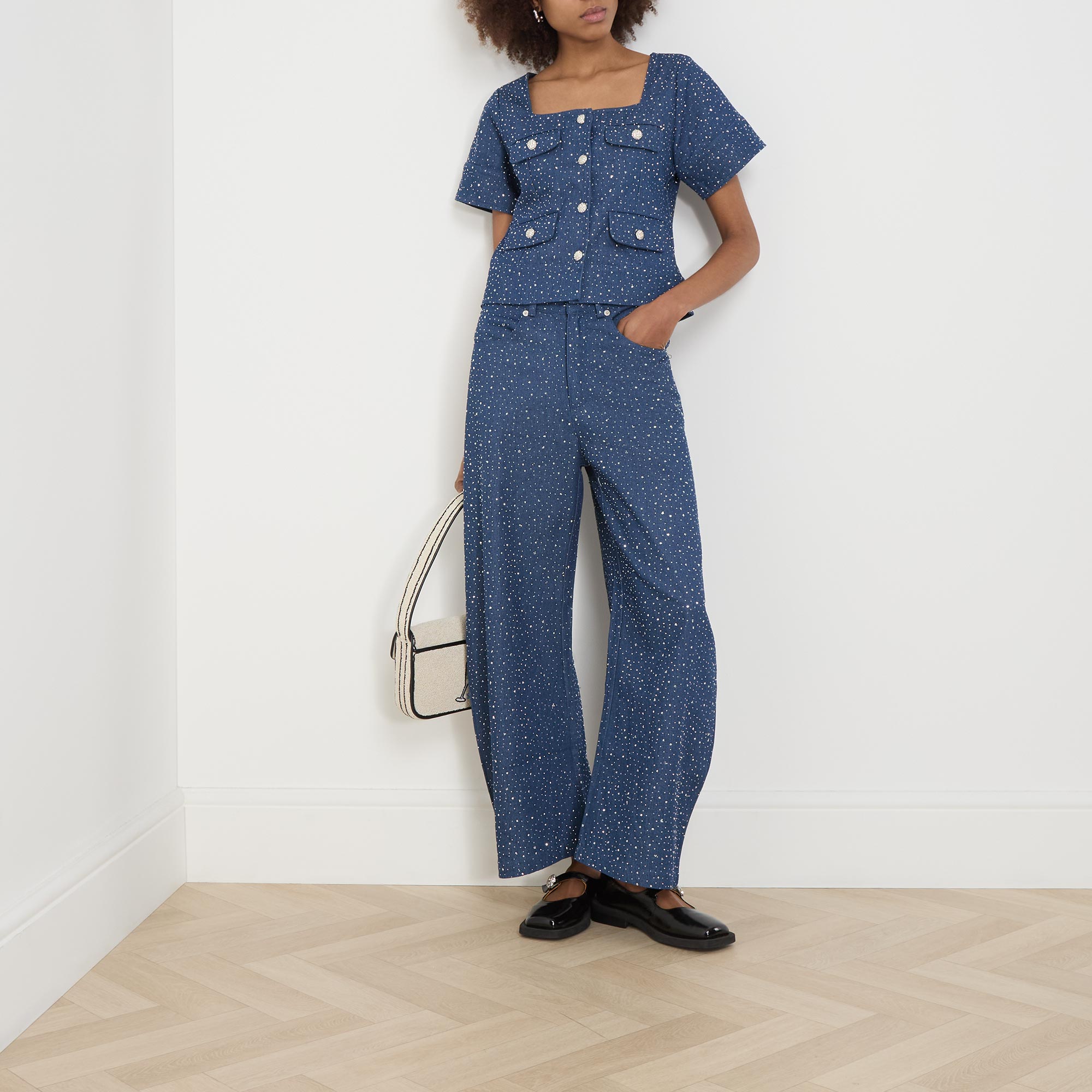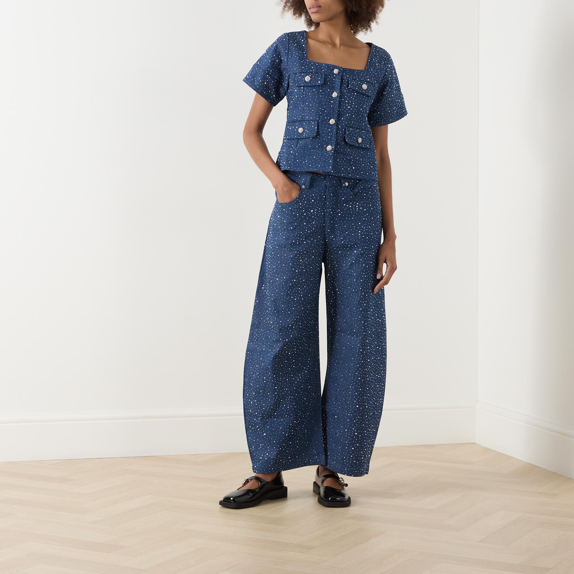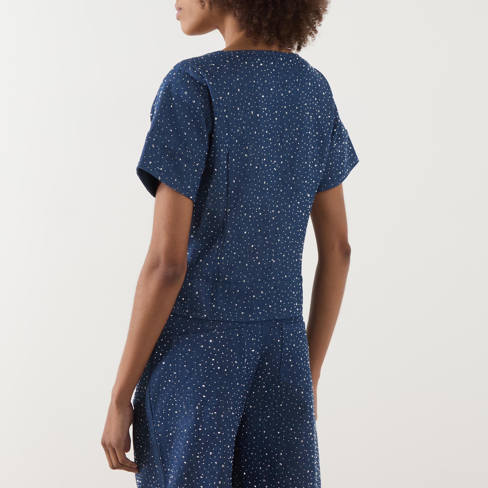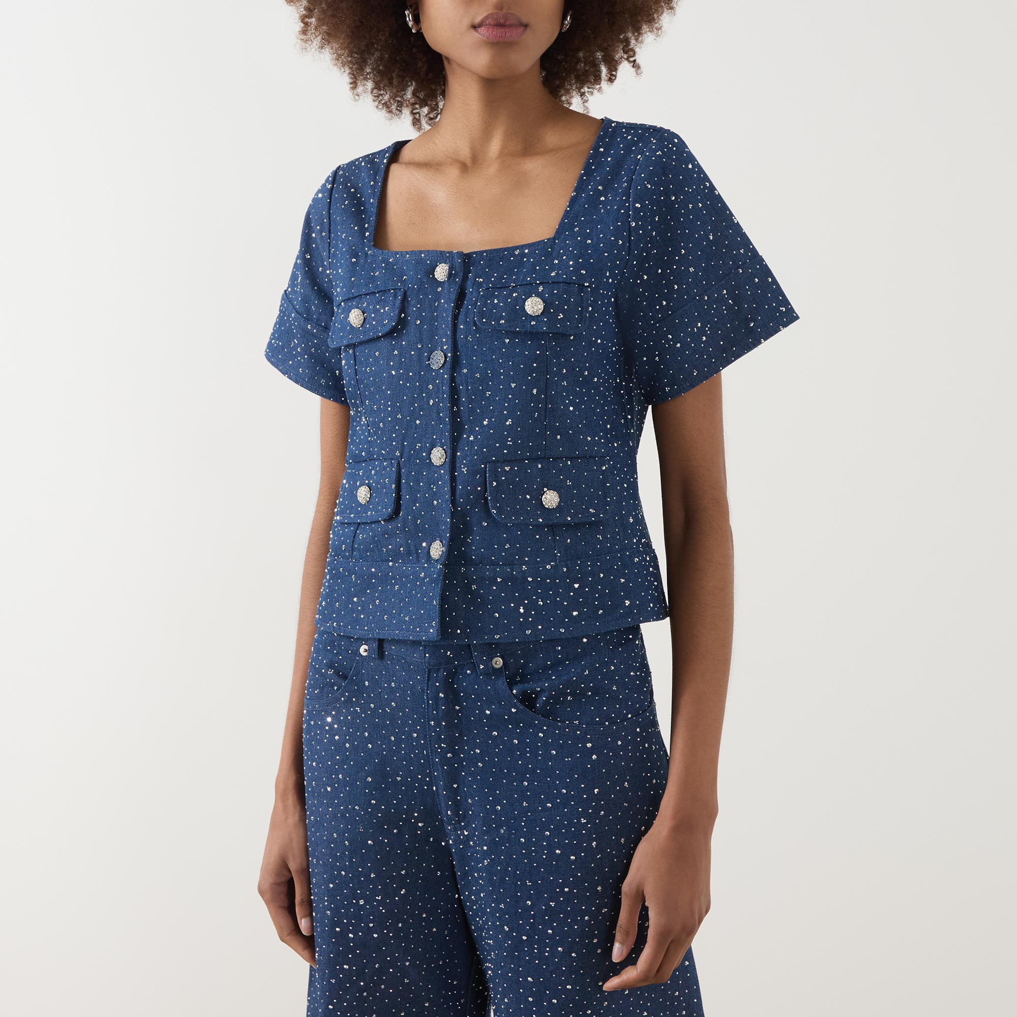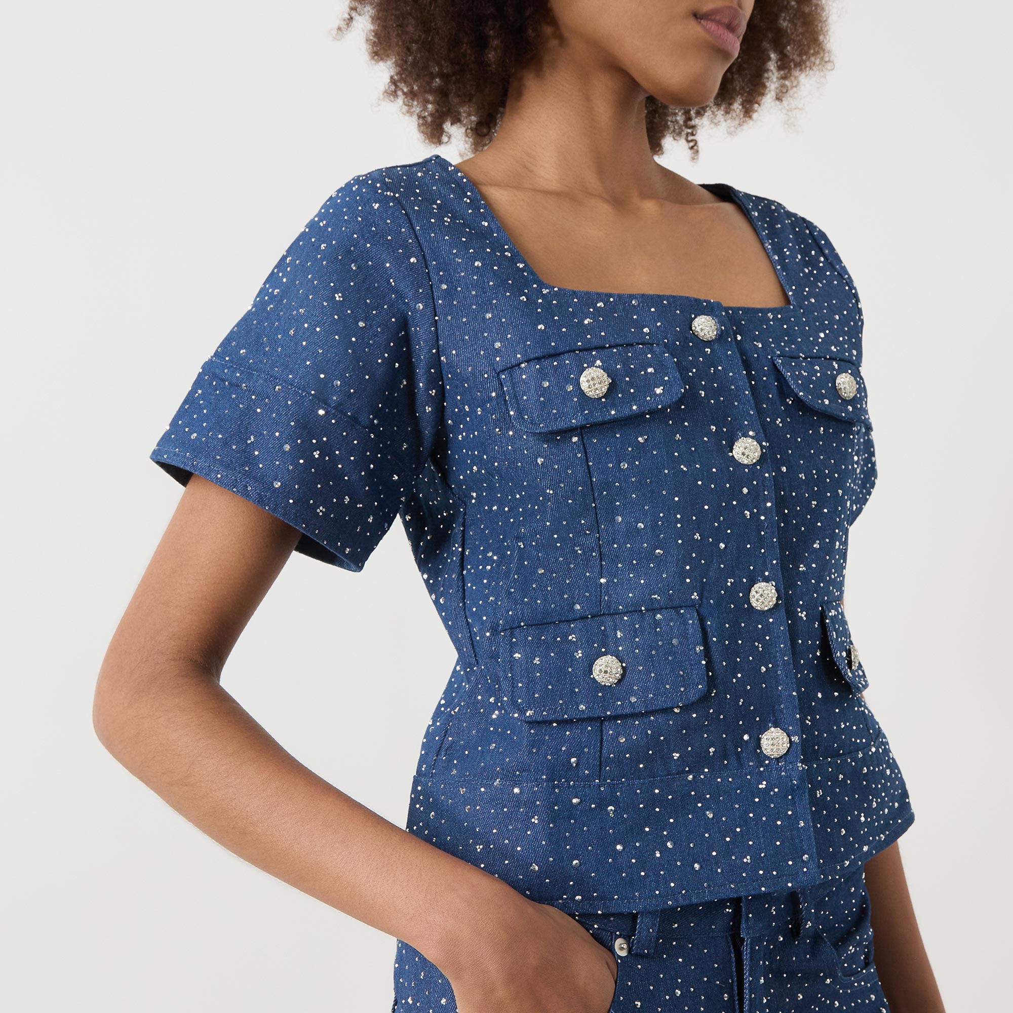 • Short sleeves, square-cut neckline, silver-tone button fastenings, four flap pockets, all-over rhinestone embellishment, smooth denim finish