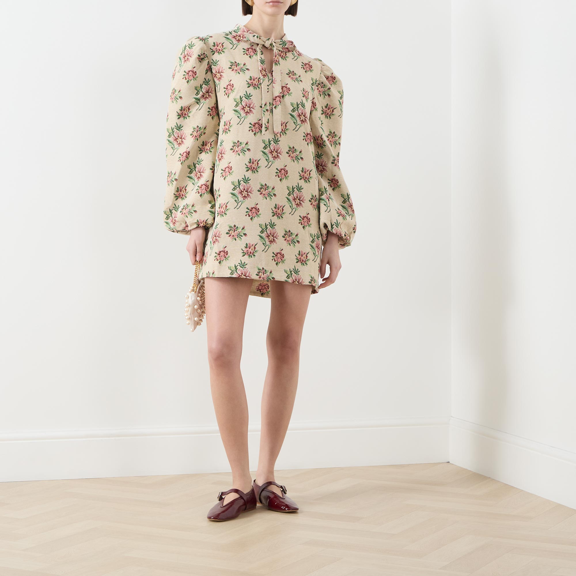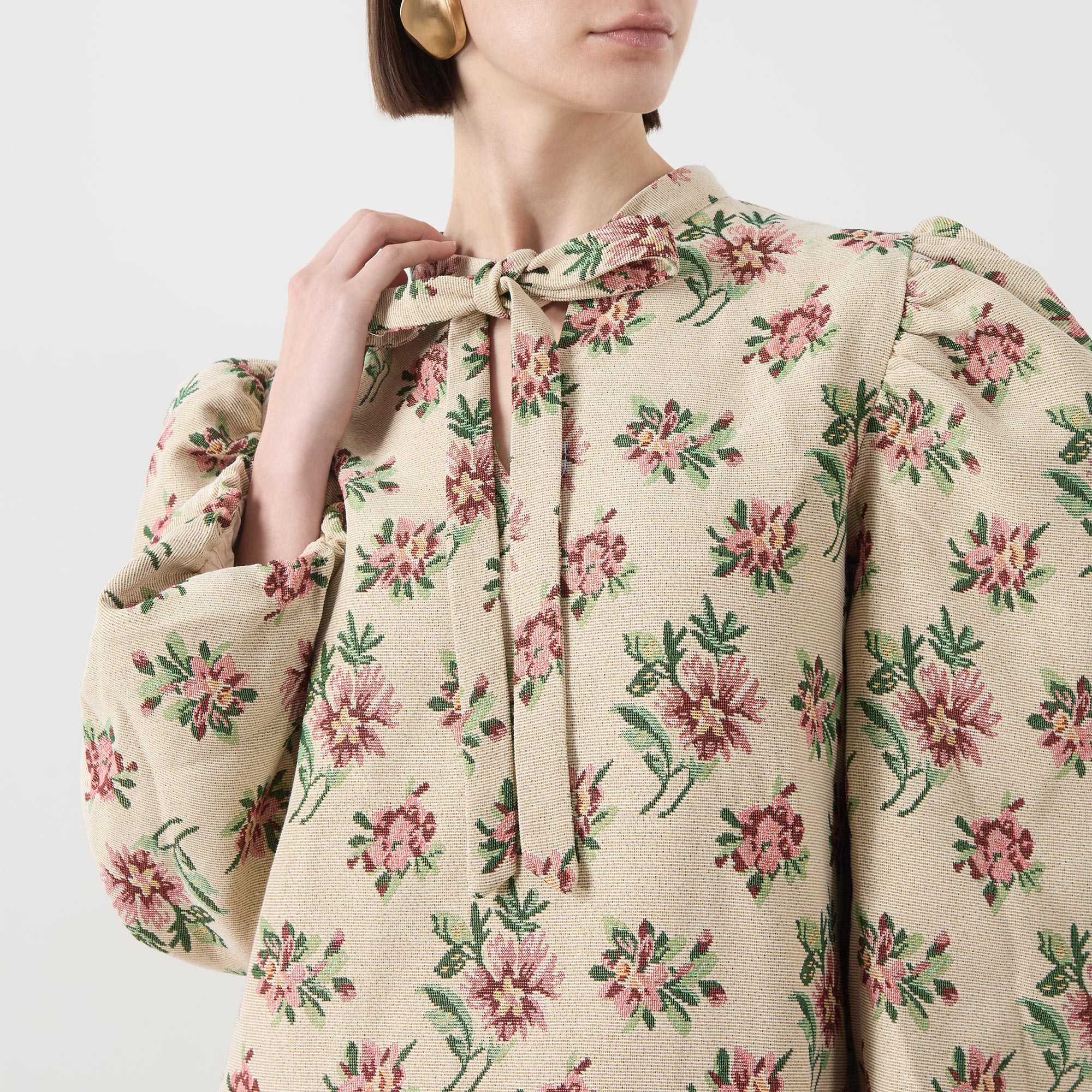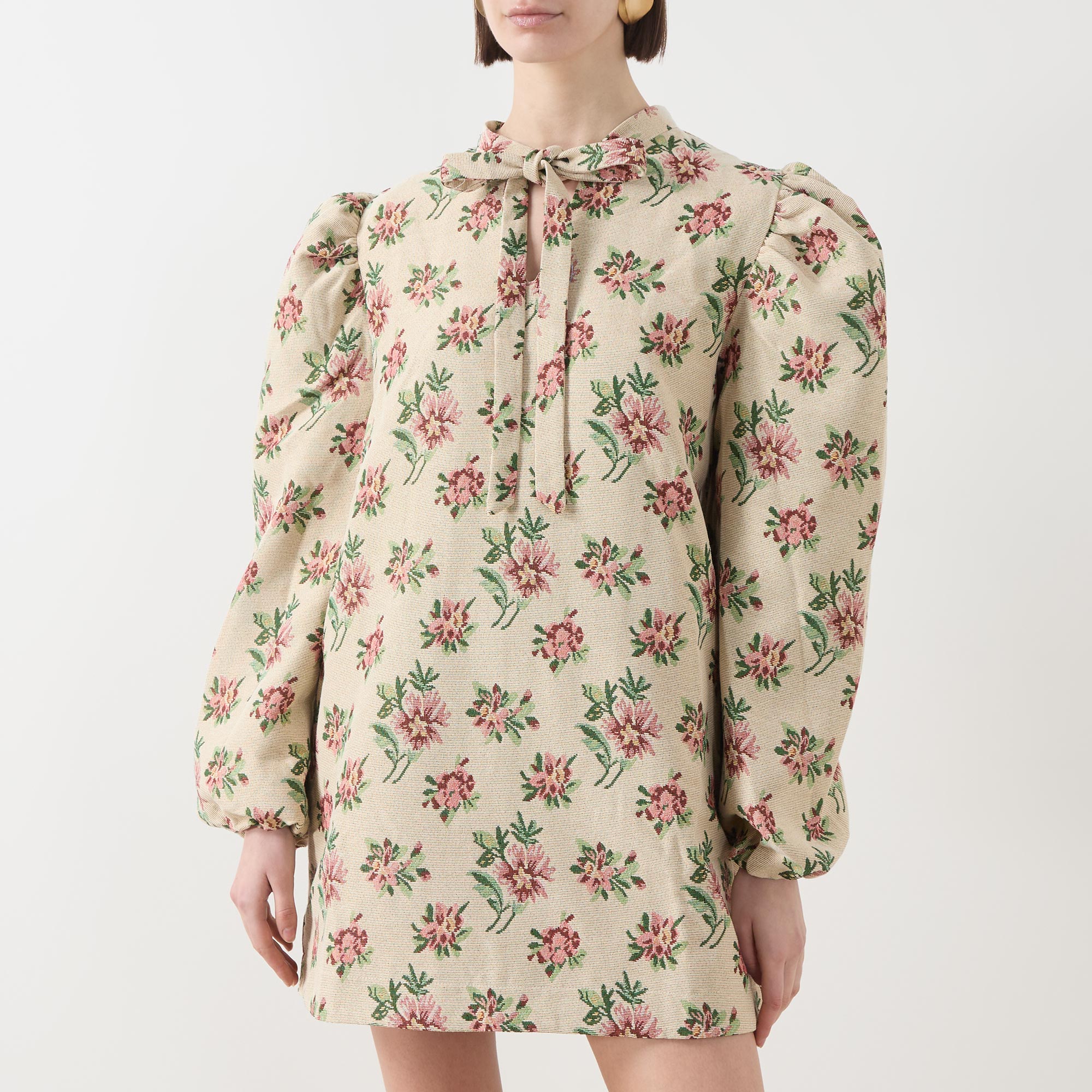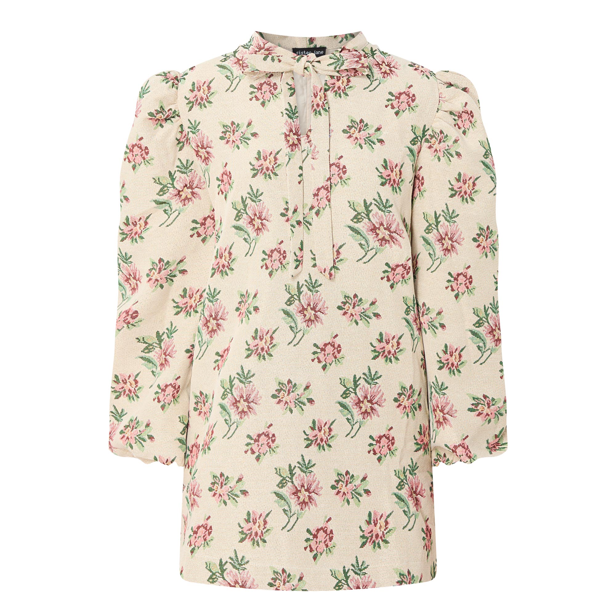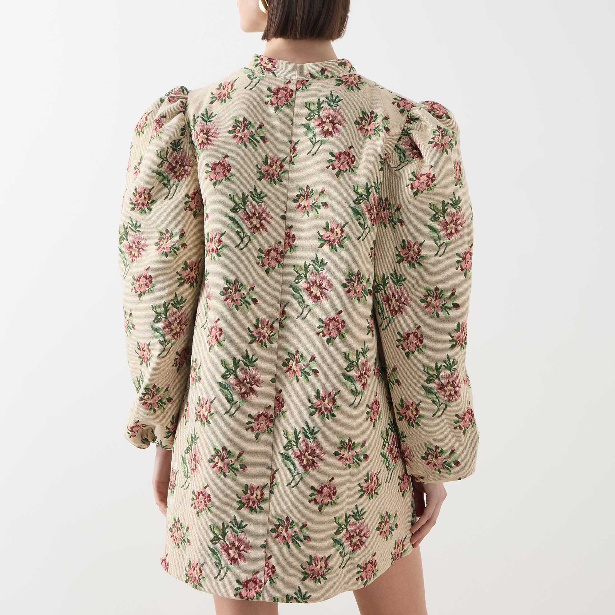 - Stand collar, adjustable tie fastening, puff shoulders, long sleeves, elasticated cuffs, straight hem, floral tapestry pattern, mini length