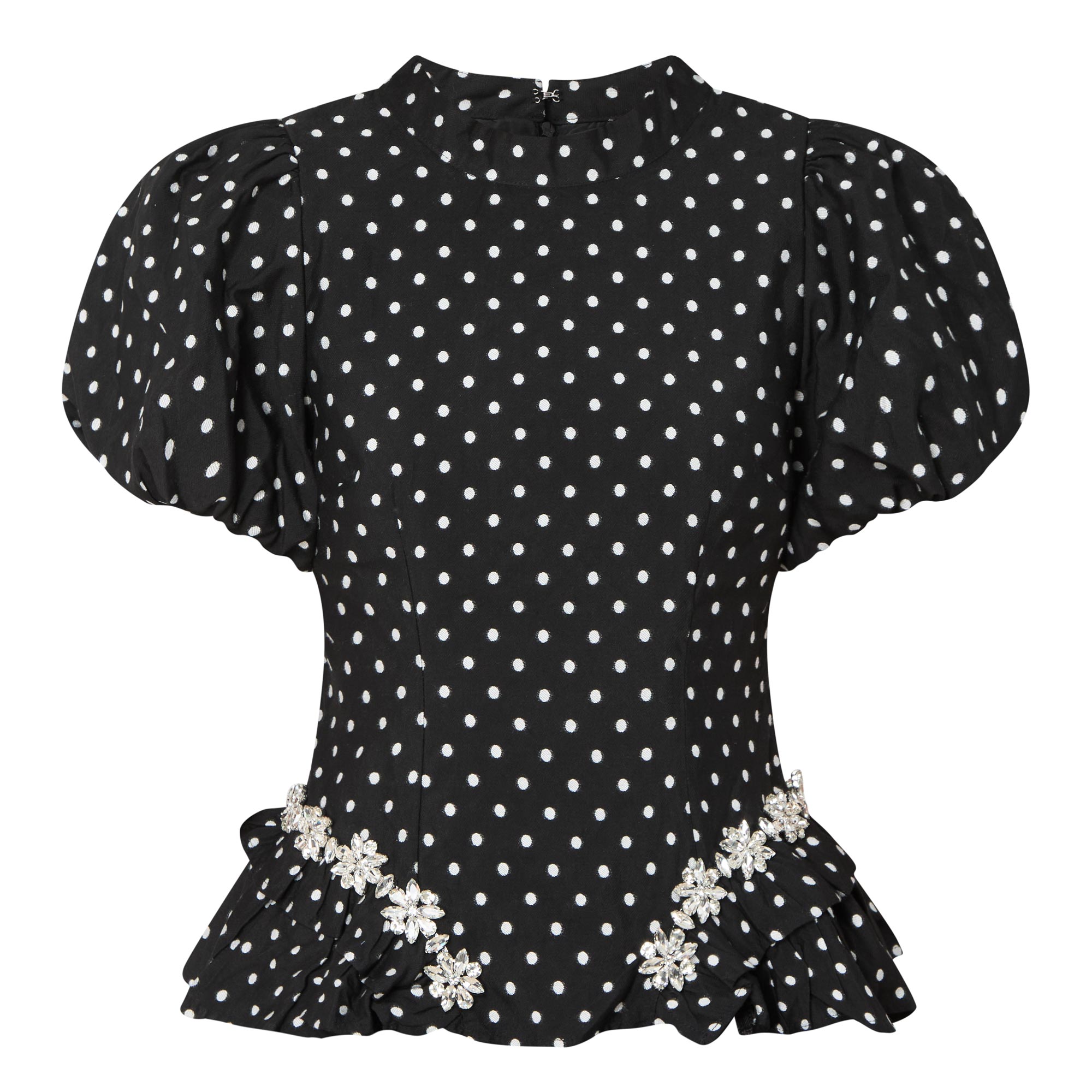 - Short puff sleeves, round neckline, back zip-fastening closure, polka dot pattern, crystal flower embellishment, peplum hemline, smooth fabric