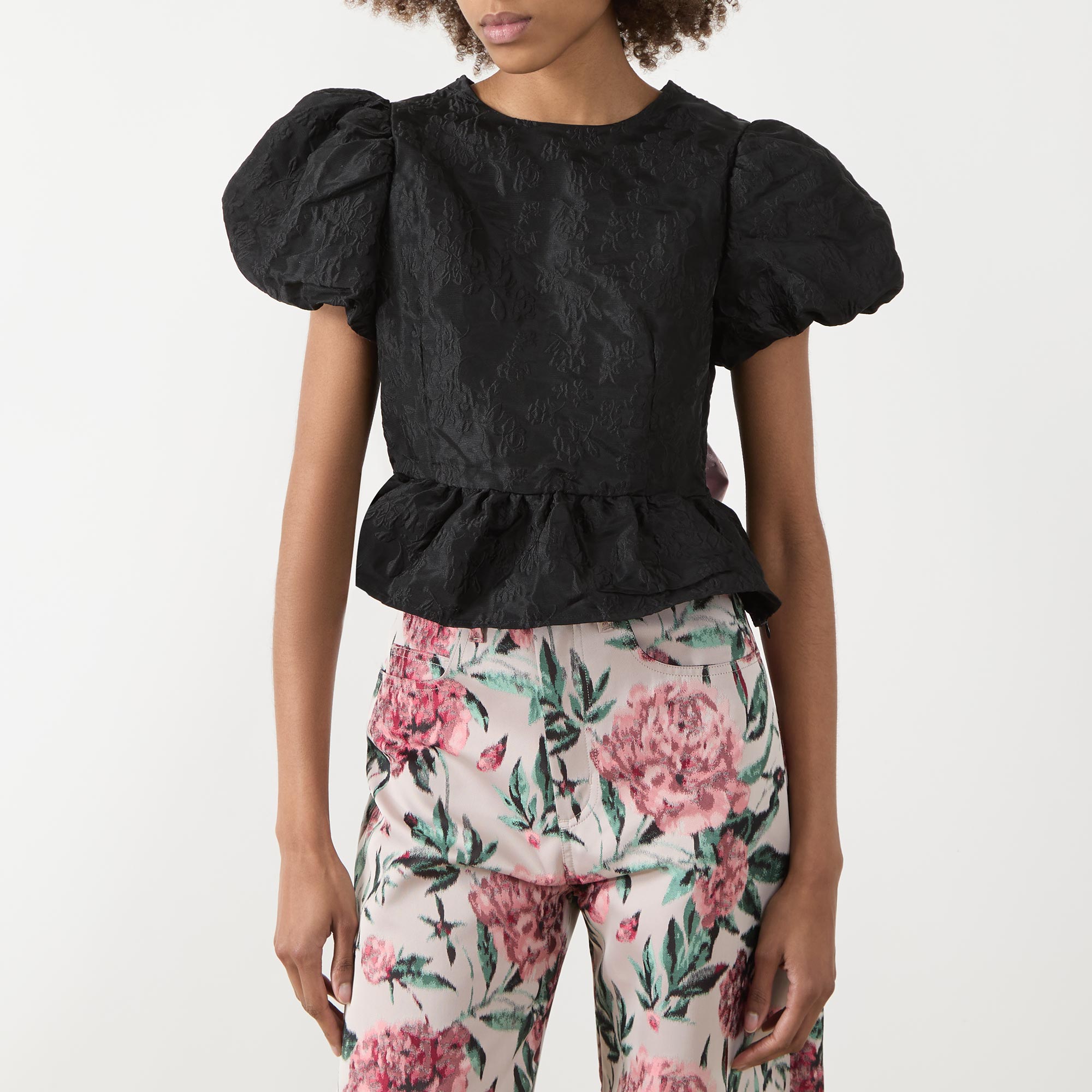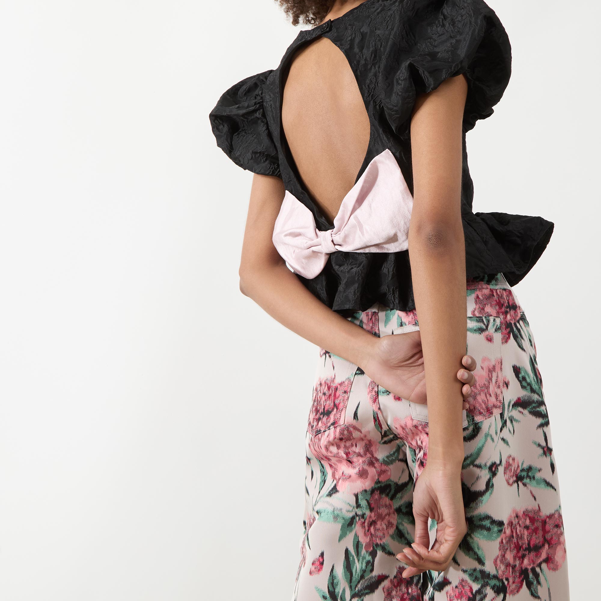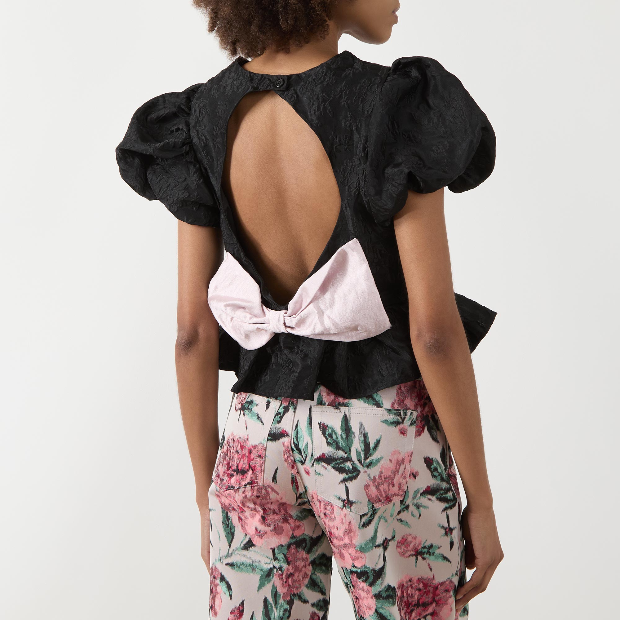 • Short puff sleeves, round neckline, cut-out panel to the back, back button fastening, back bow detail, tonal jacquard pattern, peplum hemline, textured finish
