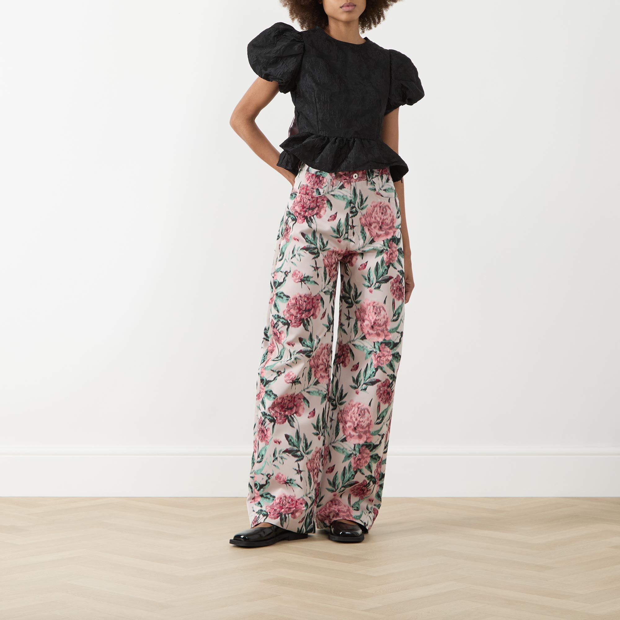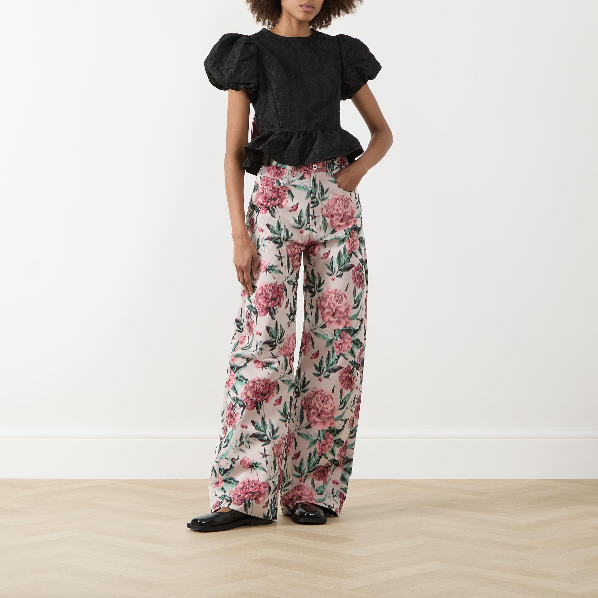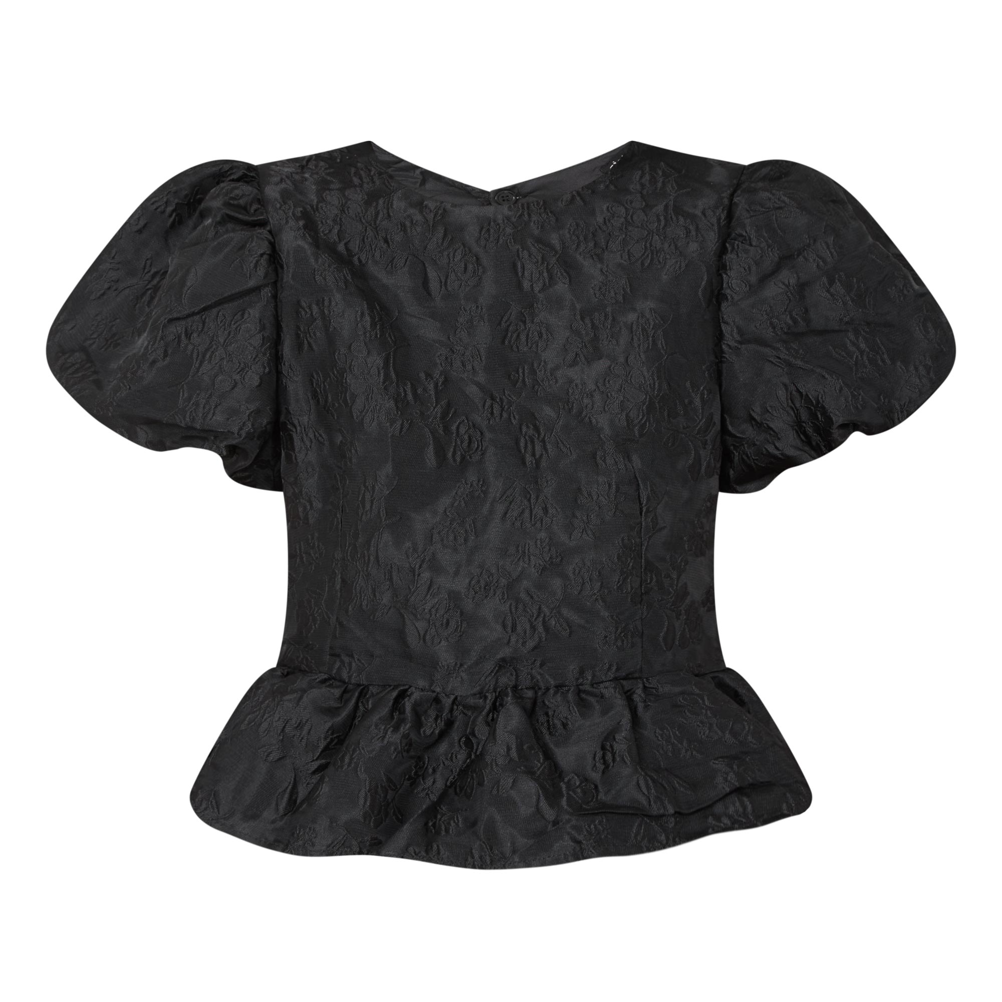 • Short puff sleeves, round neckline, cut-out panel to the back, back button fastening, back bow detail, tonal jacquard pattern, peplum hemline, textured finish