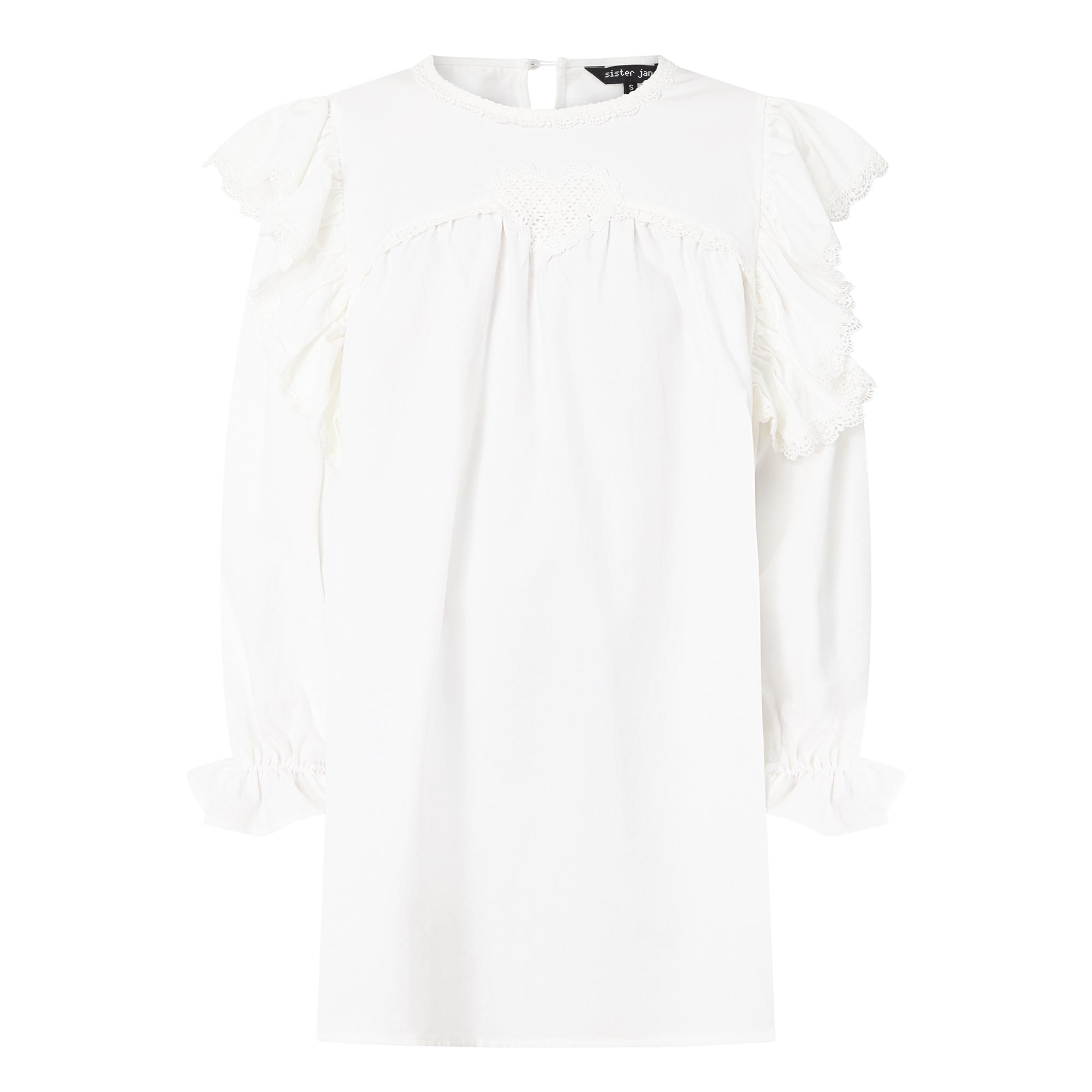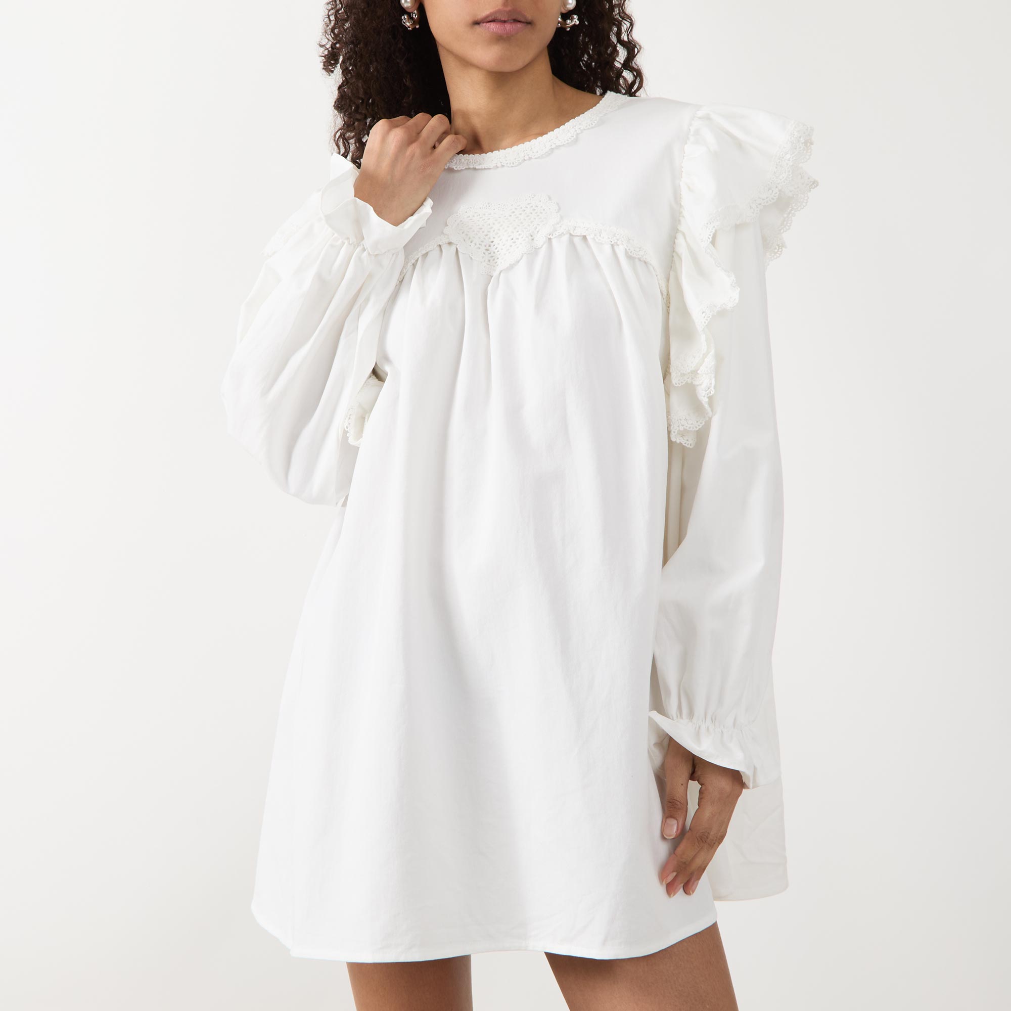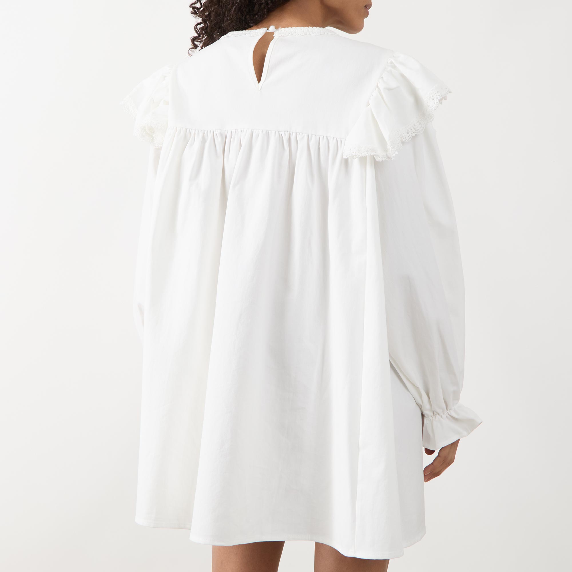 - Round neckline, rear keyhole and button fastening, gathered ruffle trim detailing around the shoulders, long sleeves, elasticated flared cuffs, curved yoke seam, flared hem, mini length