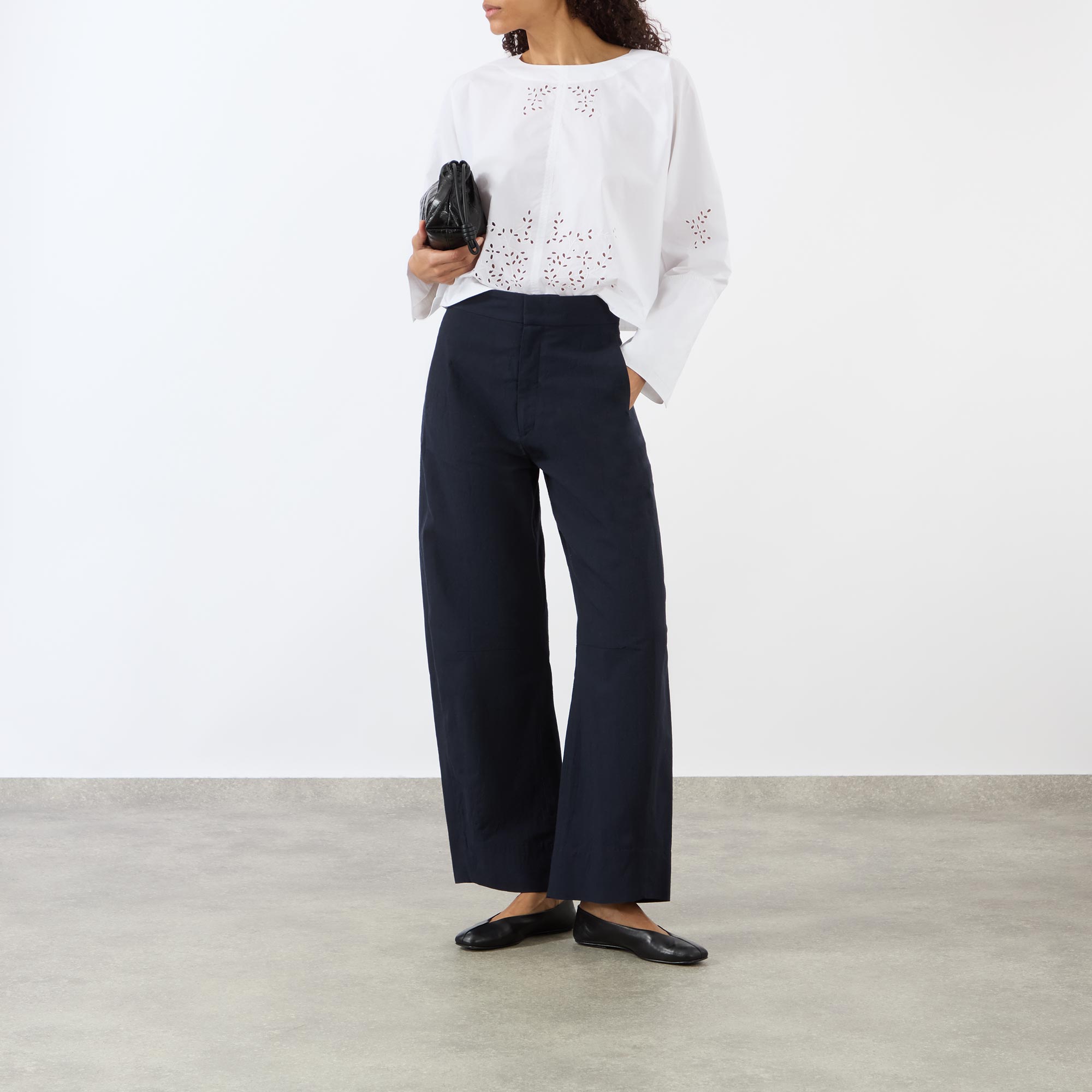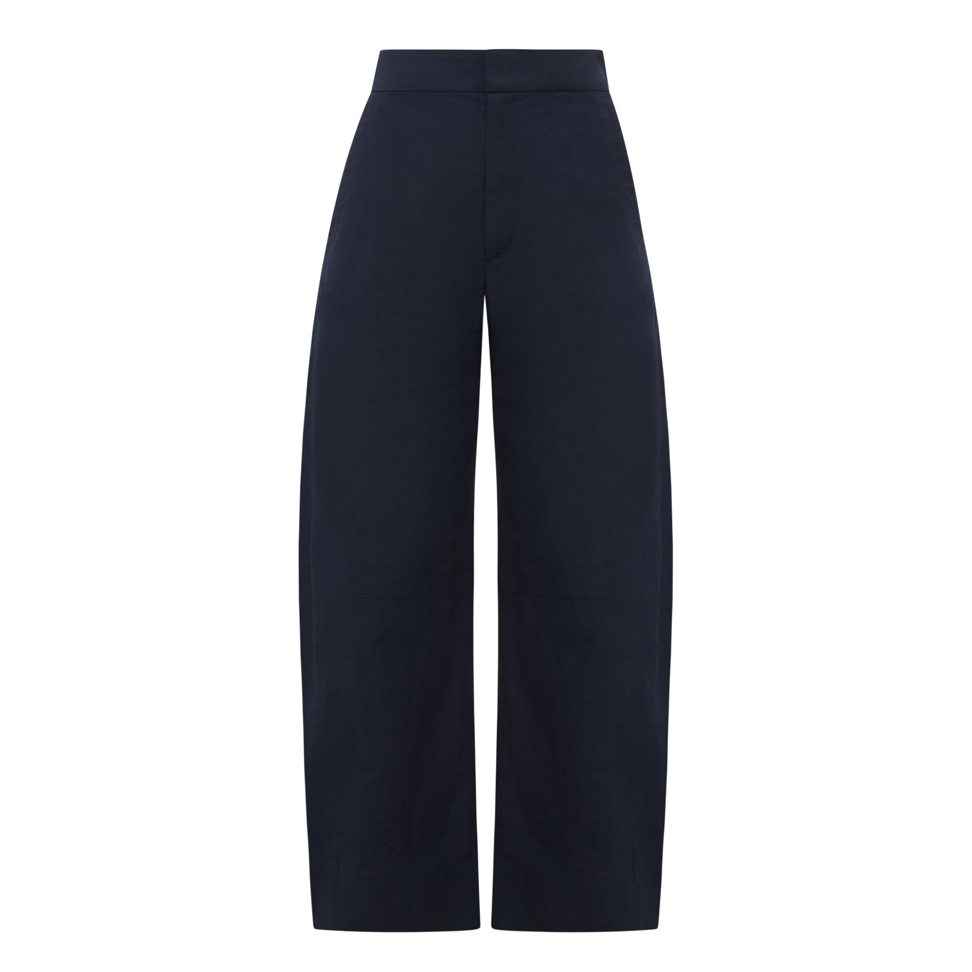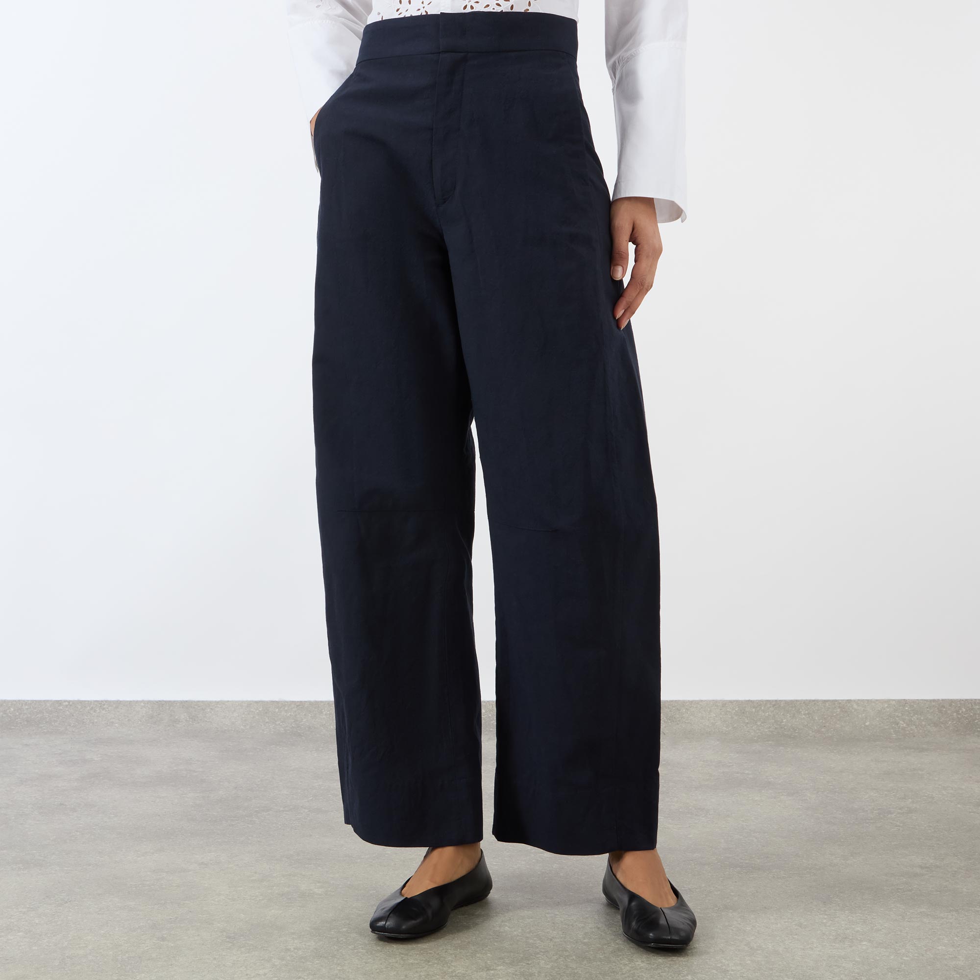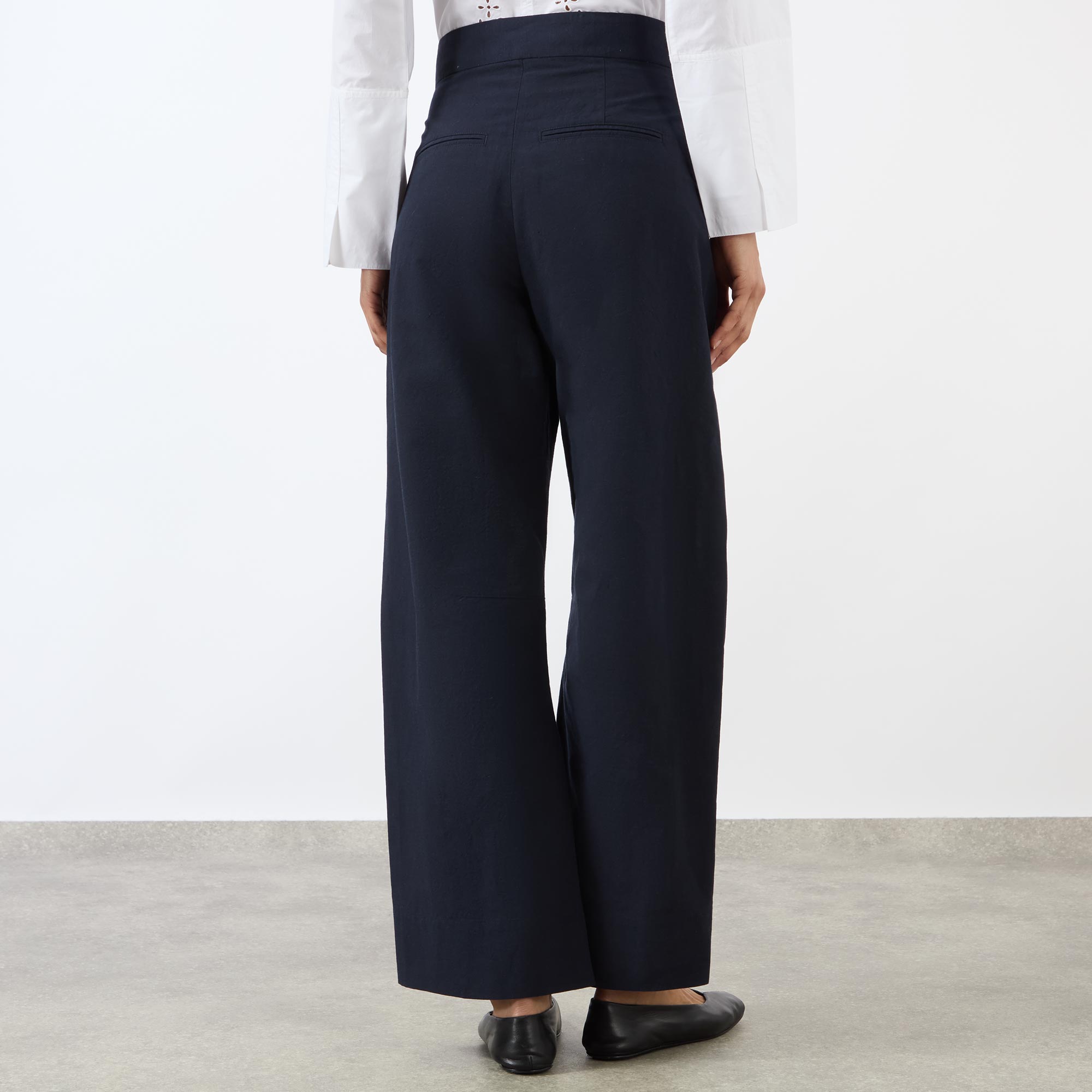 - High rise, barrel leg, covered waistband, concealed fly with hook and bar fastening, two side entry pockets, two rear welt pockets, darting at the knees, clean hems, crêpe finish
