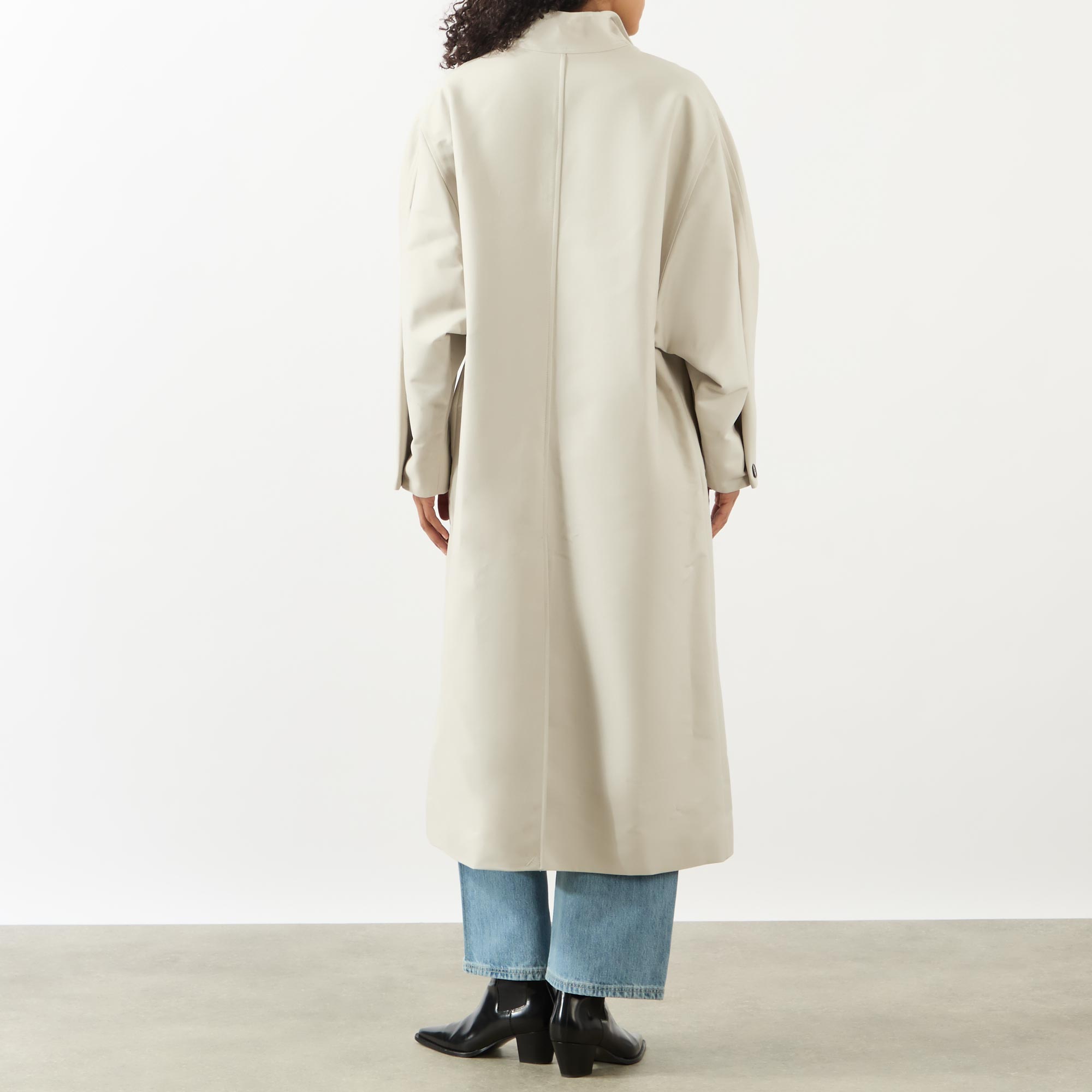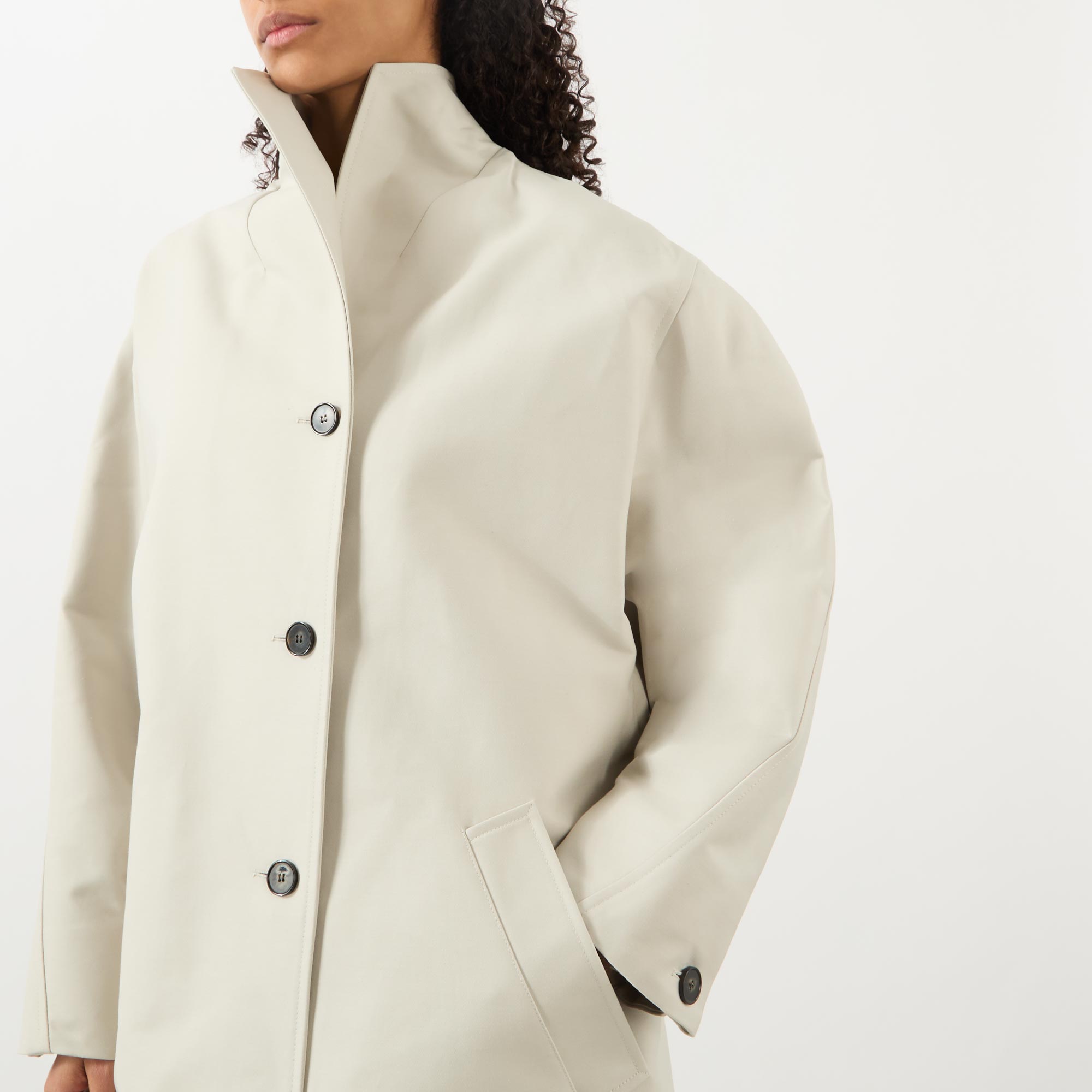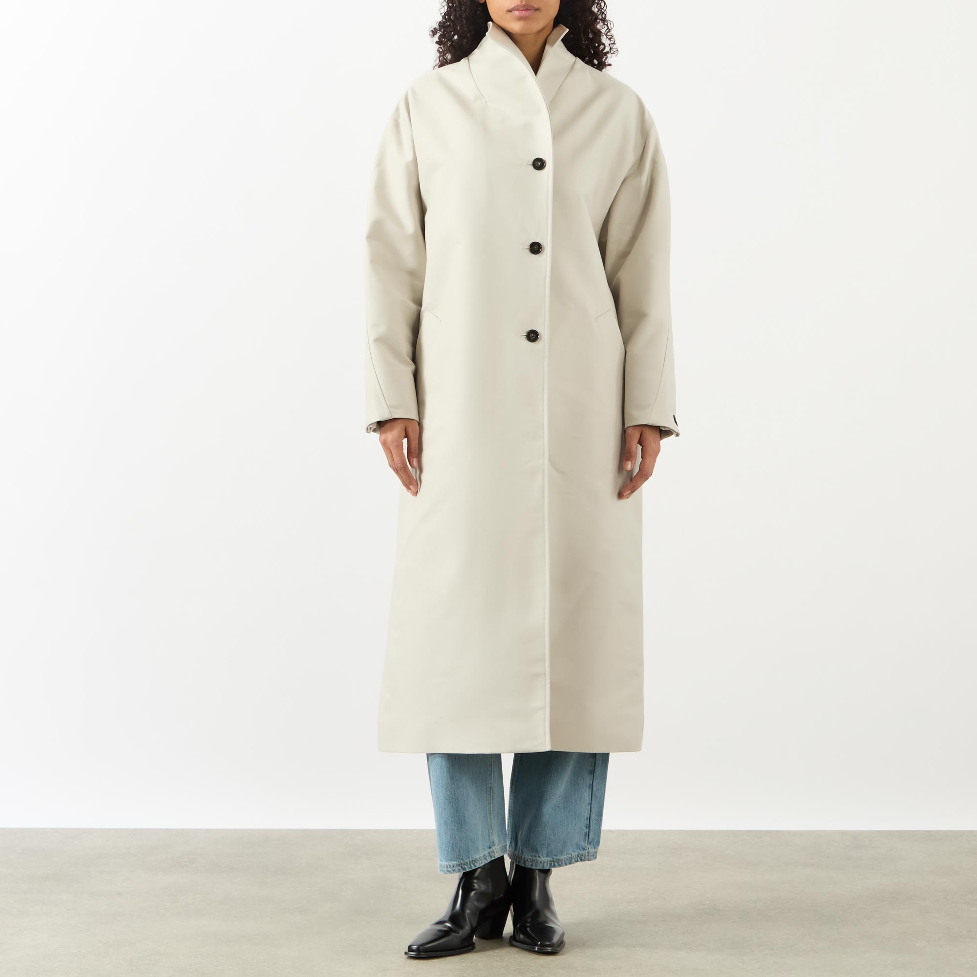 - High collar, dropped shoulders, long sleeves, buttoned cuffs, off-centre button fastening, two front welt pockets, straight hem, double sateen finish, longline design