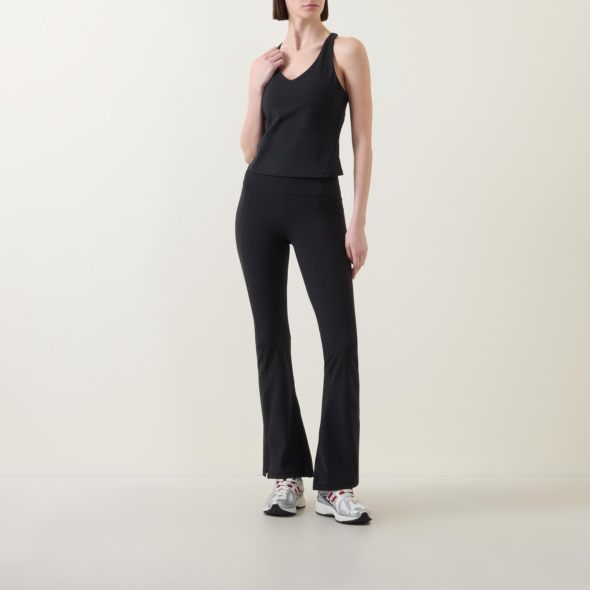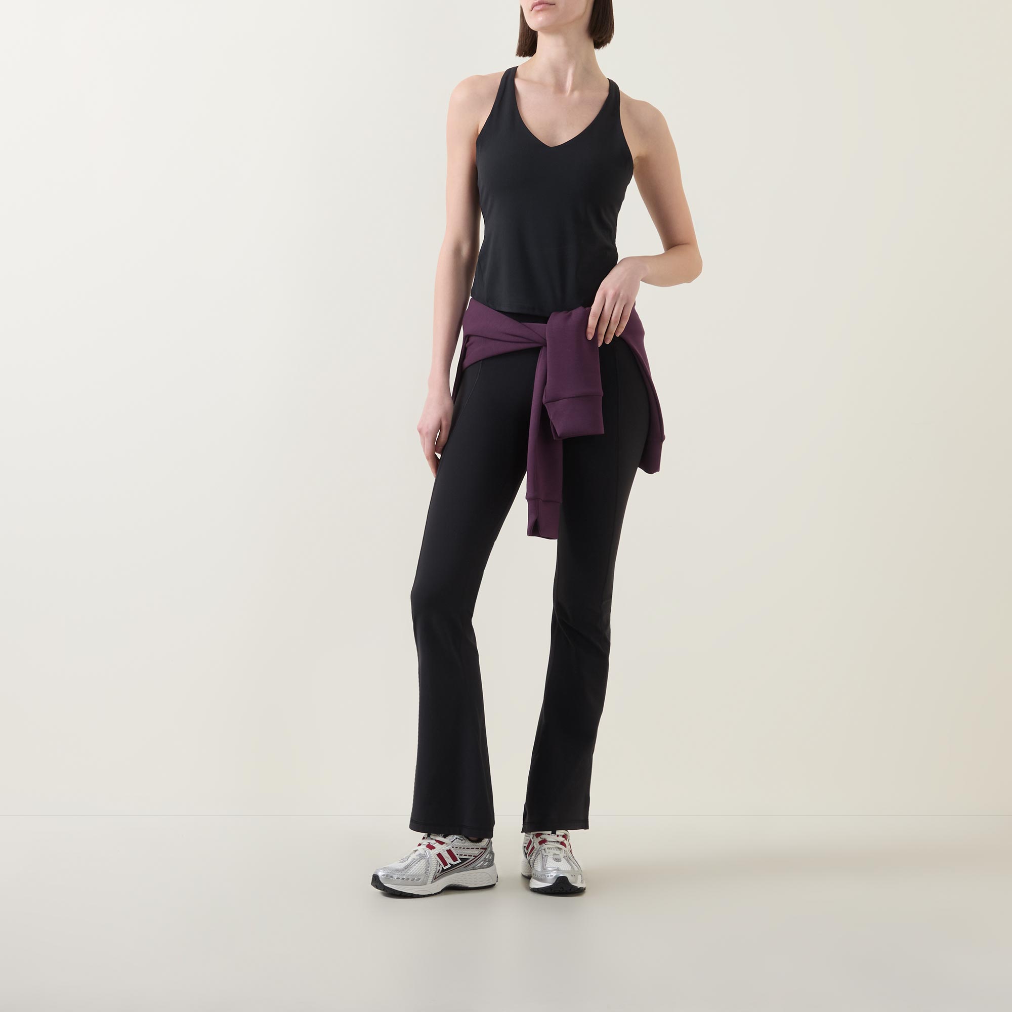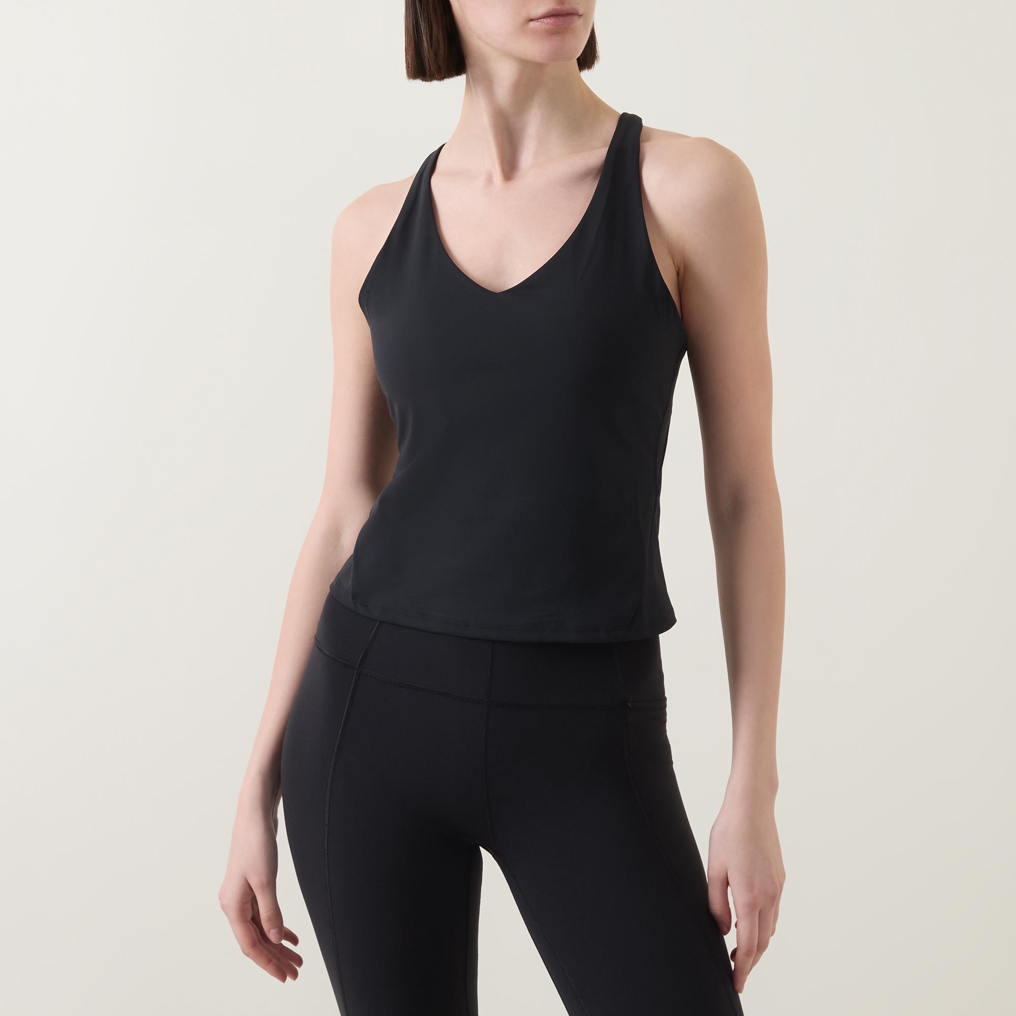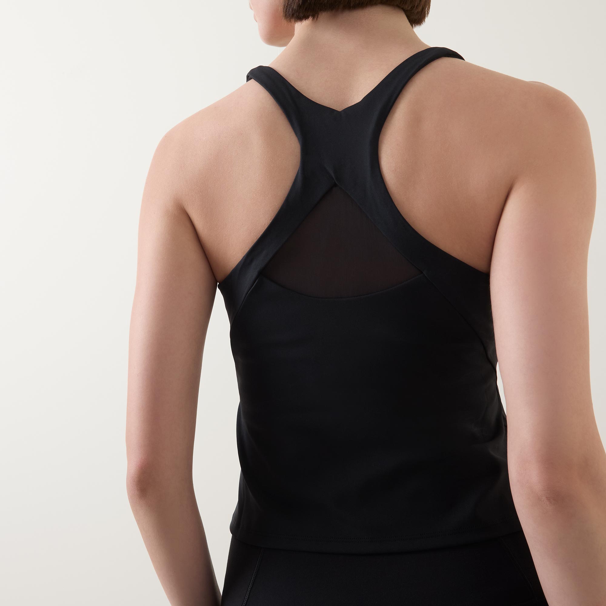 - V-neckline, tank-style, sleeveless, built in shelf bra, mesh back detail, straight hem, tonal stitching, smooth finish