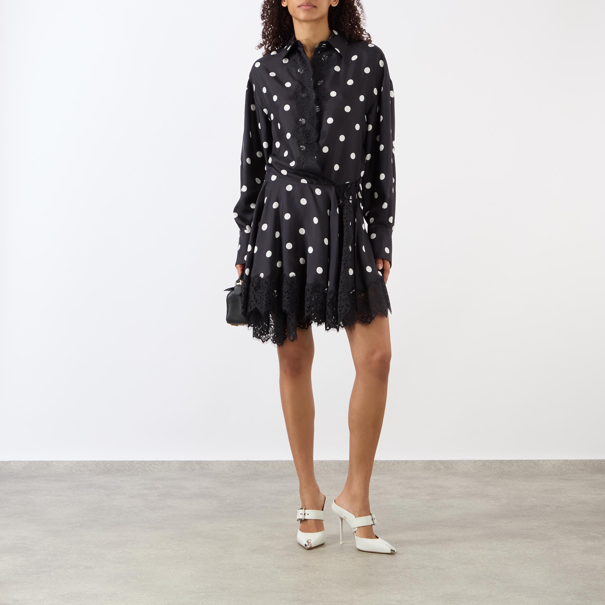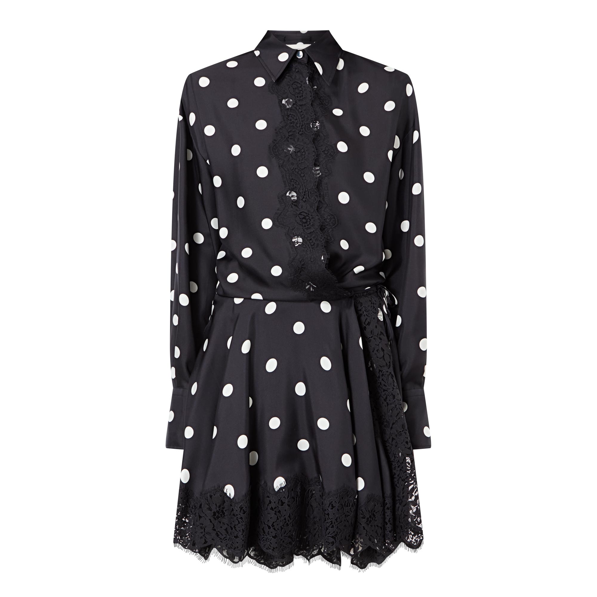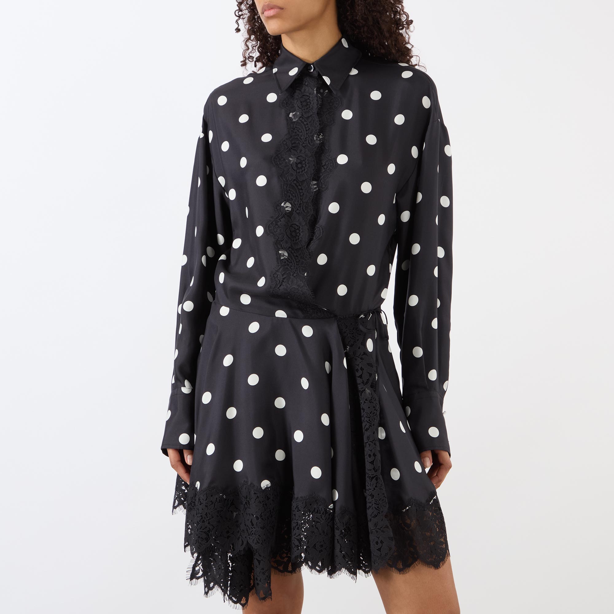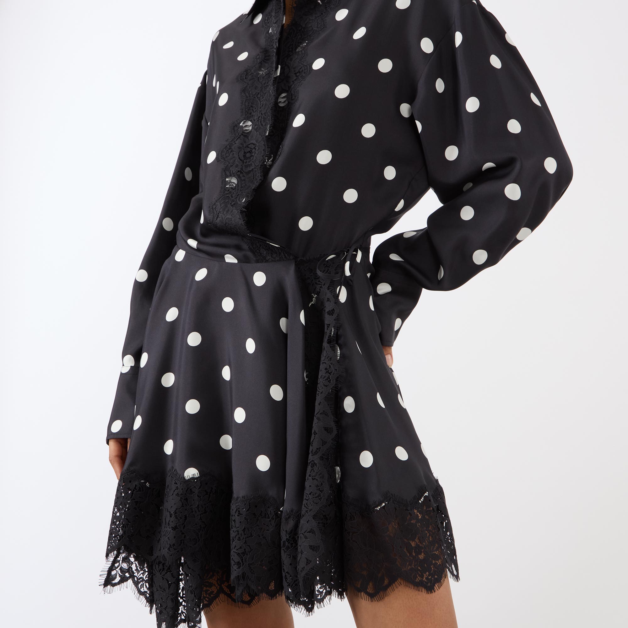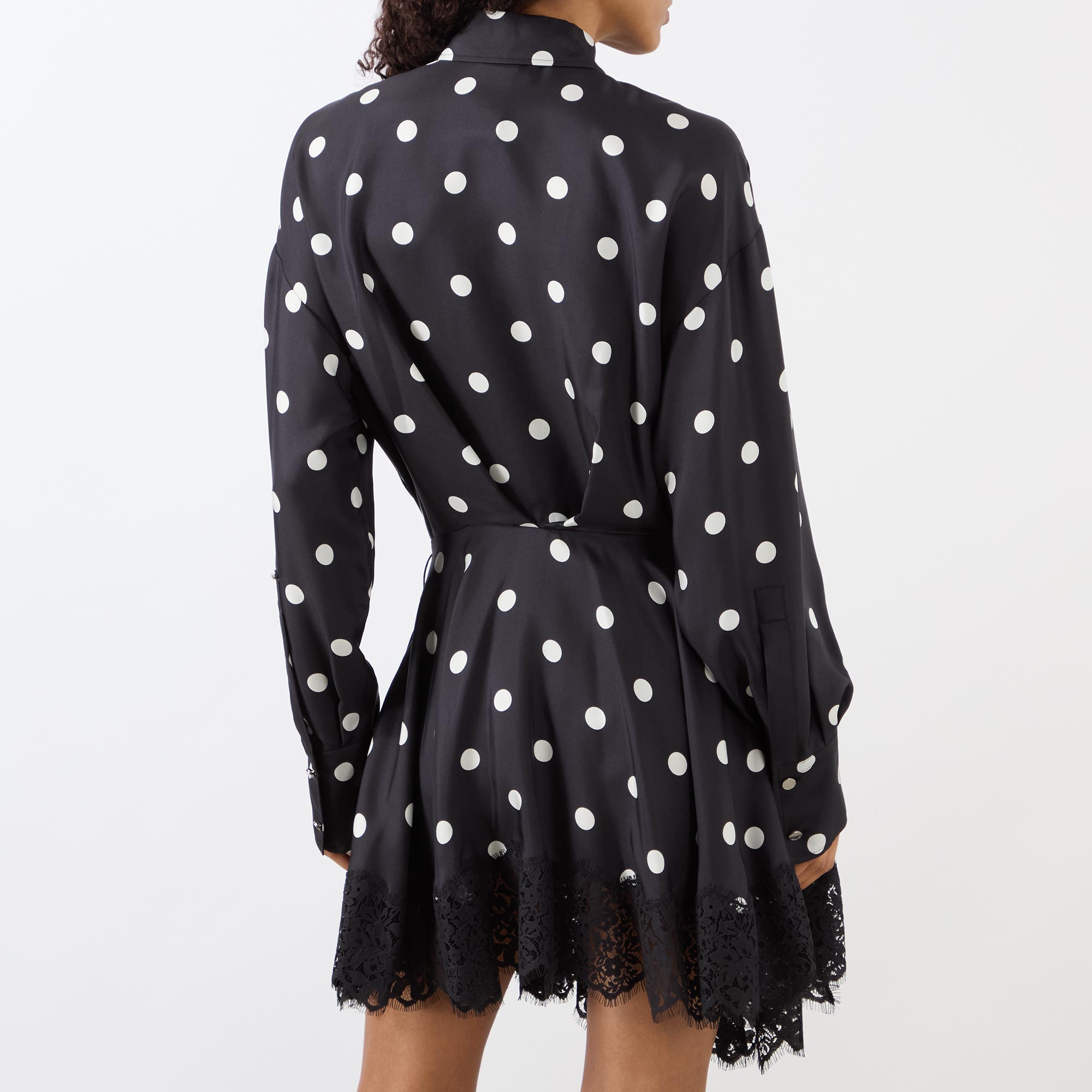 - Pointed collar, concealed button fastening, self-tie belt, belt loops, long blouson-style sleeves, buttoned cuffs, mini length, asymmetric hemline, polka dot pattern, lace embellishment, reverse pleat to the back